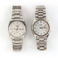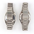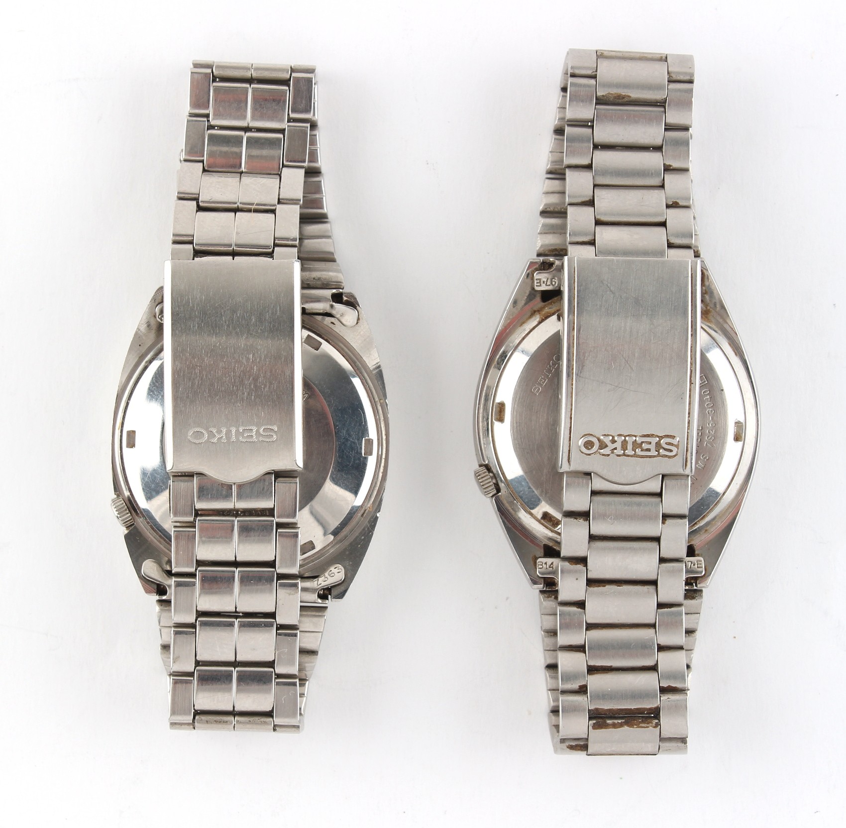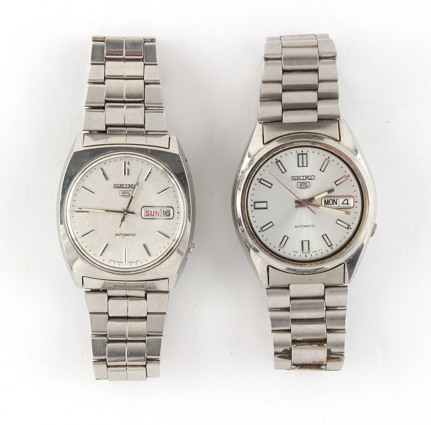 Property of a deceased estate, a private collection of watches - two gentleman's Seiko 5 automatic stainless steel cased wristwatches, both appear to be working but no guarantees are given, both on original Omega stainless steel bracelet straps with deployant clasps (2).