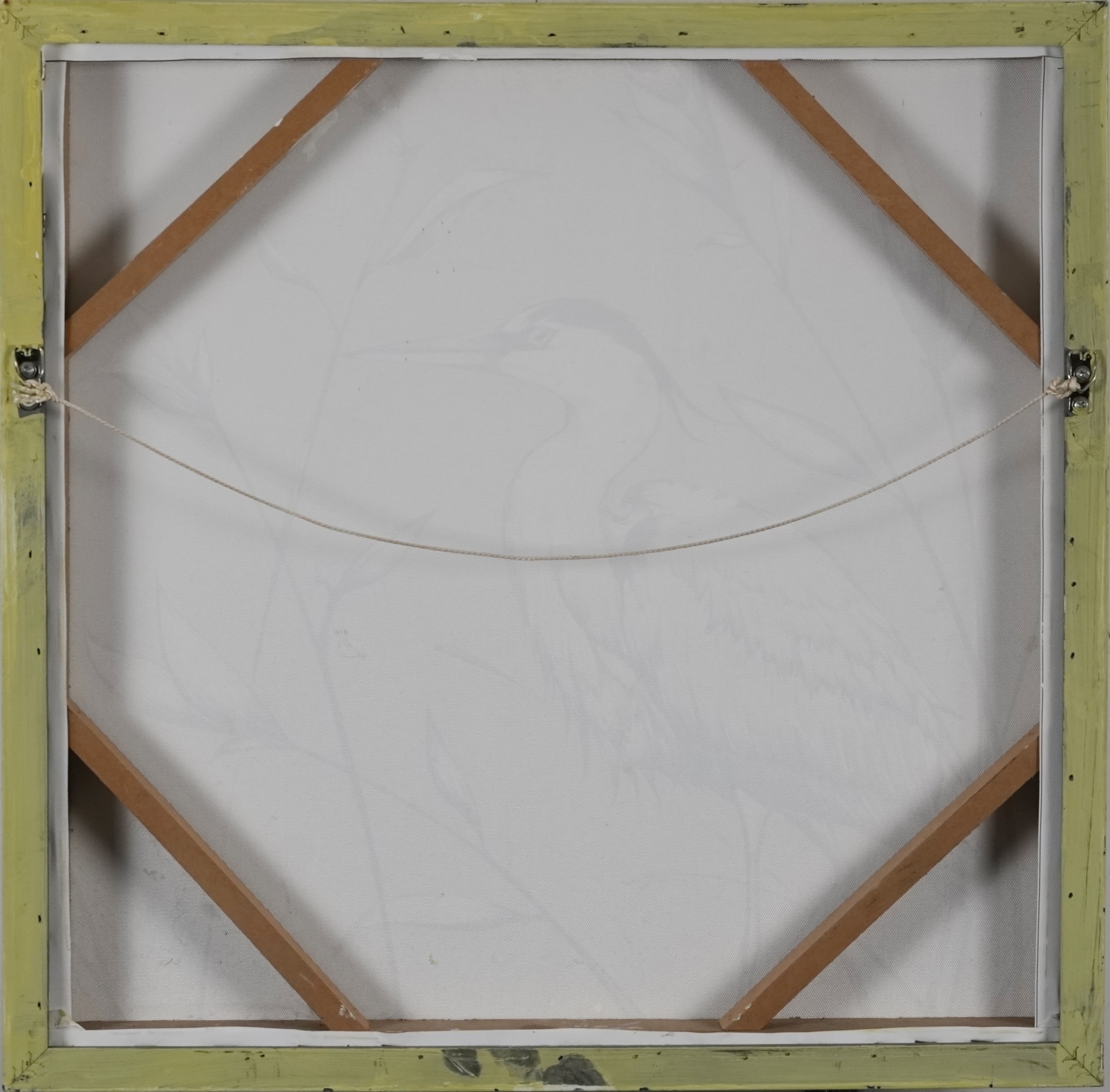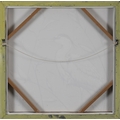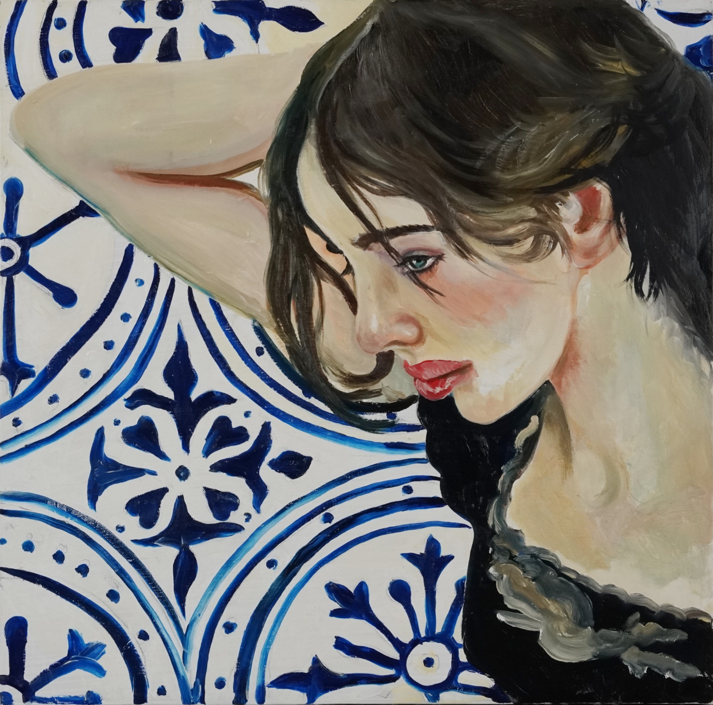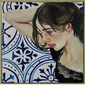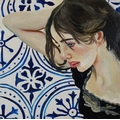 Clive Fredriksson - Portrait of a female lying on blue and white tiles, Modern British school oil on canvas, framed, 48cm x 48cm.