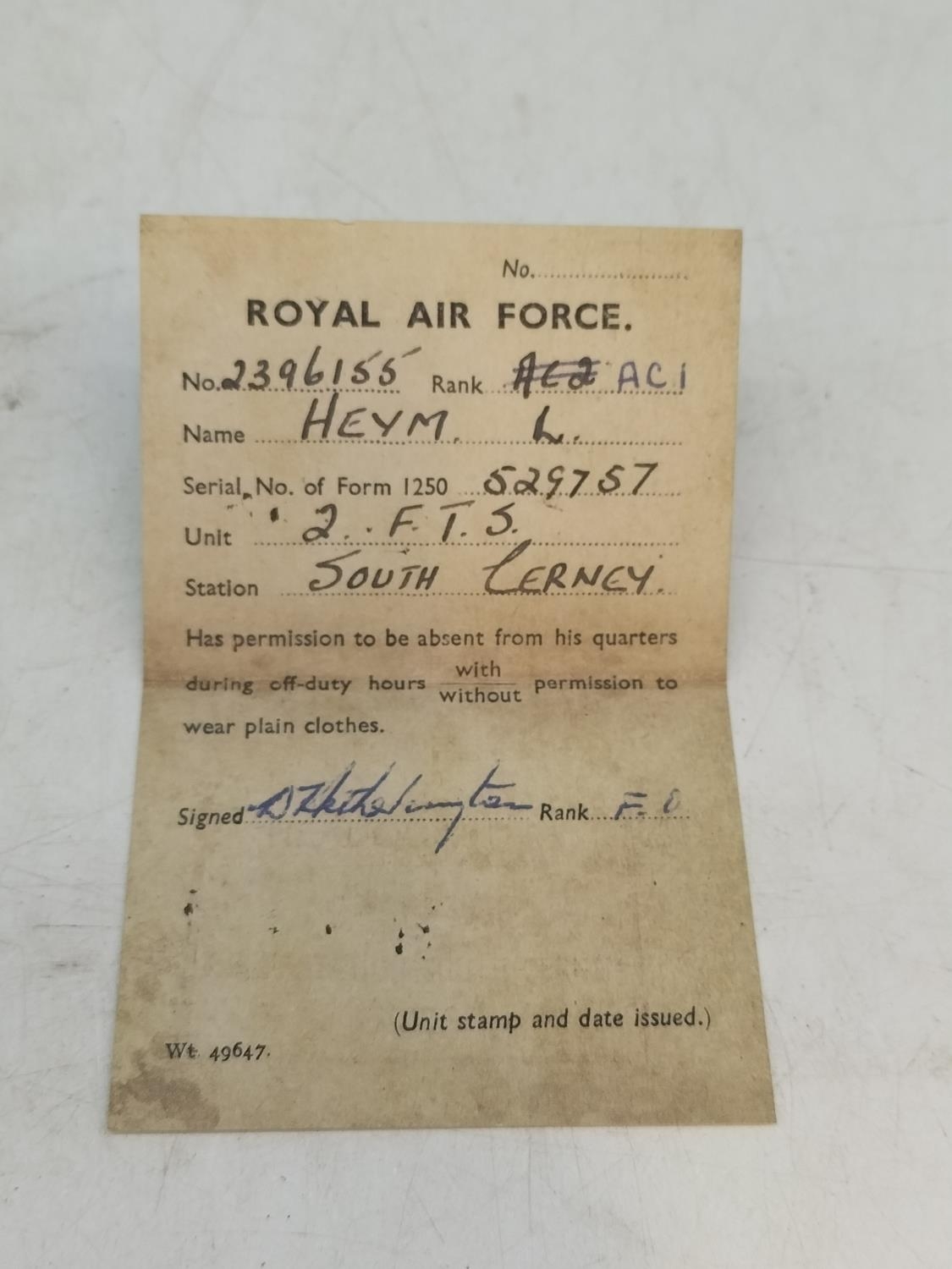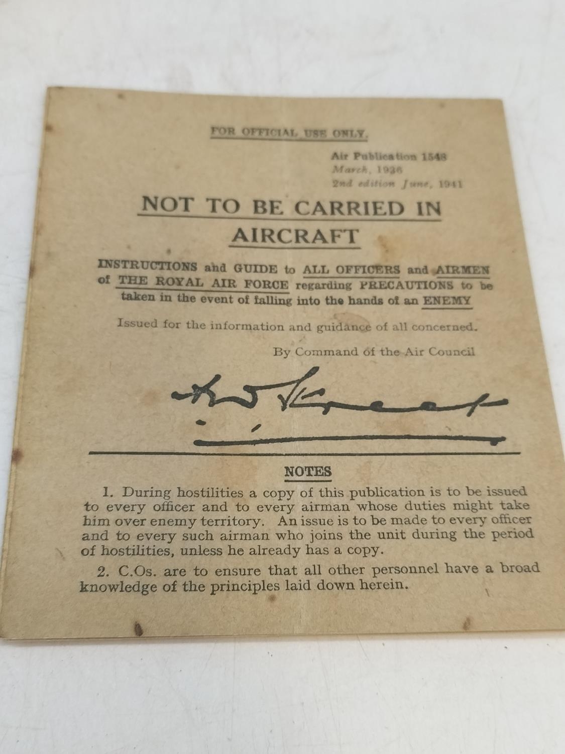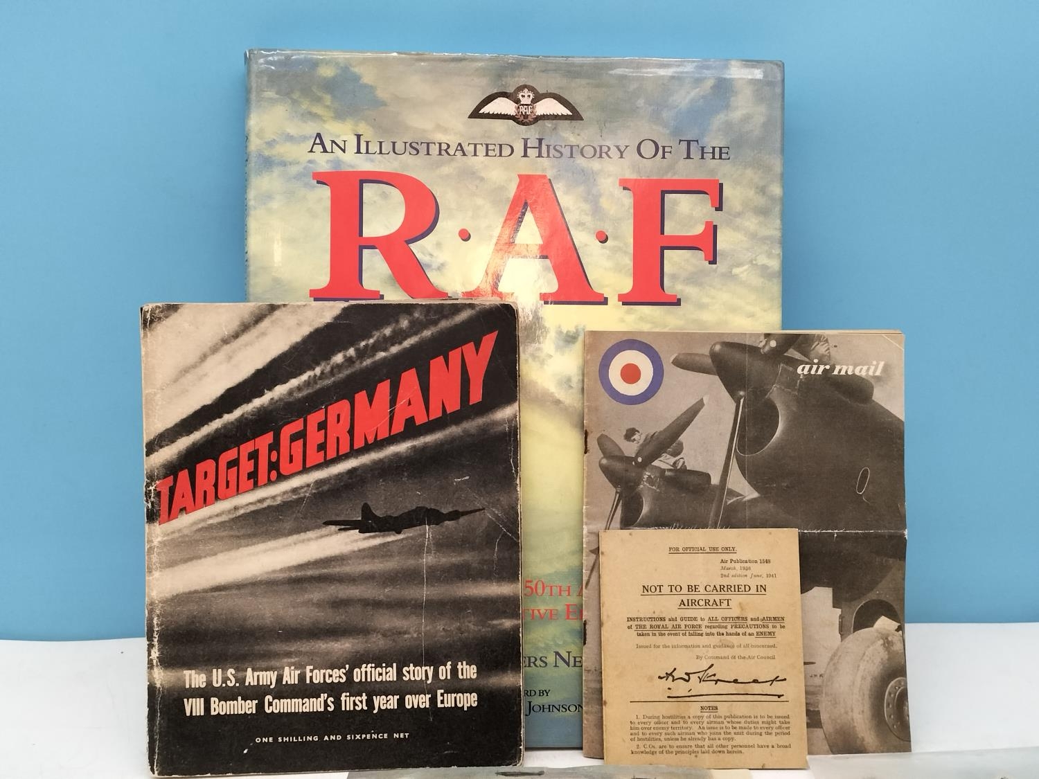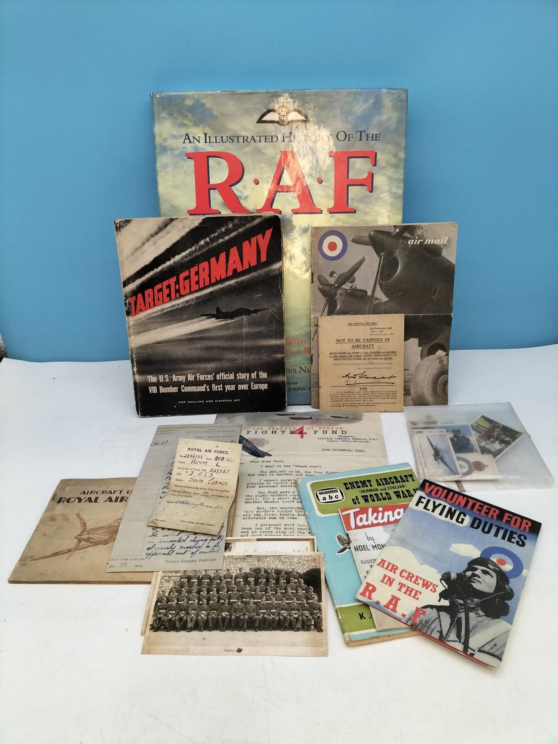 Good Collection of R.A.F WWII Ephemera to include Reproduction Pilot's Spitfire Flight Log, Base Pass and Bail Out Instructions plus History of the R.A.F Book, etc.