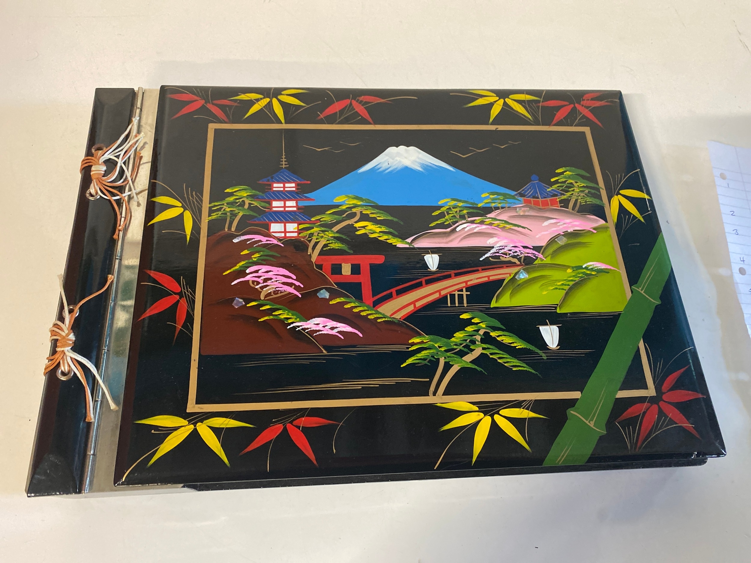 A Vintage Japanese Lacquered Photo Album, Decorated with Mount Fuji and Pagoda Landscape