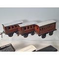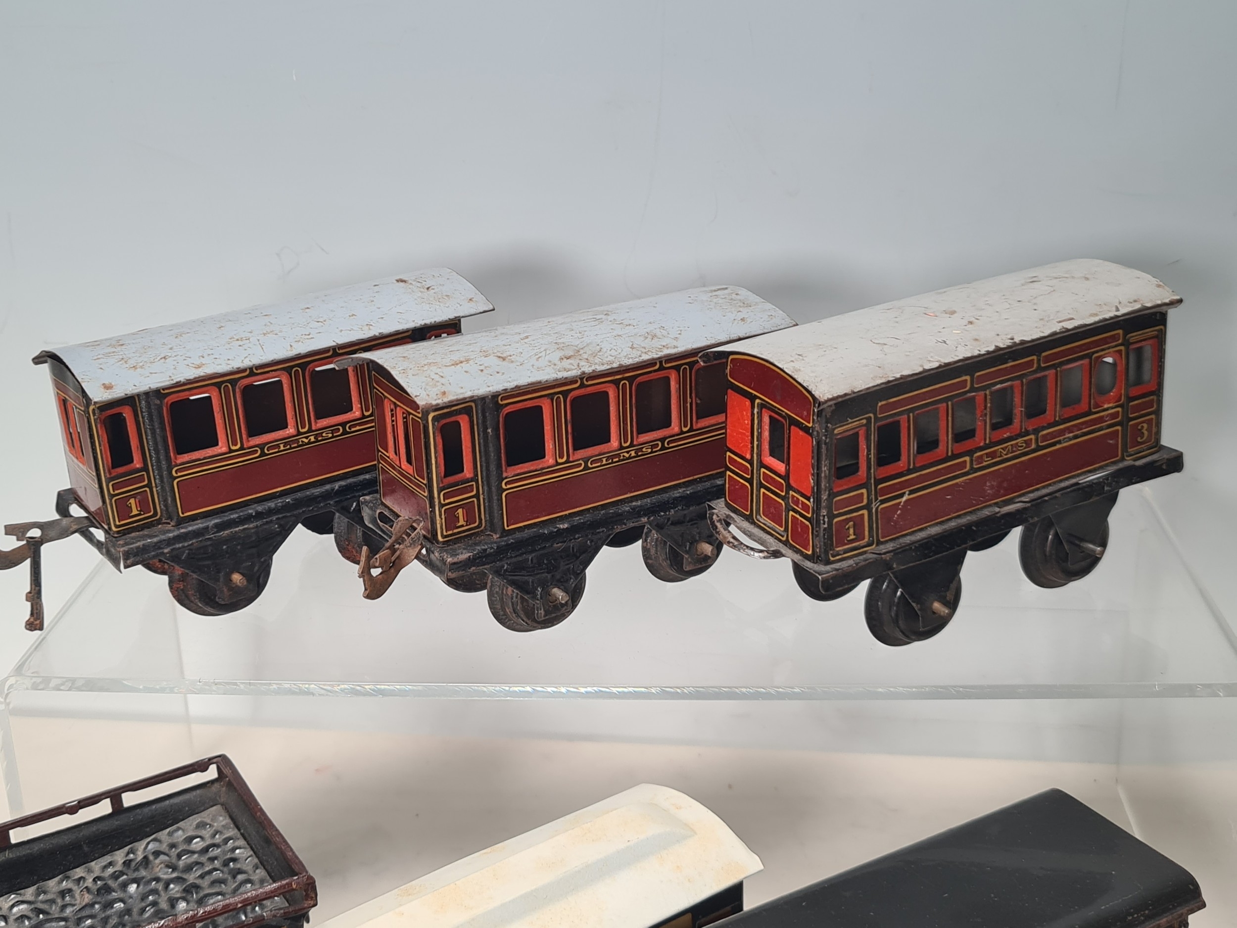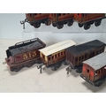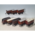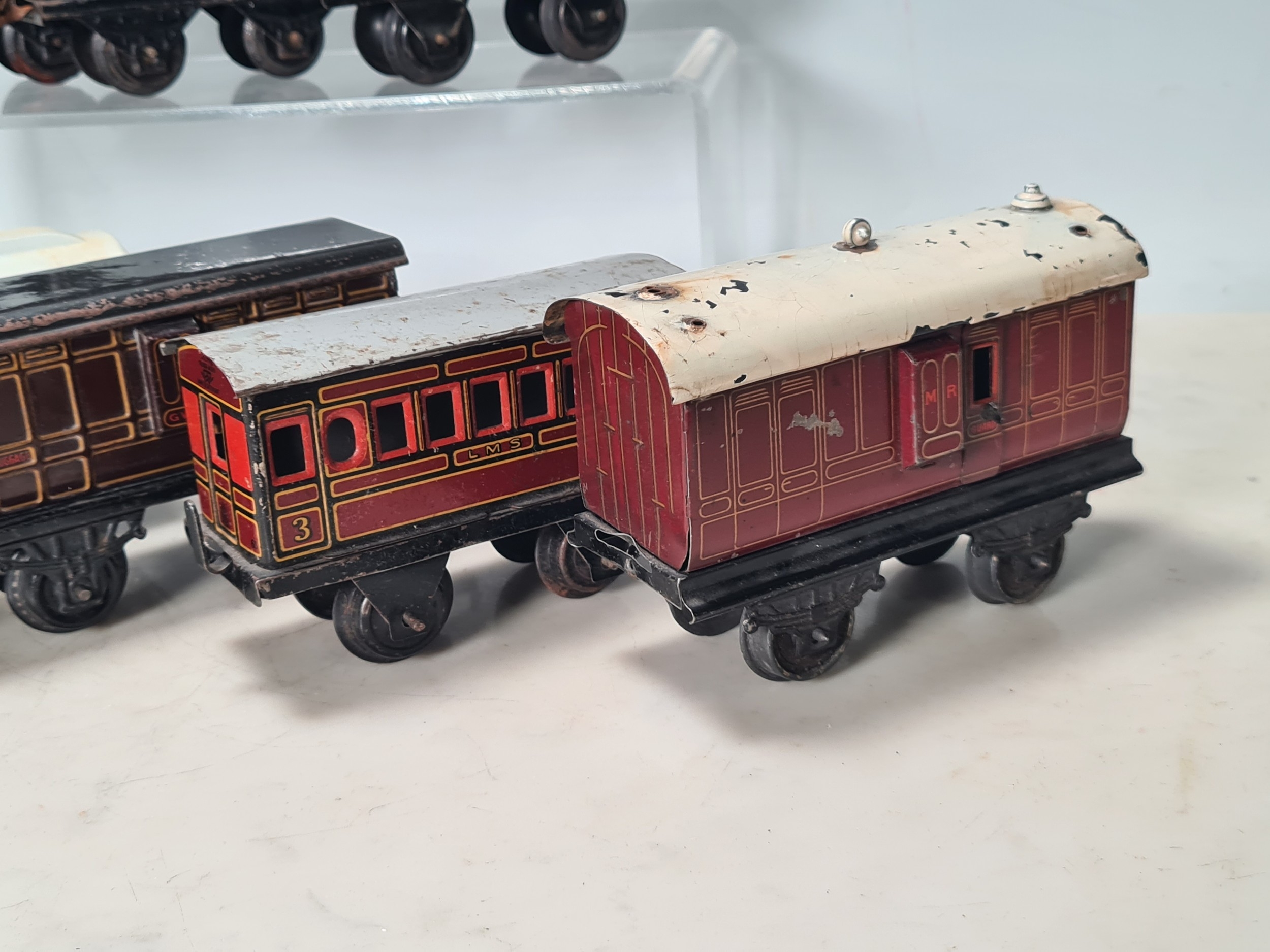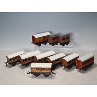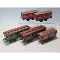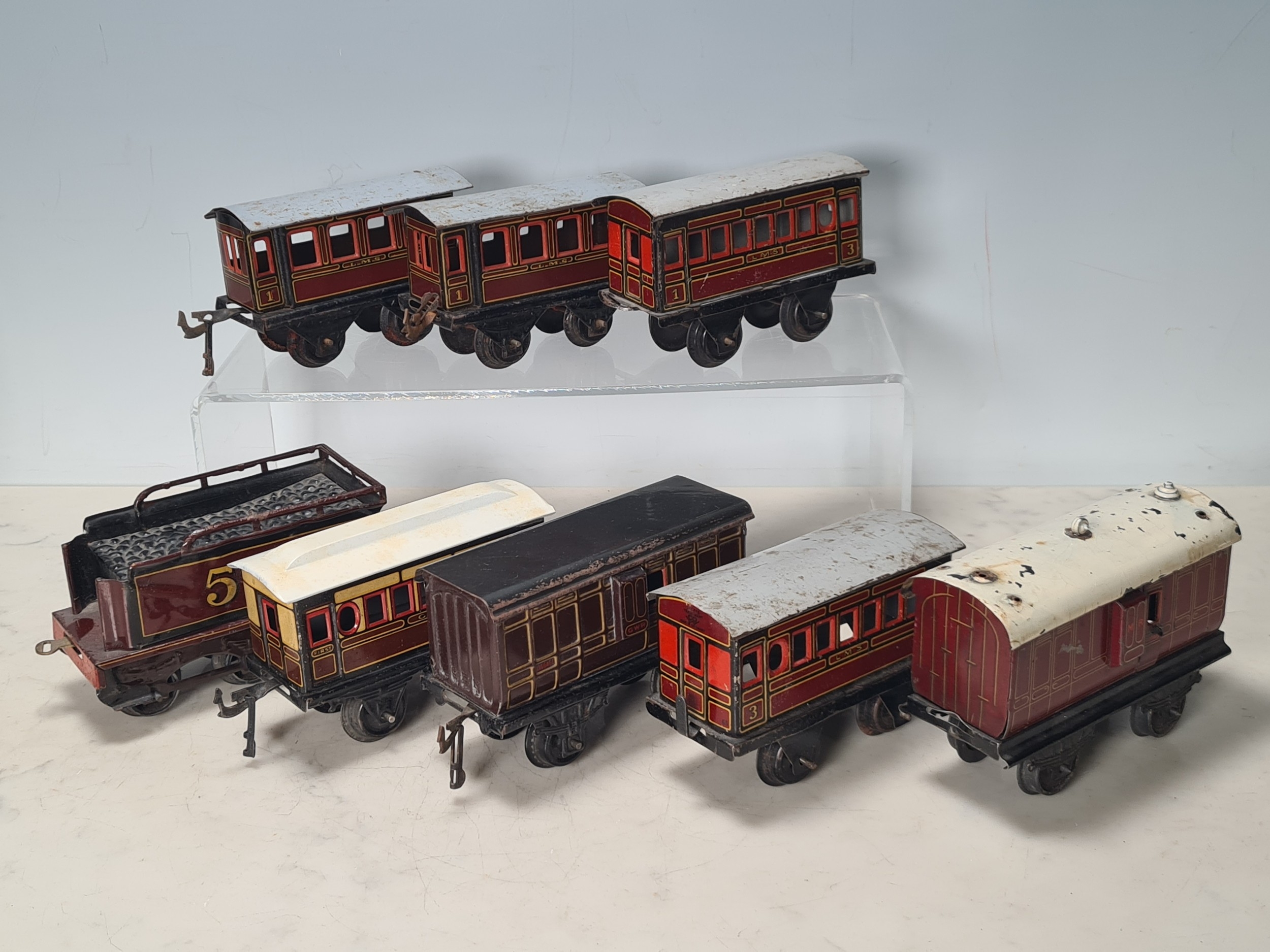 Five assorted German tinplate 0 gauge LMS 4-wheel Coaches and two GWR 4-wheel Coaches, together with a No.513 Tender