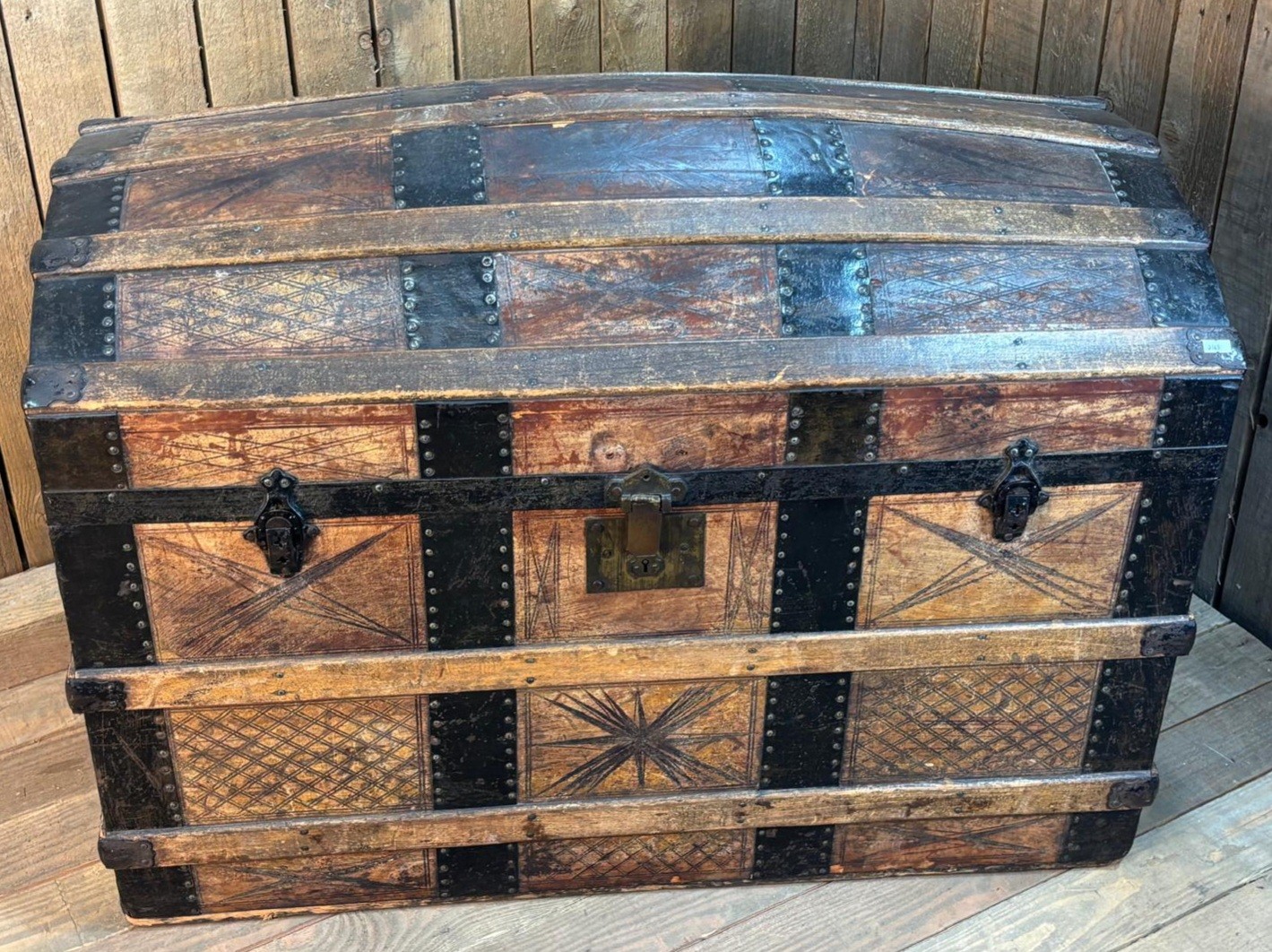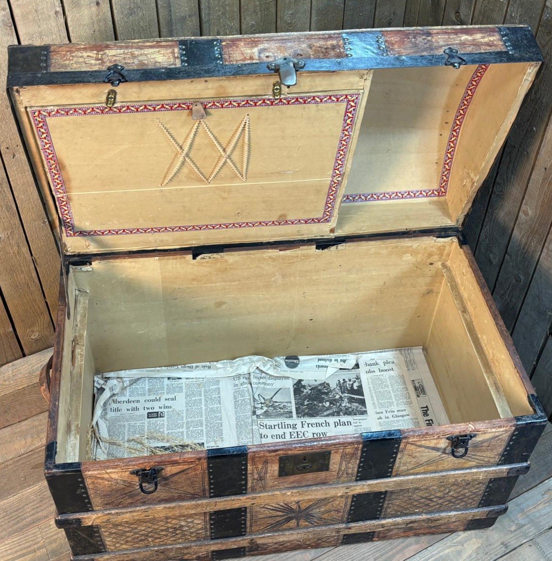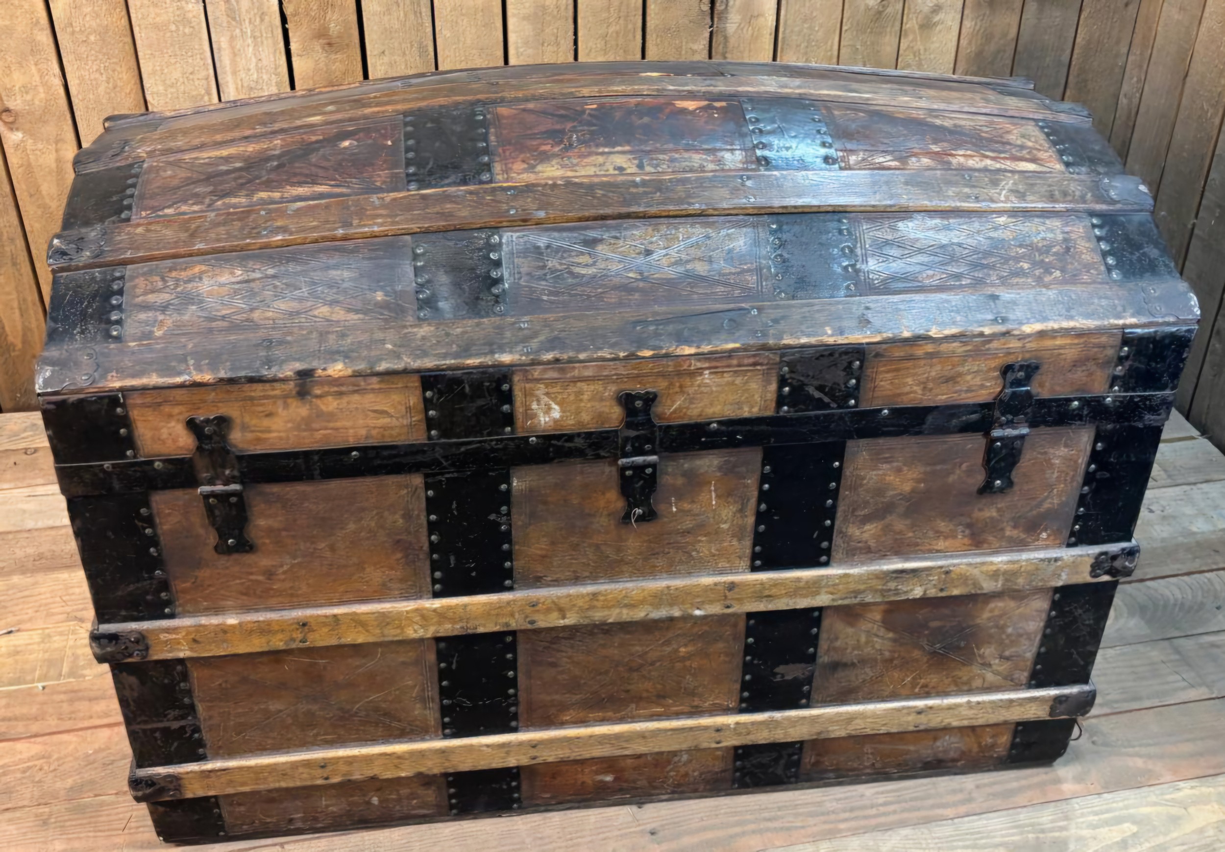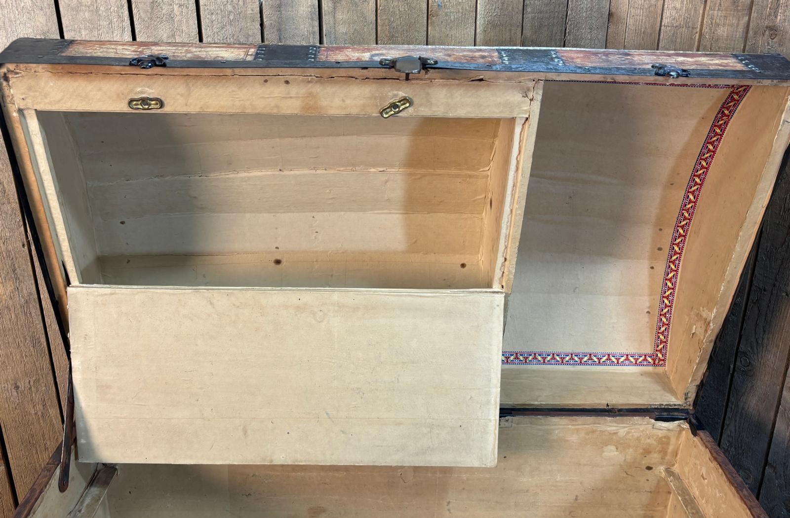 19th century Leather, wood and metal bound Saratoga travel trunk. Fitted storage to lid section.