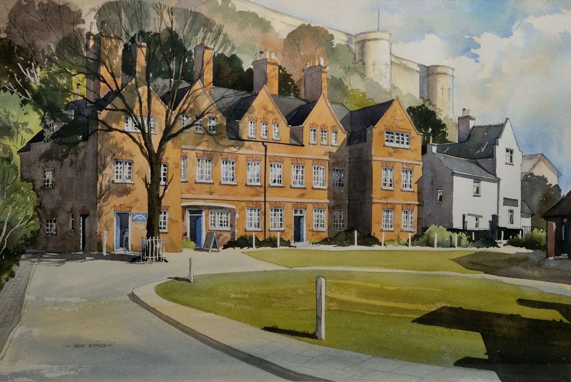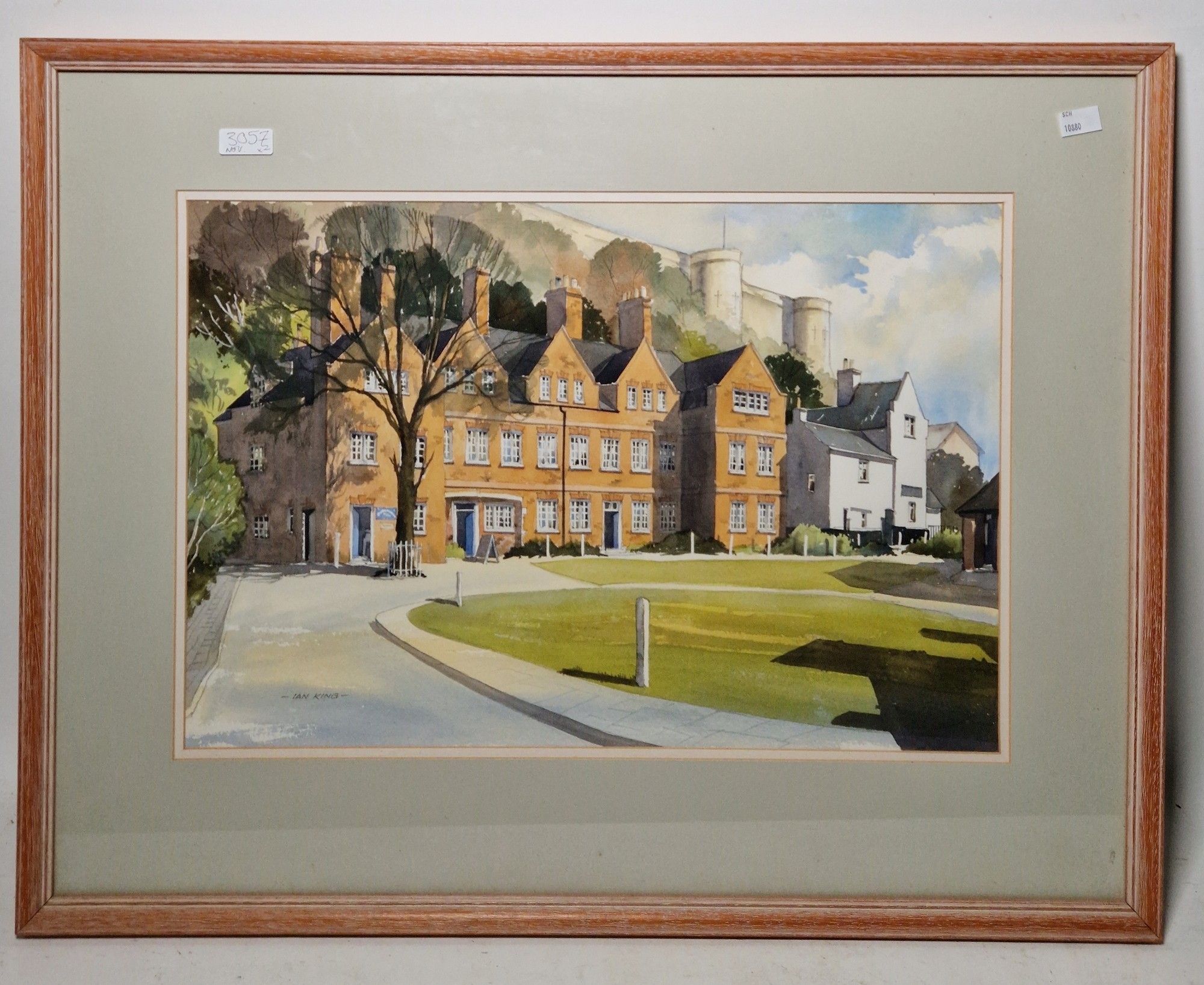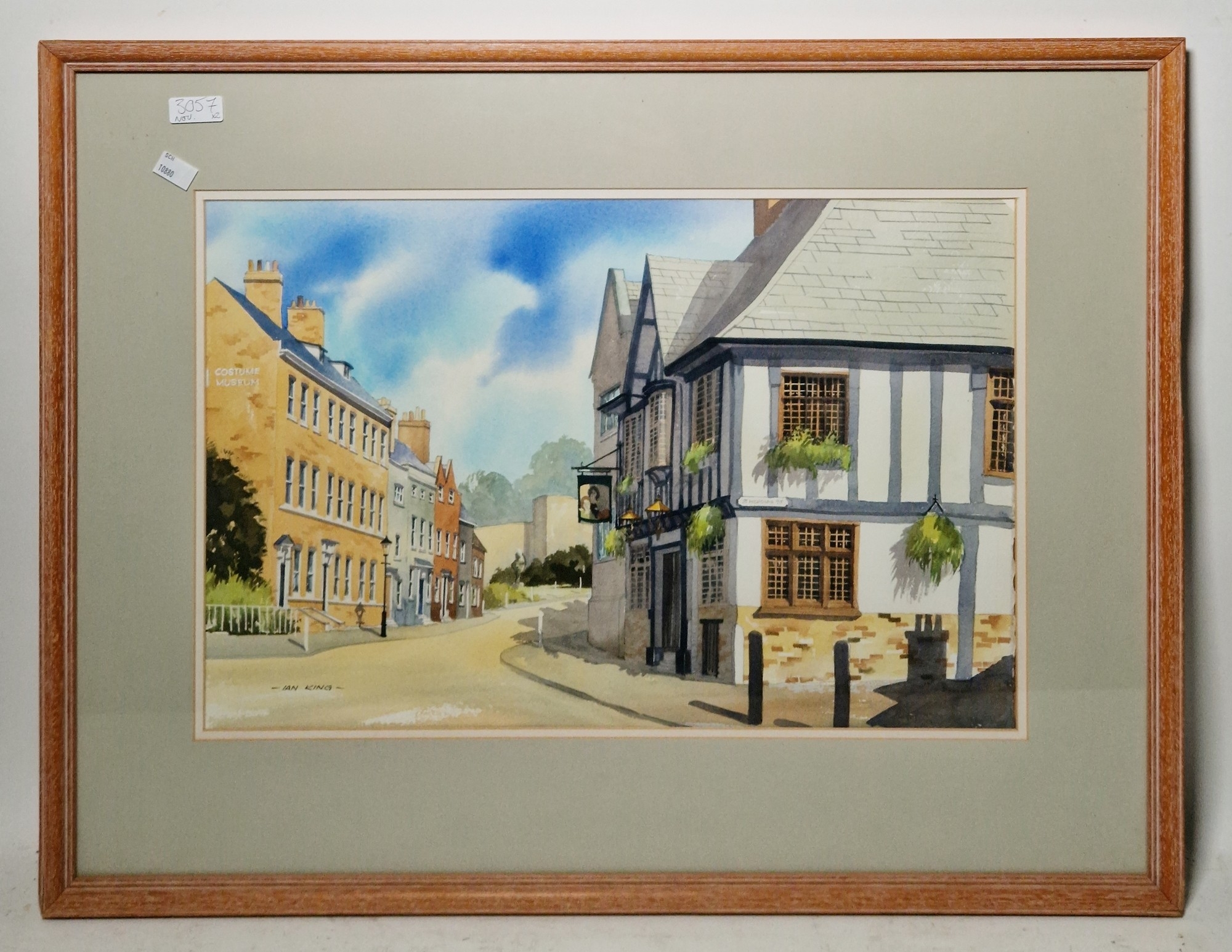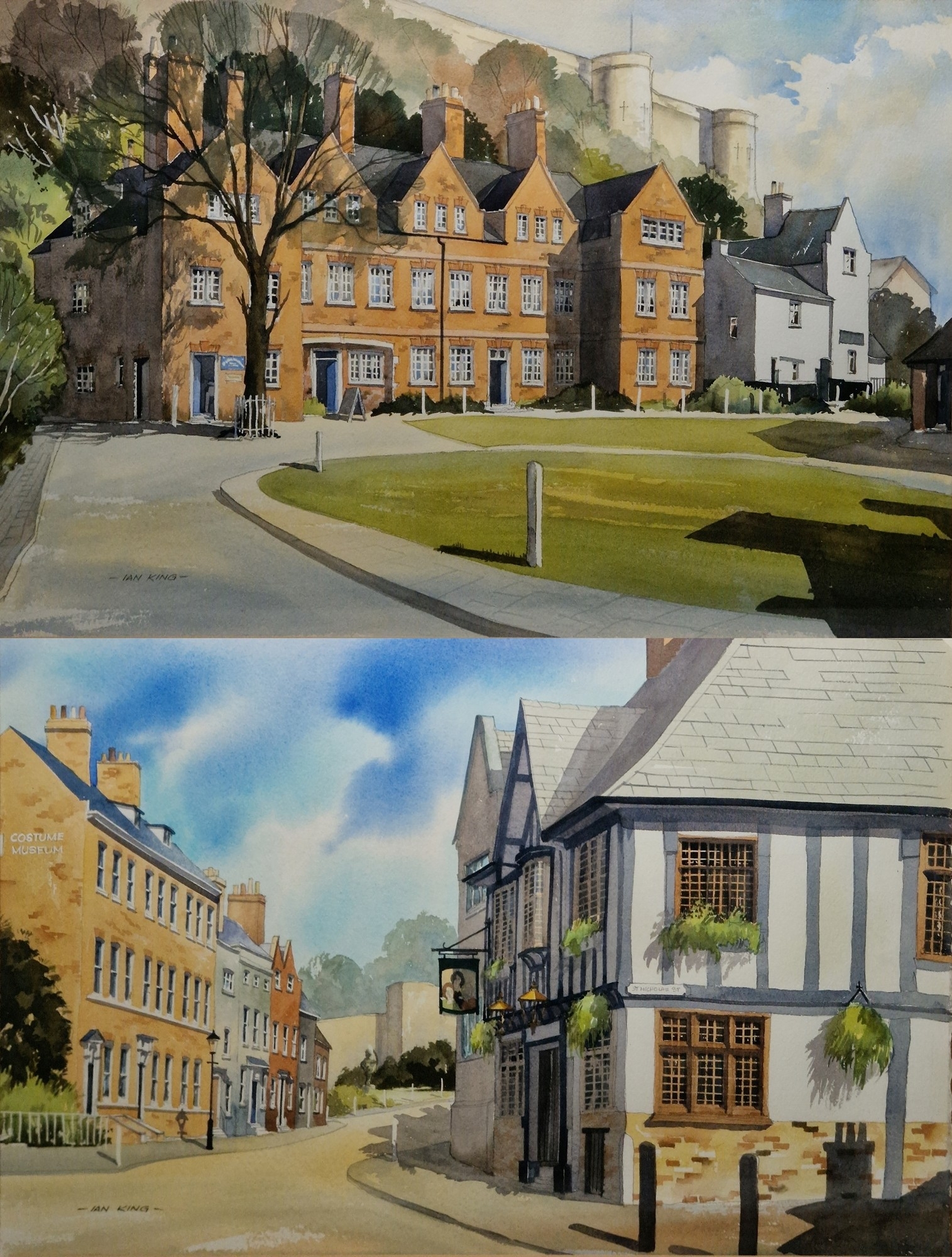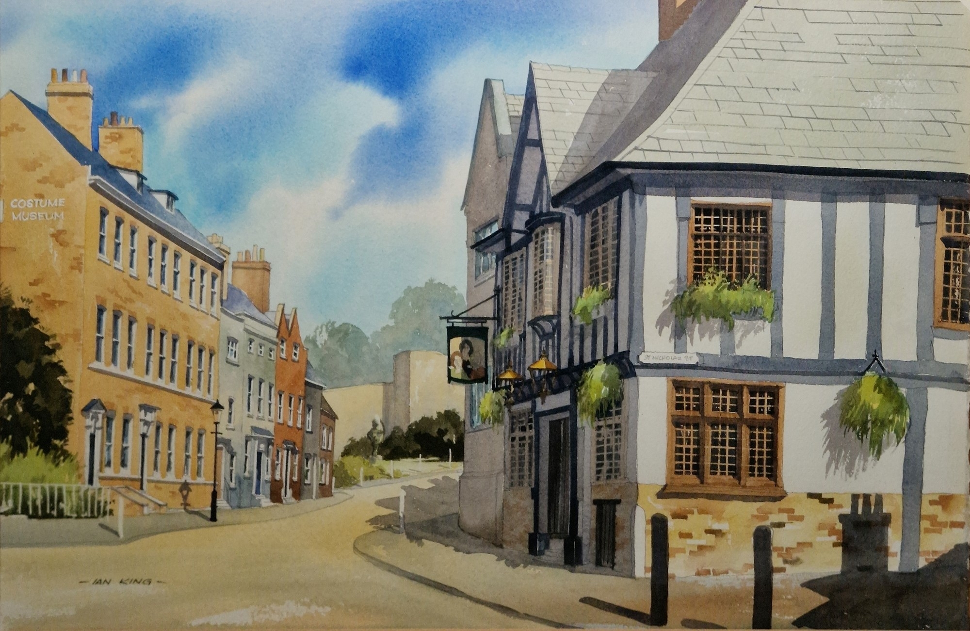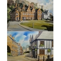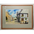 View of Brewhouse Yard Museum, Nottingham, signed lower left, framed and glazed, mount aperture 36.5cm x 54cm , together with another watercolour by the same hand of a village street, signed lower left, framed and glazed, mount aperture 35cm x 54cm (2)
