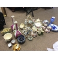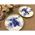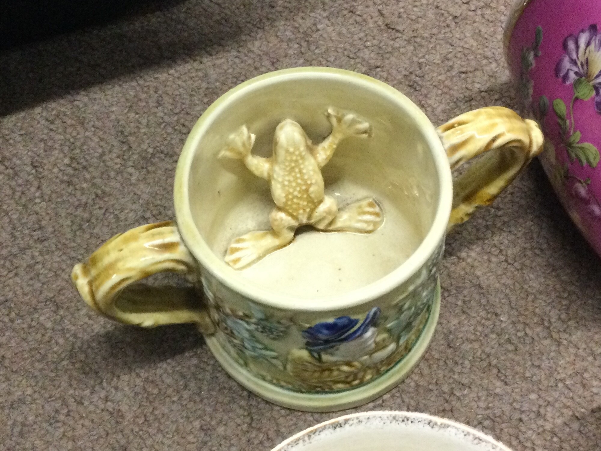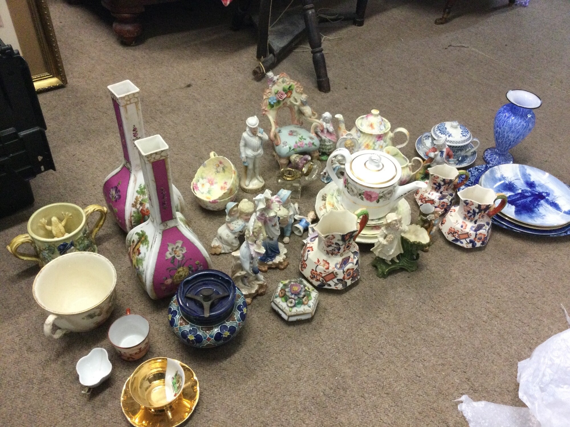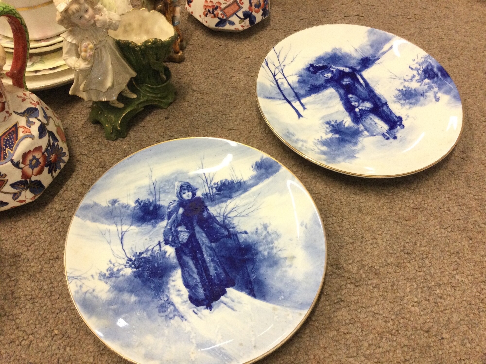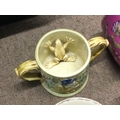A collection of ceramics including Royal Doulton blue children plates, classical figures and vases, Sunderland loving cup with frog