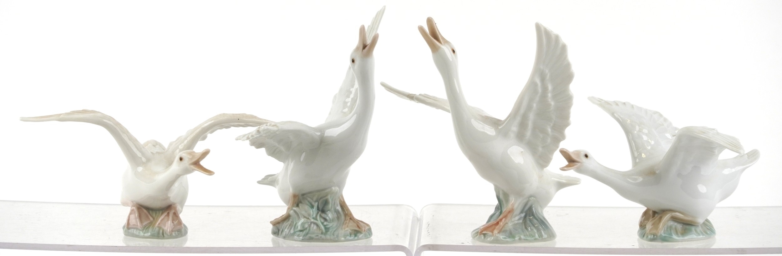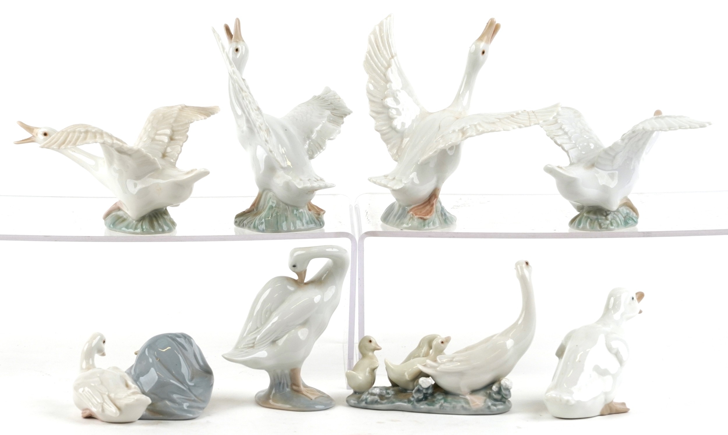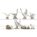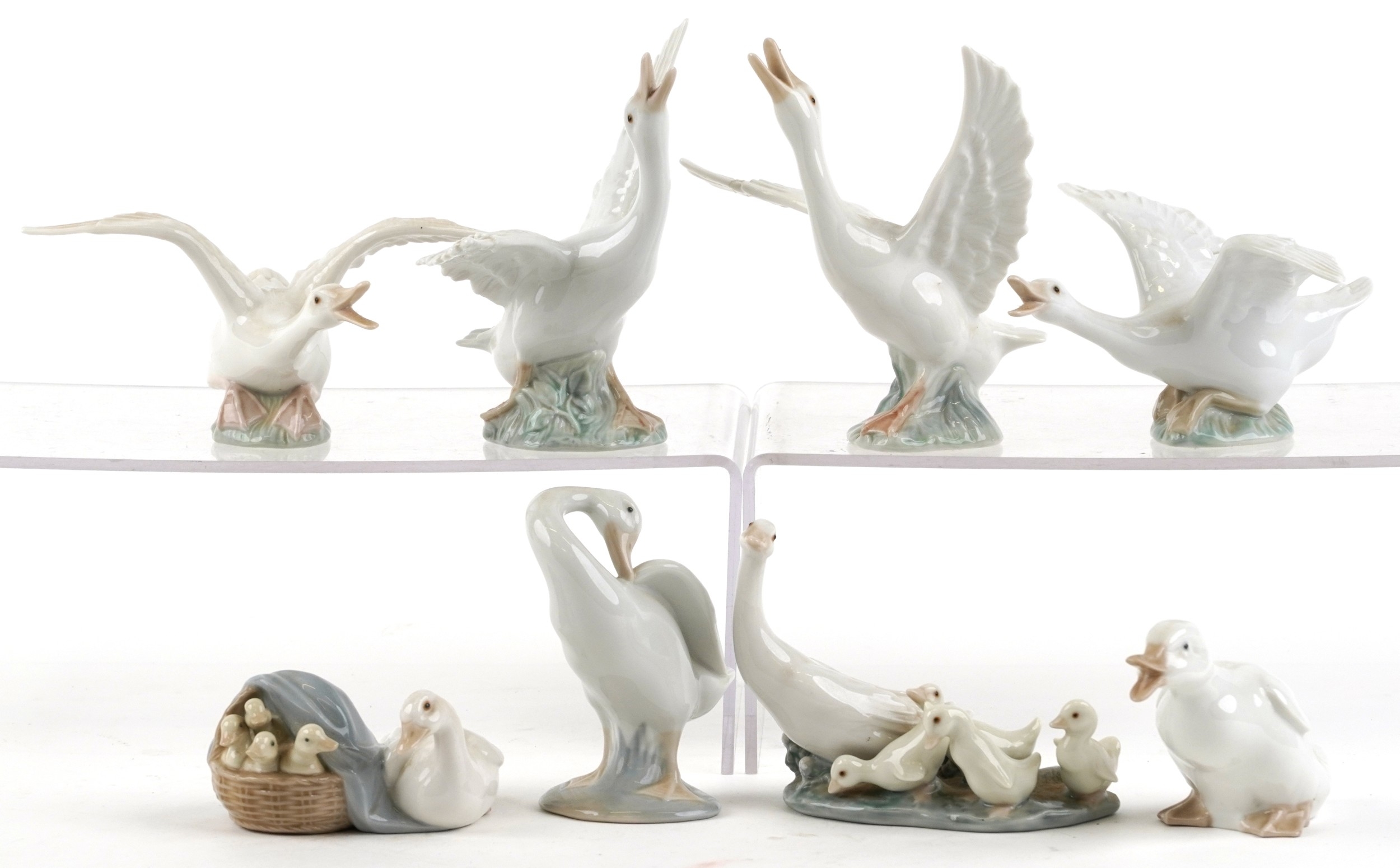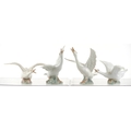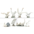 Eight Lladro porcelain models of geese including A-21F and A-20N, the largest 14cm high.