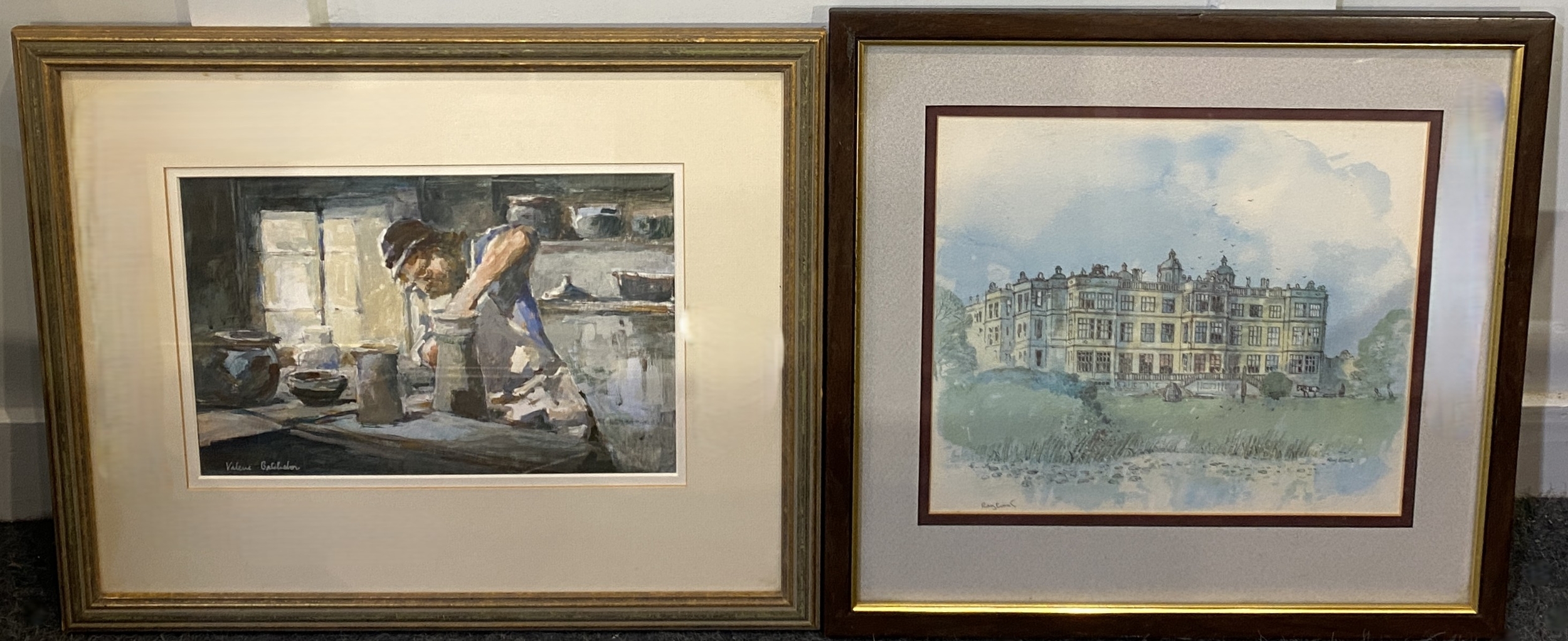Valerie Batchelor (British b.1932), 'The Potter', acrylic, signed, artists label verso, 19cm by 29cm, framed. Together with a Ray Evans print 'Longleat House', framed, (2).