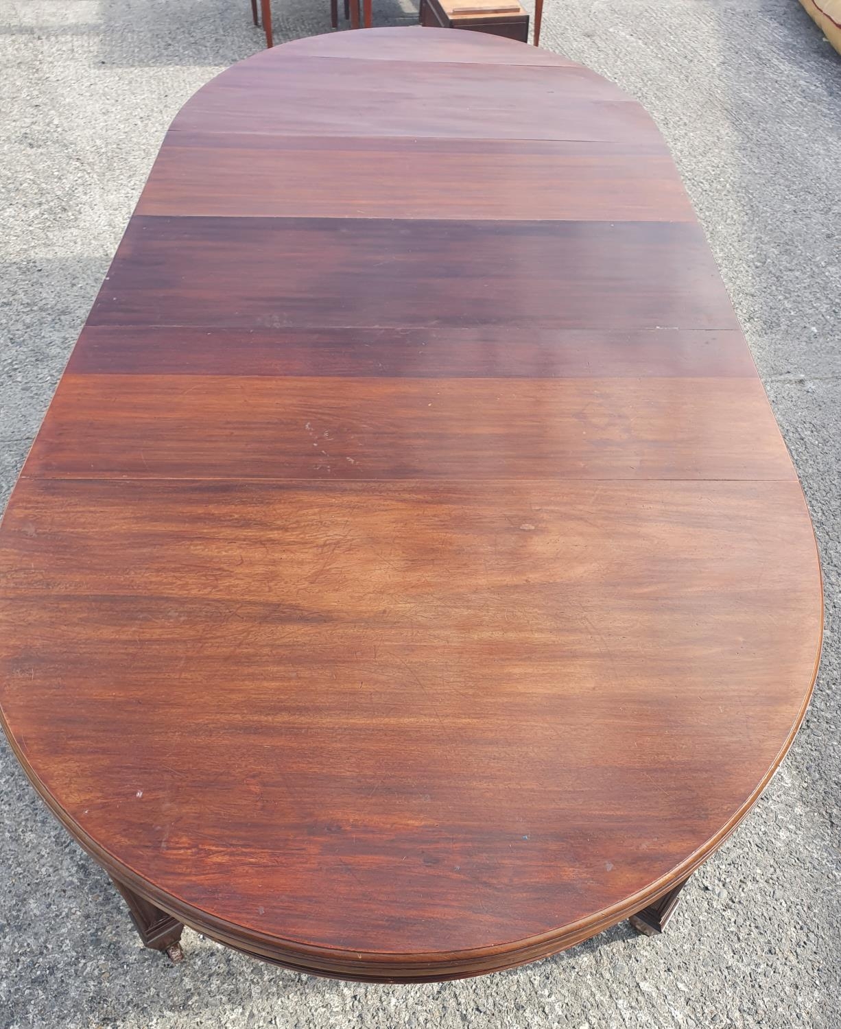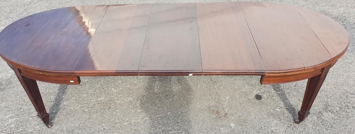 A large late 19th Century Boardroom Table with square tapered supports and three extra leaves.