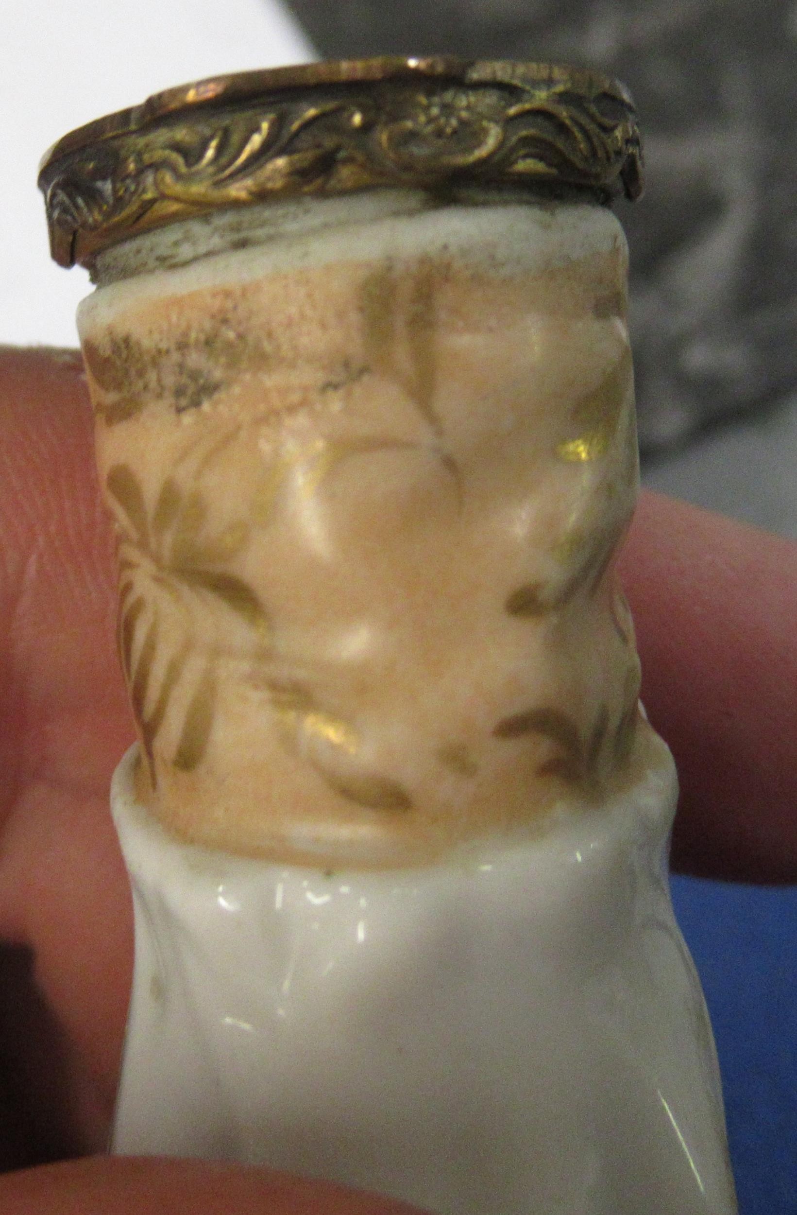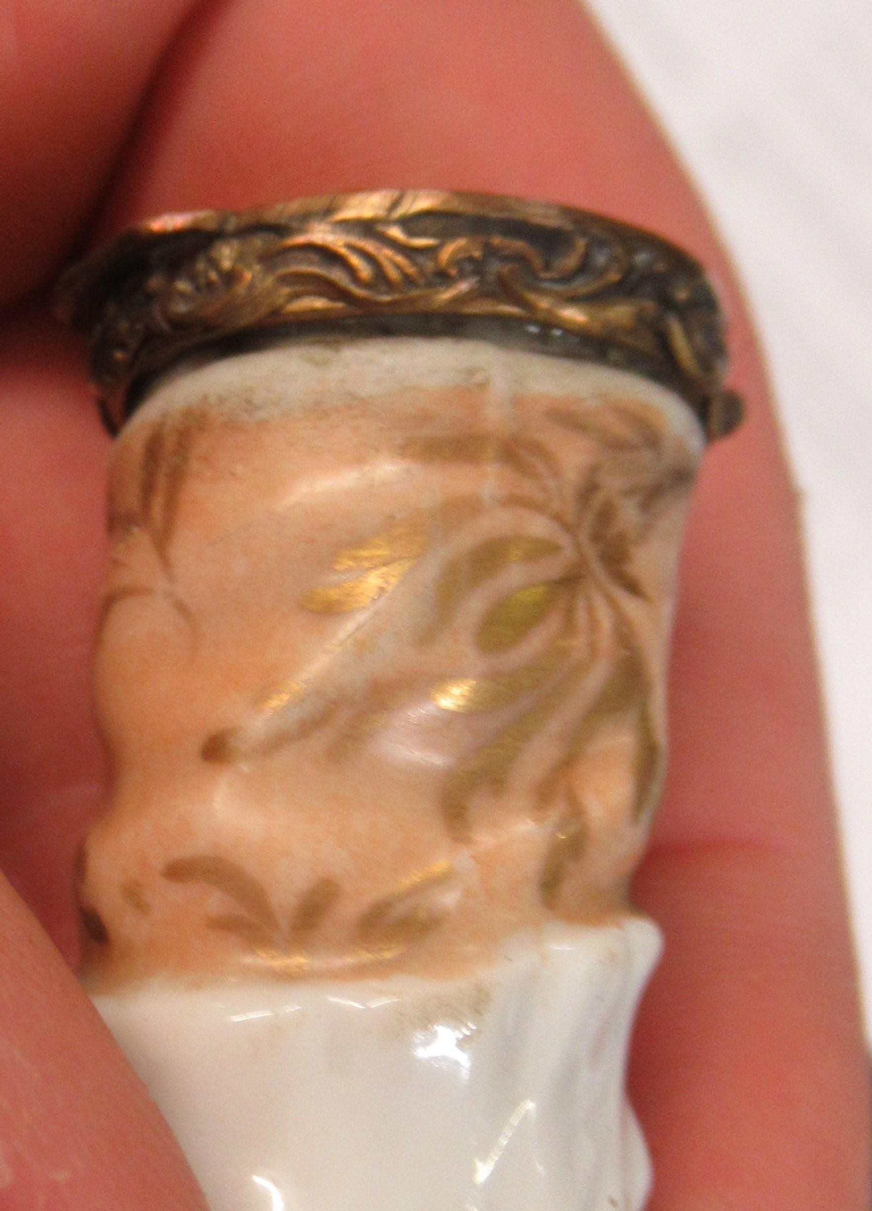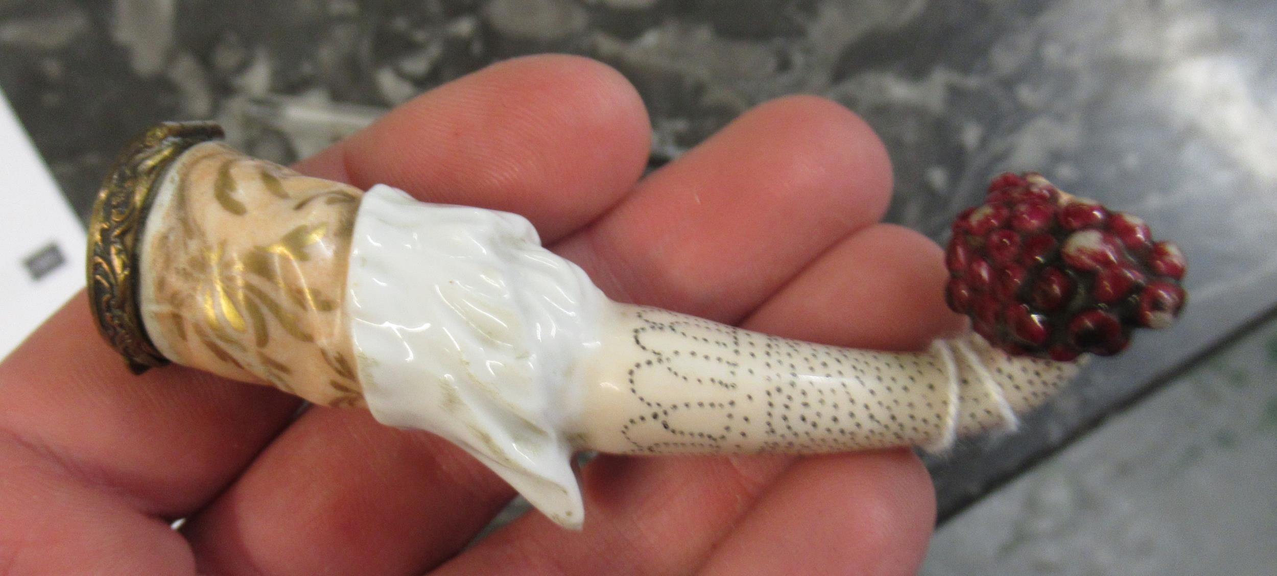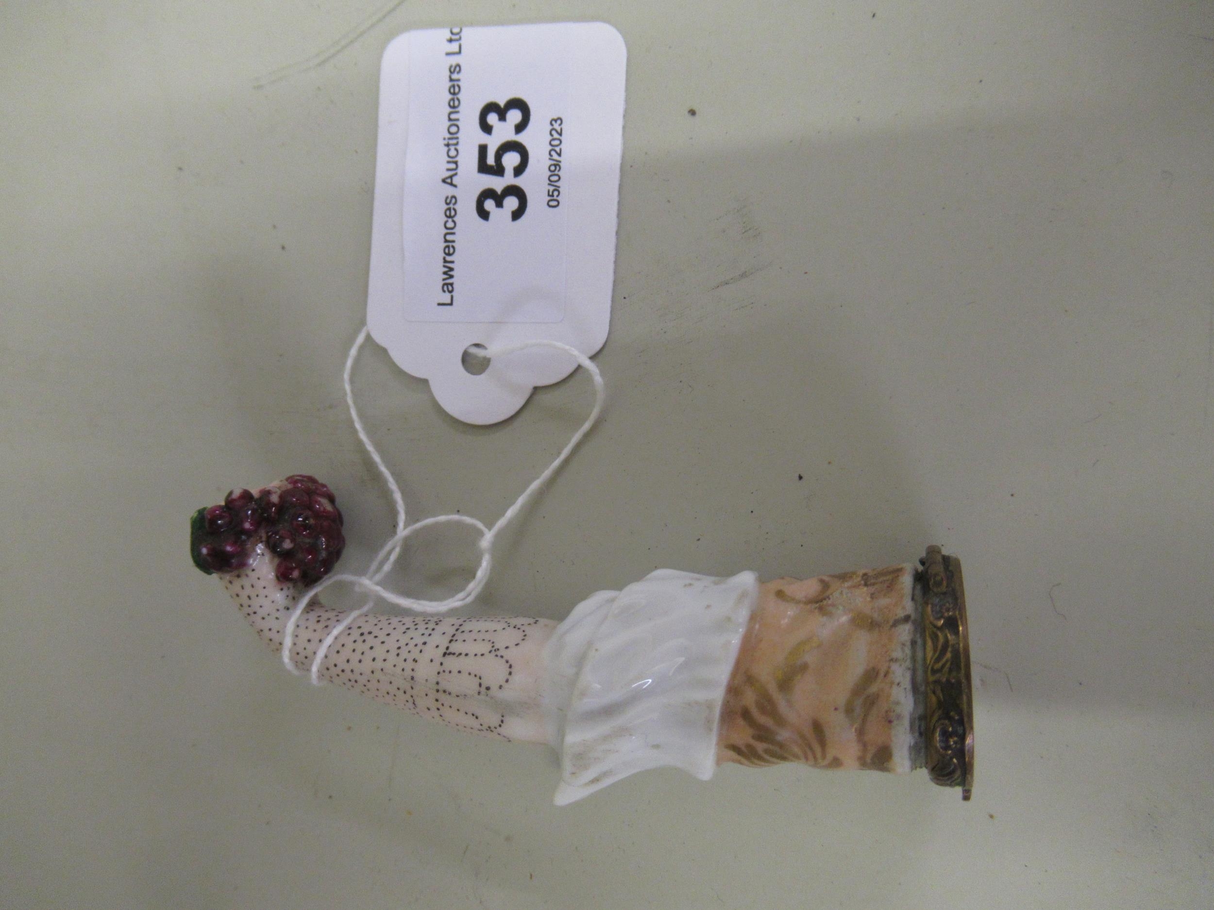 Antique porcelain gilt metal mounted needle case in the form of a lady's arm holding grapes