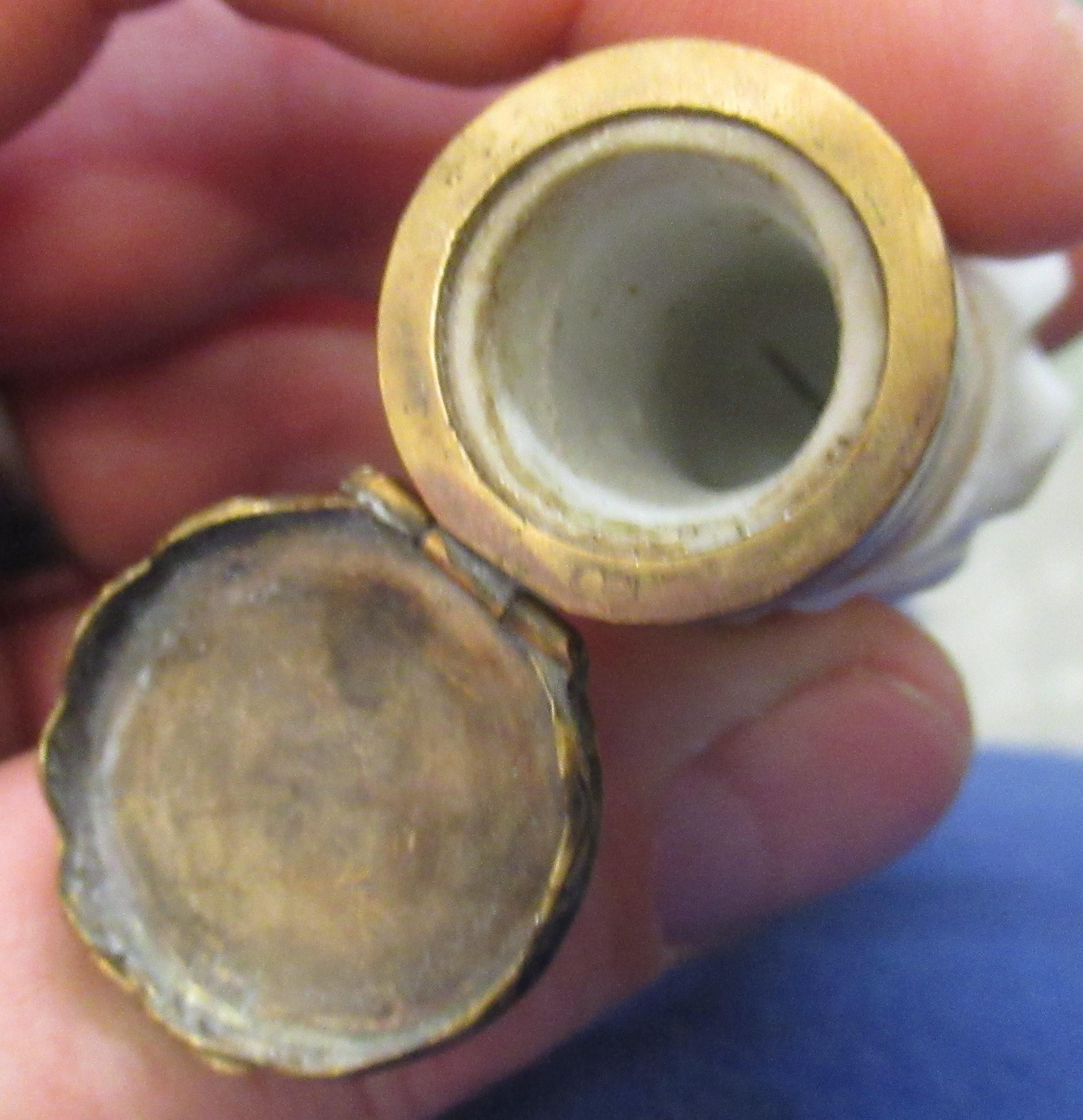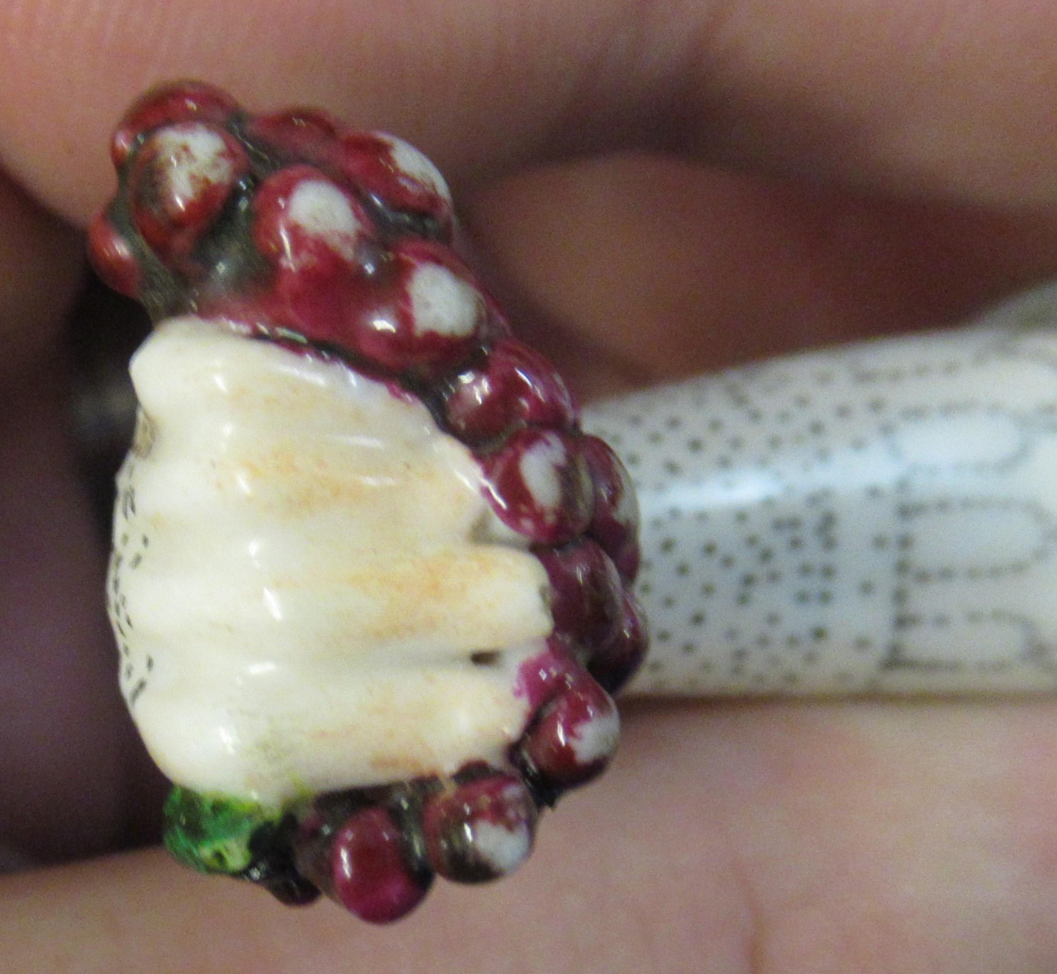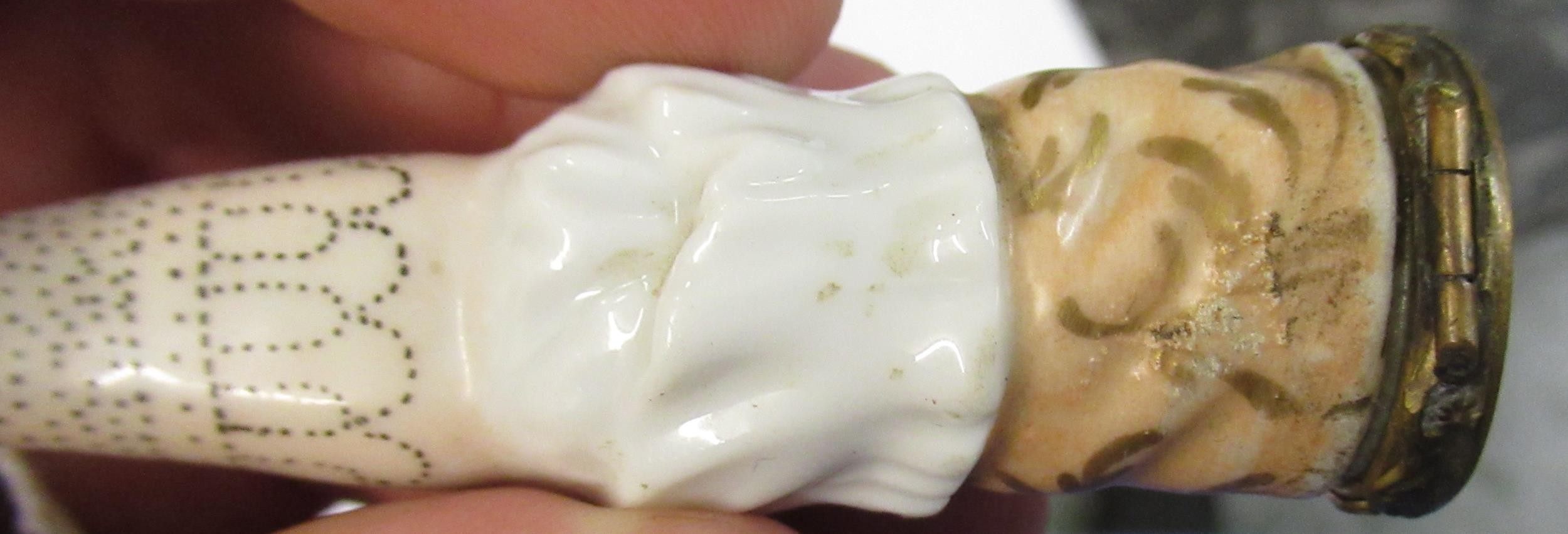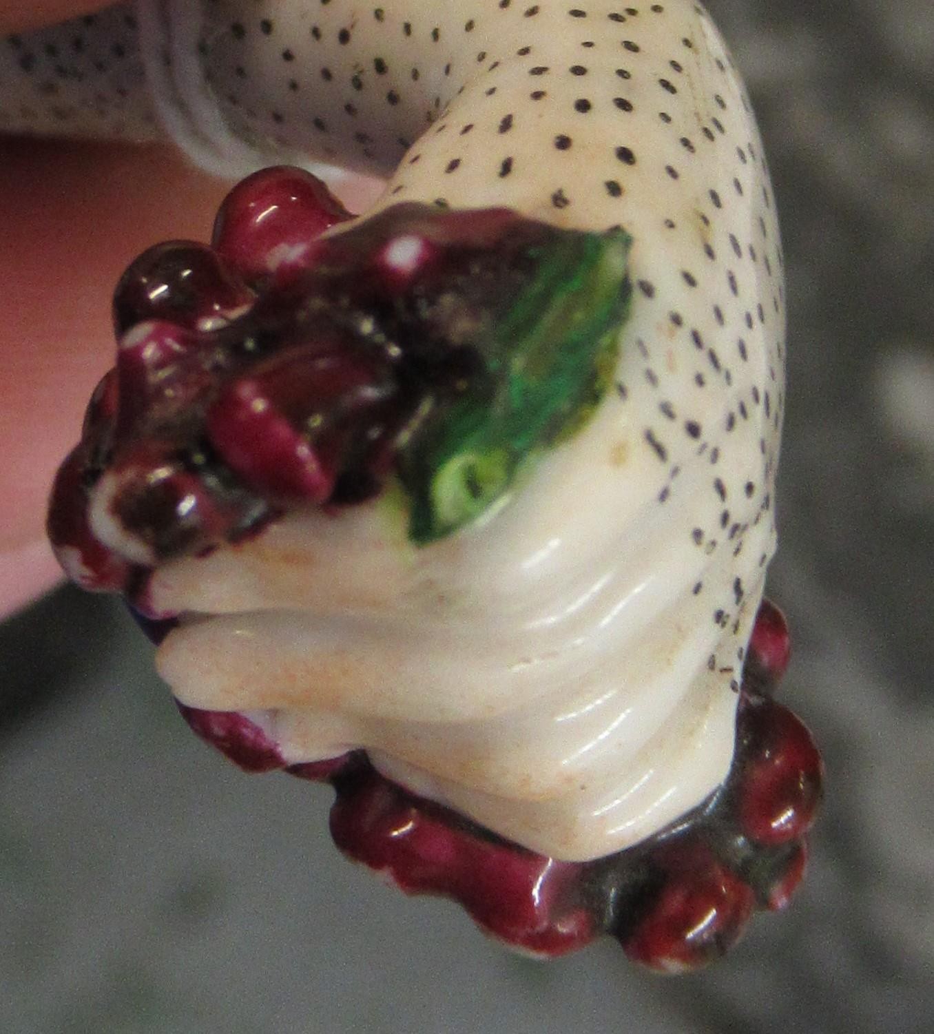 Antique porcelain gilt metal mounted needle case in the form of a lady's arm holding grapes