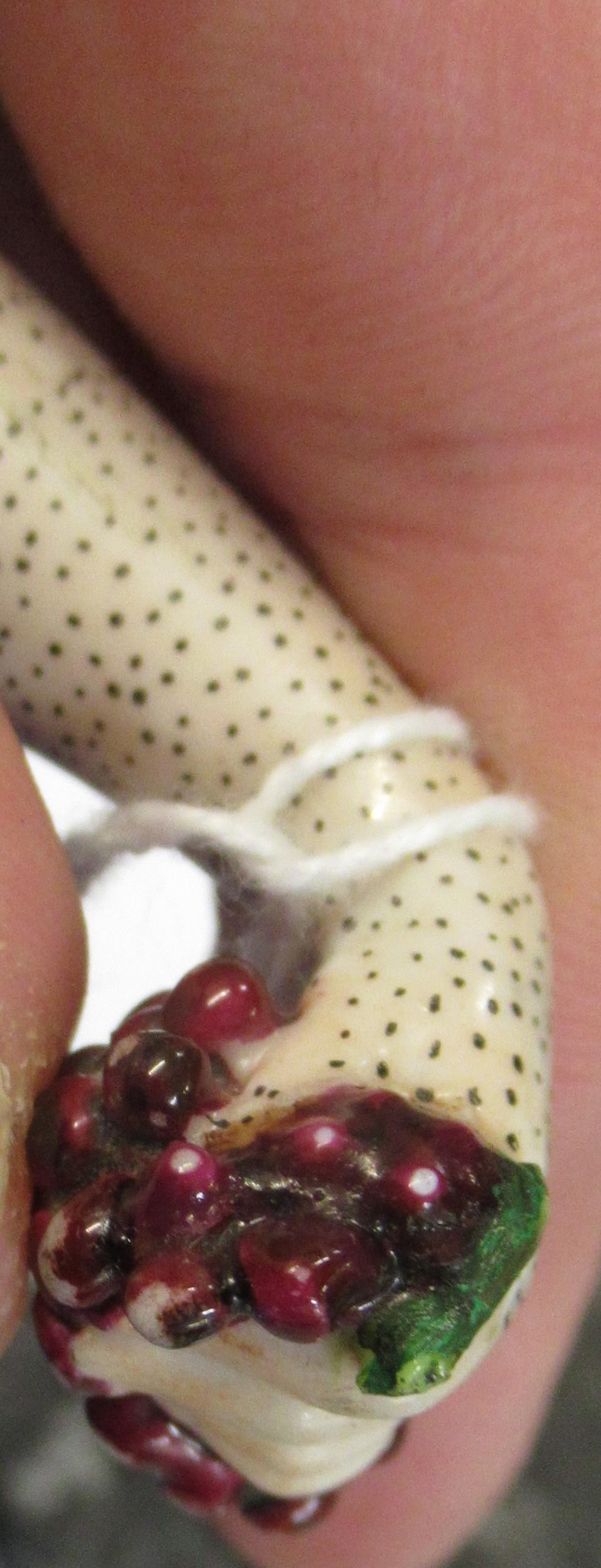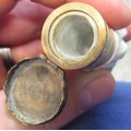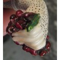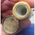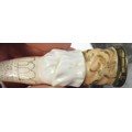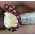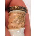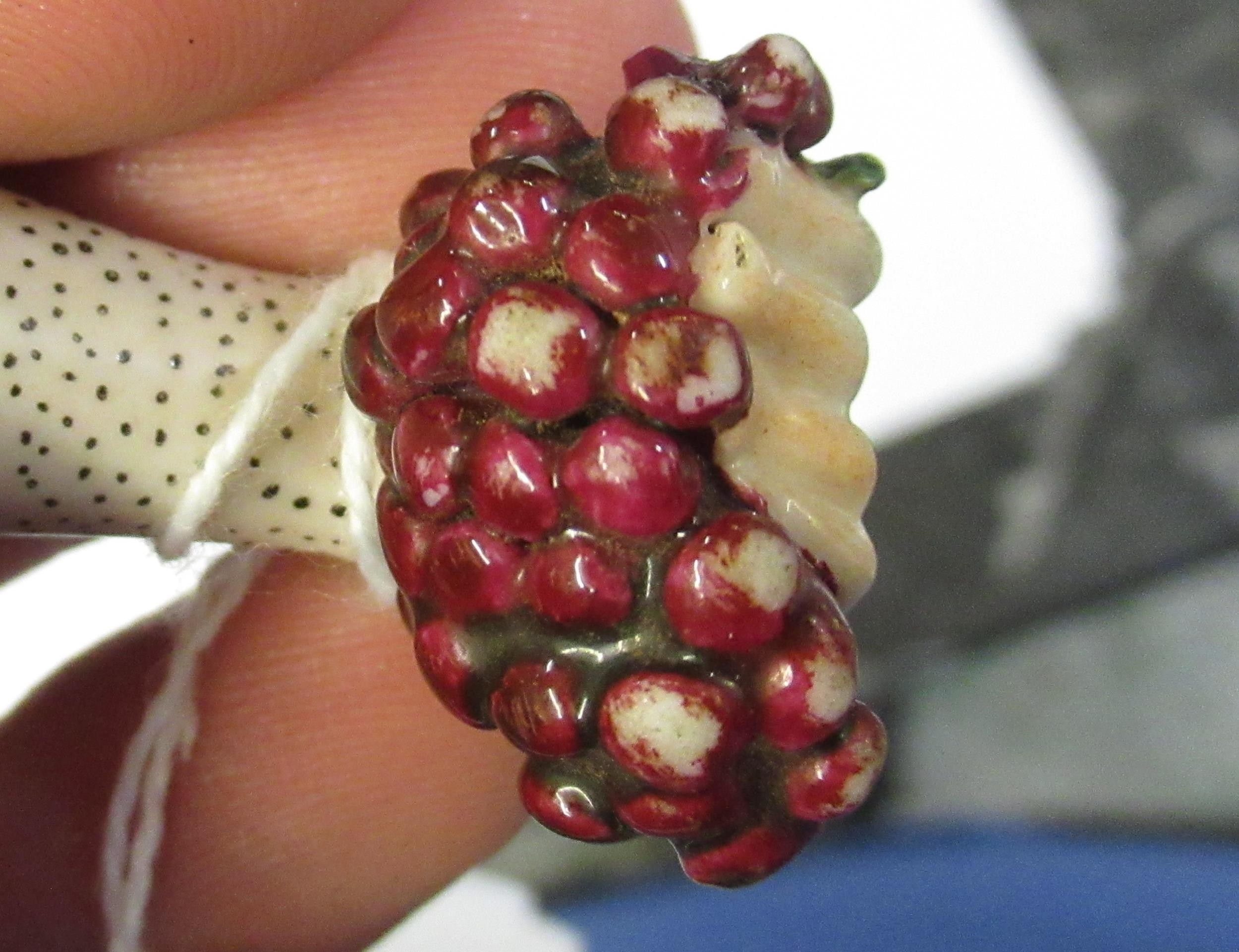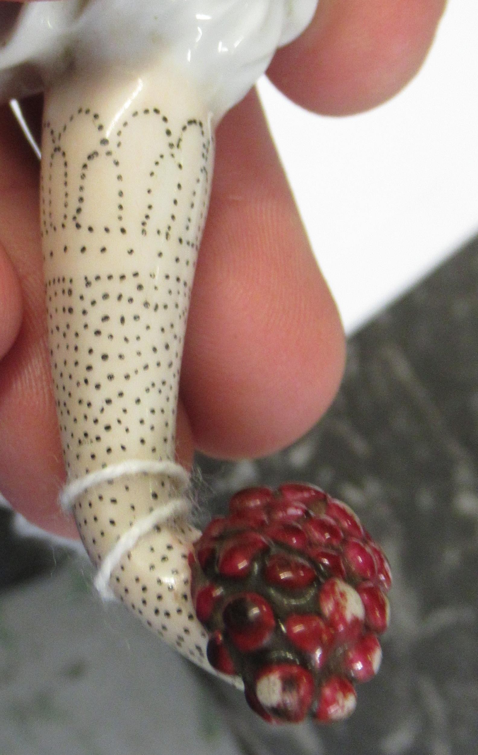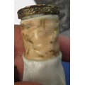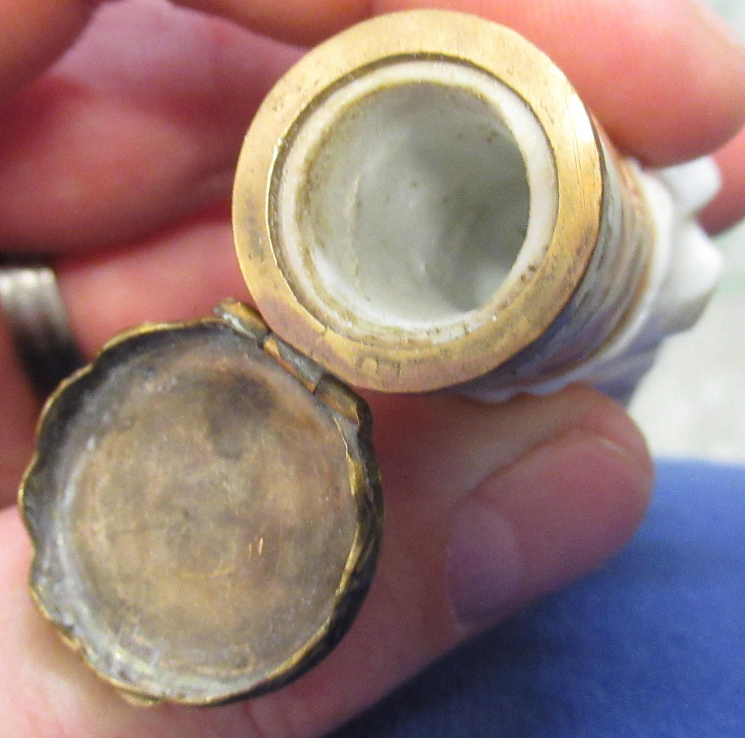 Antique porcelain gilt metal mounted needle case in the form of a lady's arm holding grapes