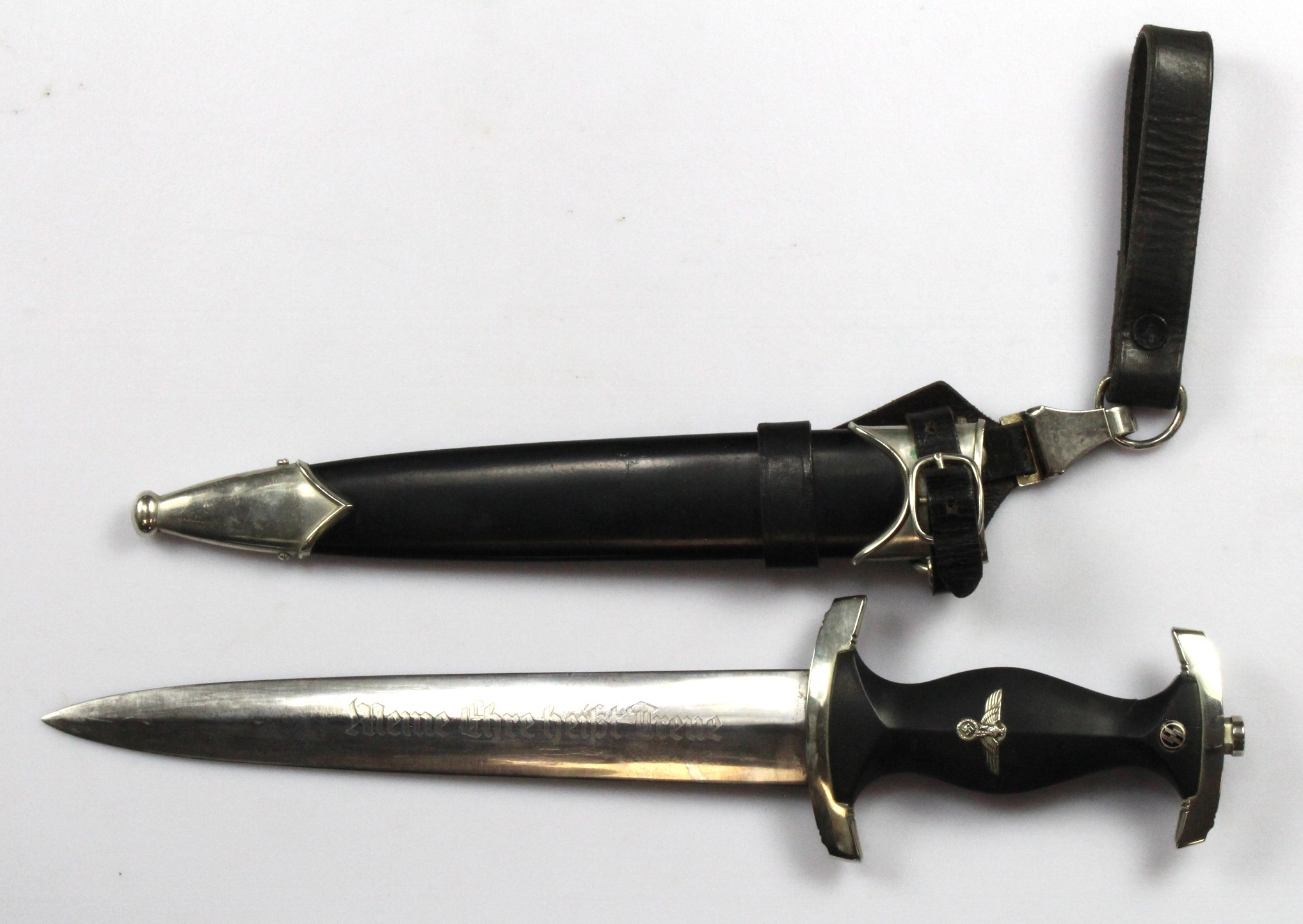 German SS Dagger 1933 A Schuttel Hofer & Co, strap & hanger. Full moto to blade.