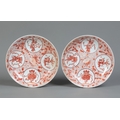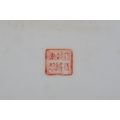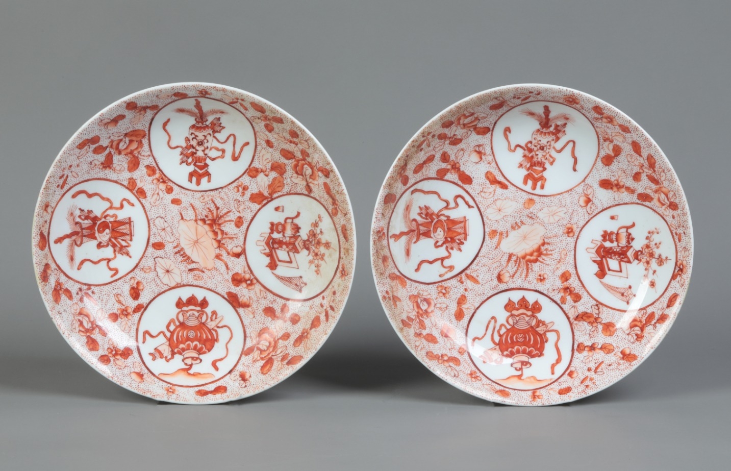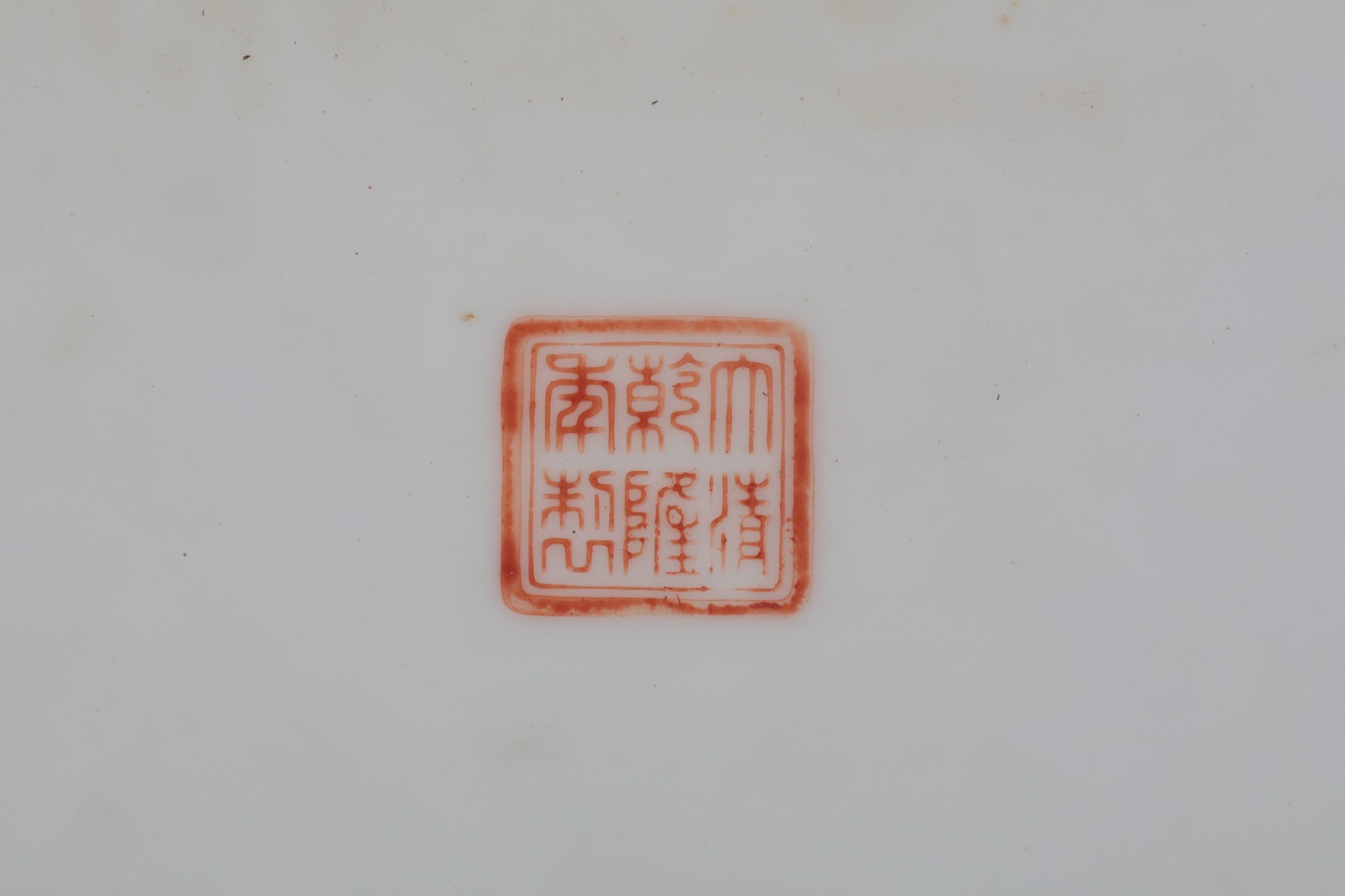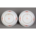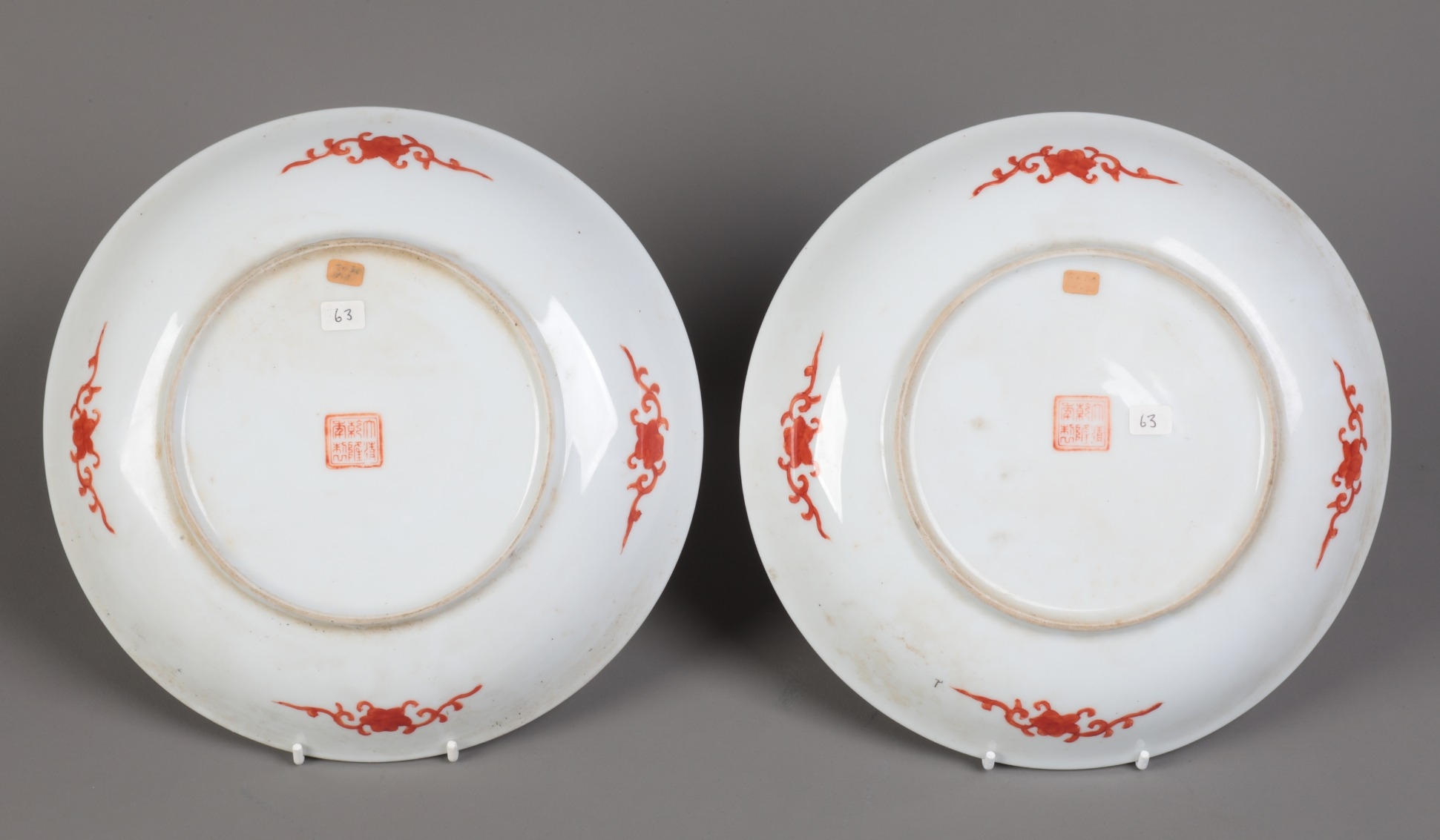 bearing six character Qianlong seal marks to the bases but later, each decorated with four panels of auspicious artefacts against a ground filled with flowers and petals, 24cm diameter (2)