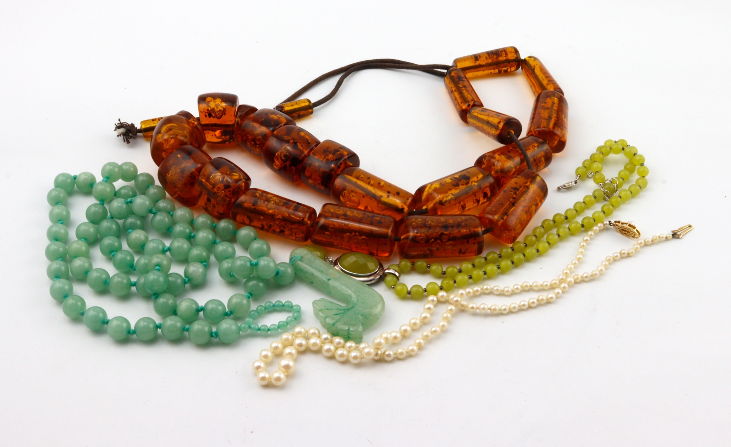 Four beaded necklaces, graduated cultured pearls on 9ct clasp, length 47cm. Imitation jade bead necklace, length 82cm. Imitation amber necklace, length adjustable 70cm. Green hardstone and silver bead necklace, length 45cm, gross weight 115.3g