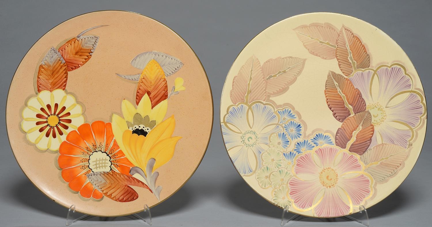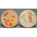 TWO SIMILAR ART DECO A E GRAY & CO. EARTHENWARE WALL PLAQUES, C1930, 34CM DIAM, PRINTED MARK (ONE ALSO WITH DECORATOR'S MONOGRAM AD) AND A3830 OR A3830