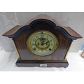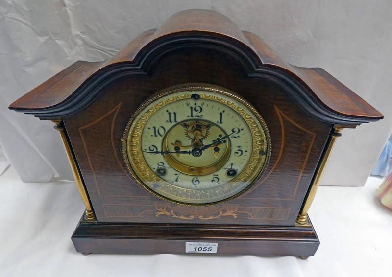 MAHOGANY MANTLE CLOCK WITH INLAID DECORATION AND ENAMEL & GILT FACE. LENGTH - 30 CM