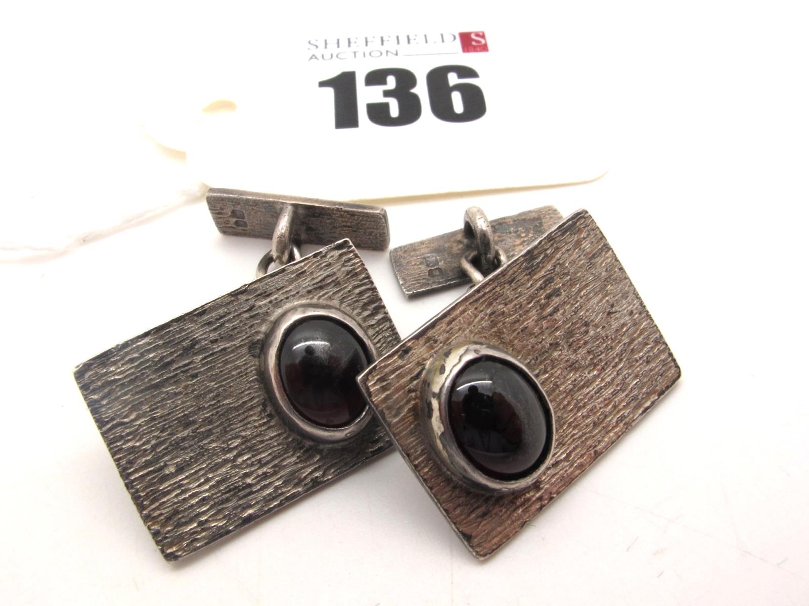 A Pair of Stylish Hallmarked Silver Cufflinks, the rectangular bark textured panels collet set with oval cabochon, on chain connections, S&B, London 1972.