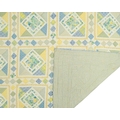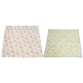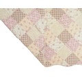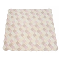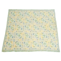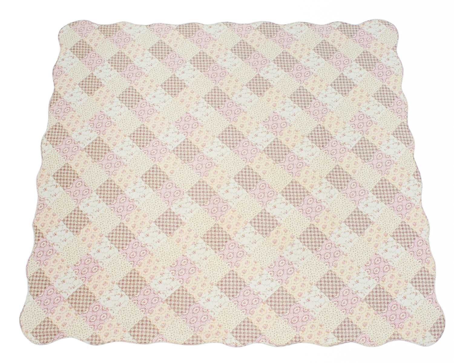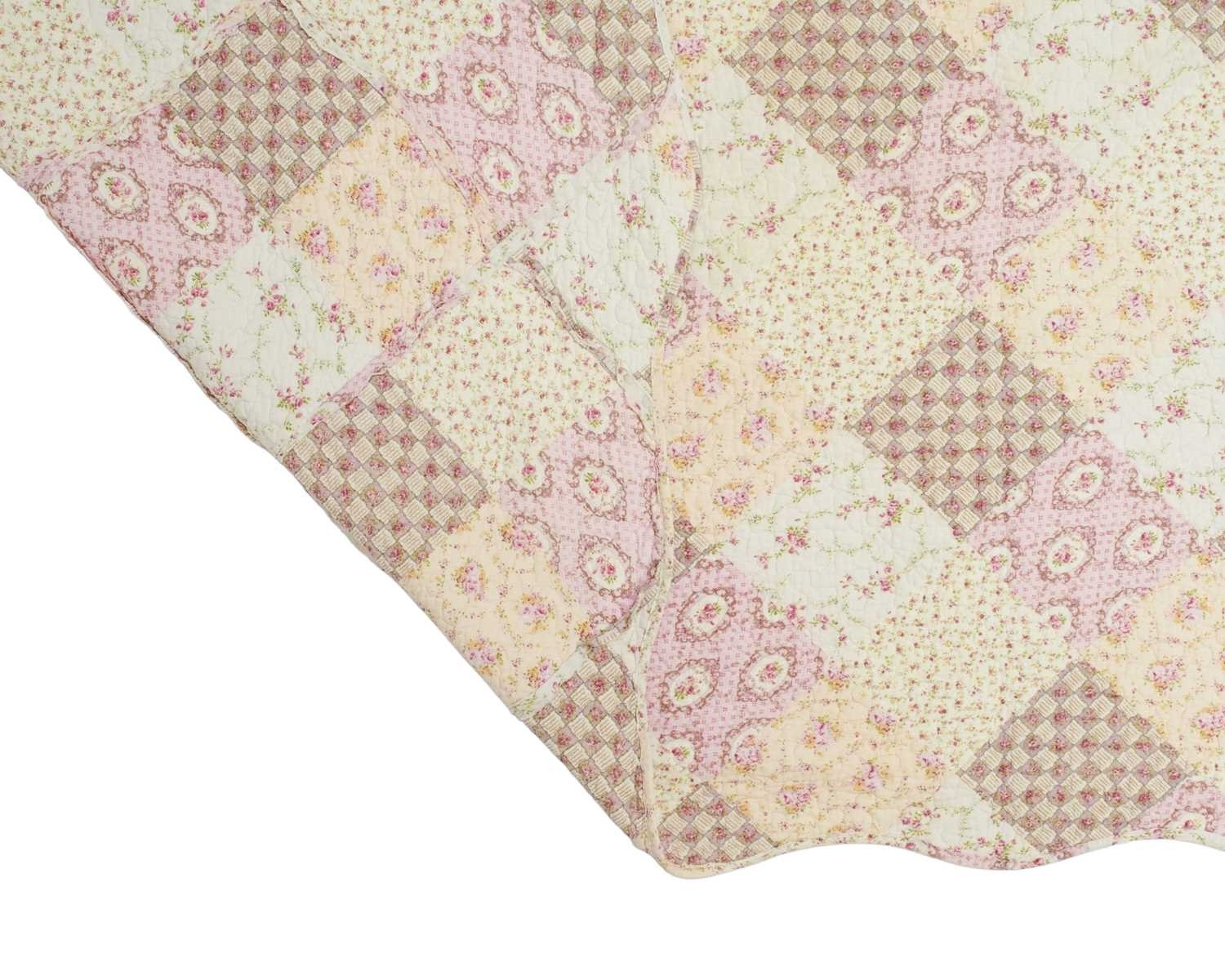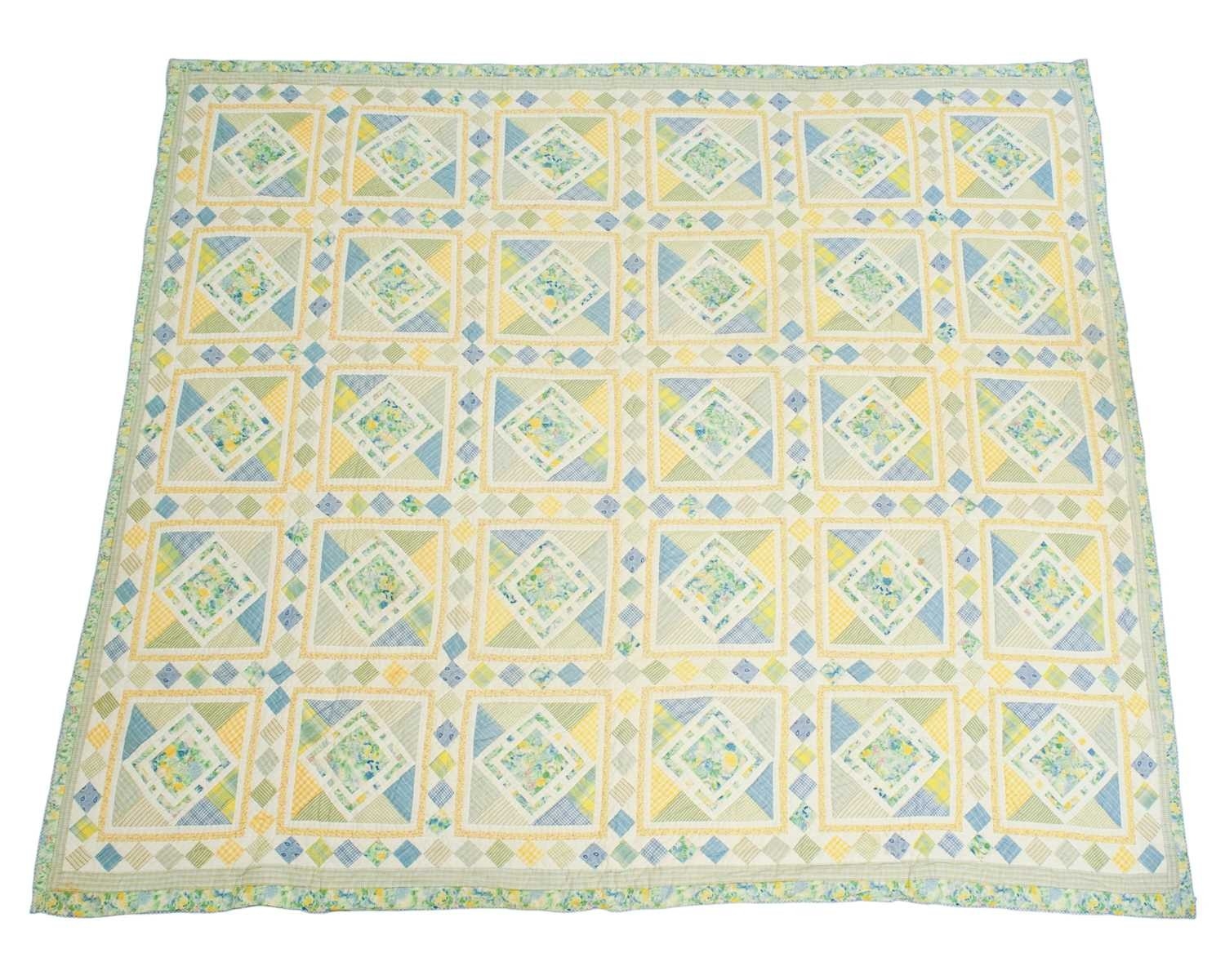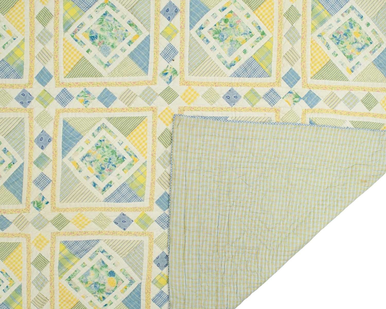 Two patchwork quilts. 20th century, one patchwork floral pink quilt with scalloped edging, 243cm x 247cm and a blue,green and yellow floral quilt, with diamonds within squares, the backing in a yellow and blue check, 270cm x 240cm.