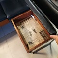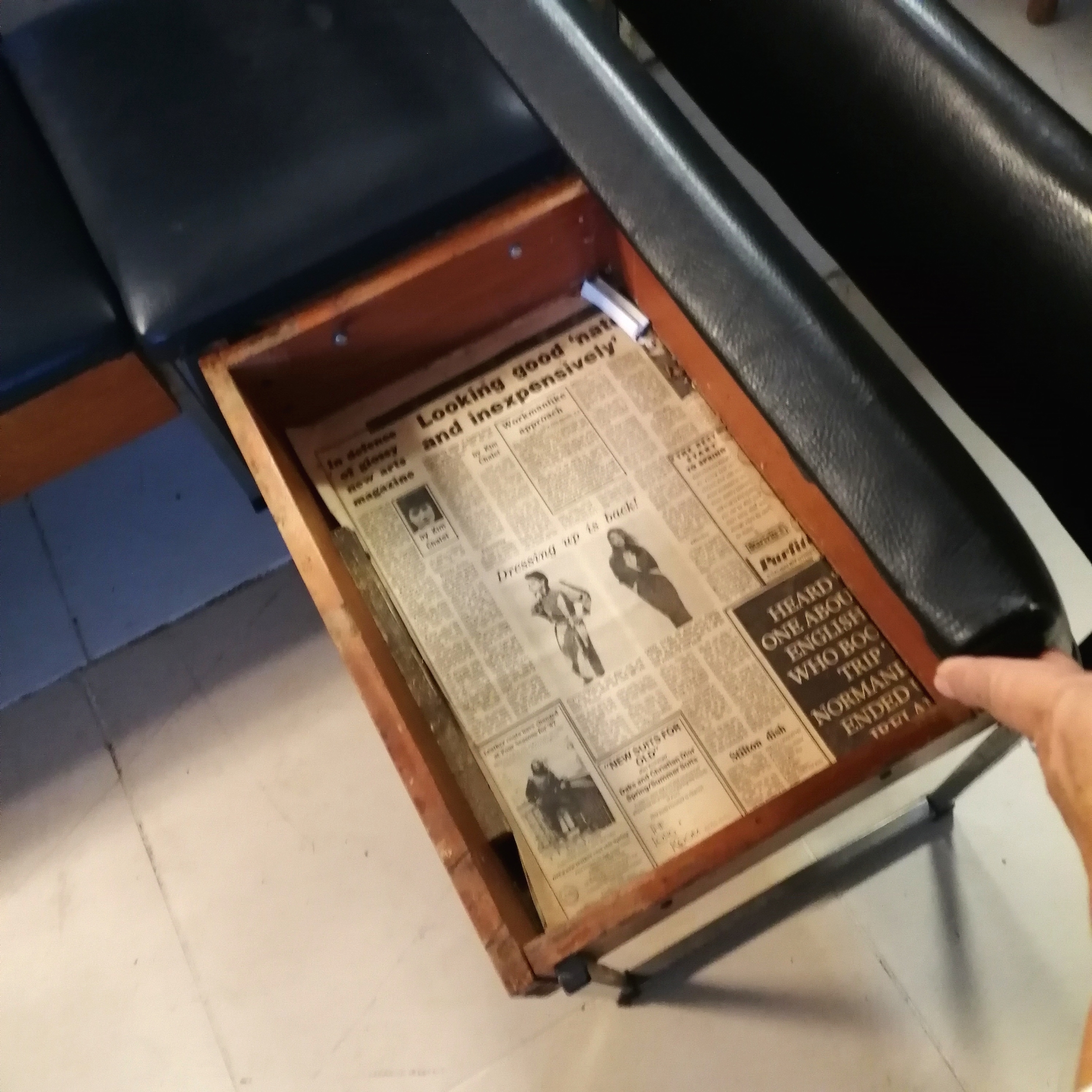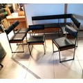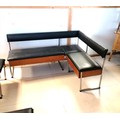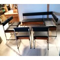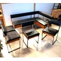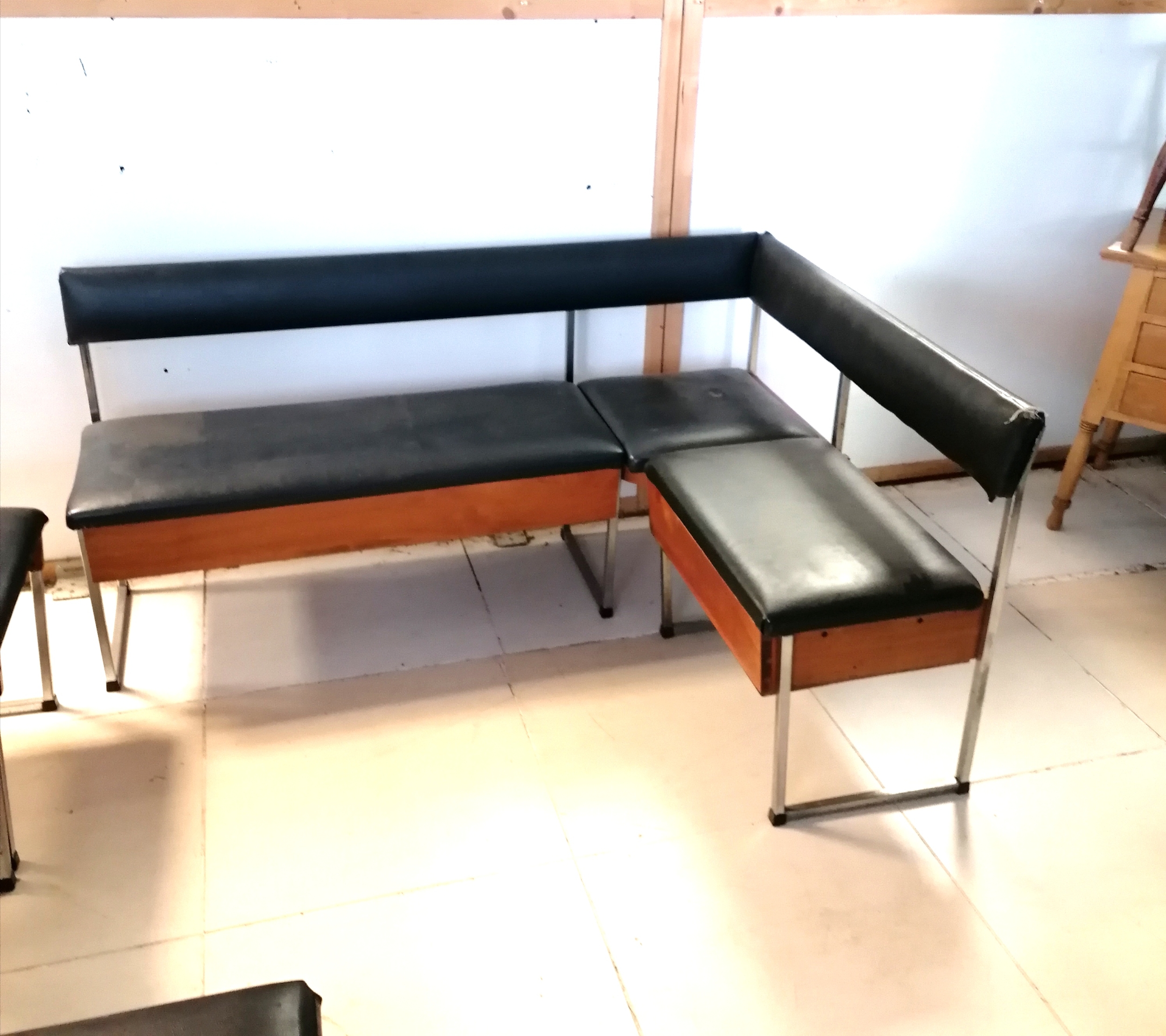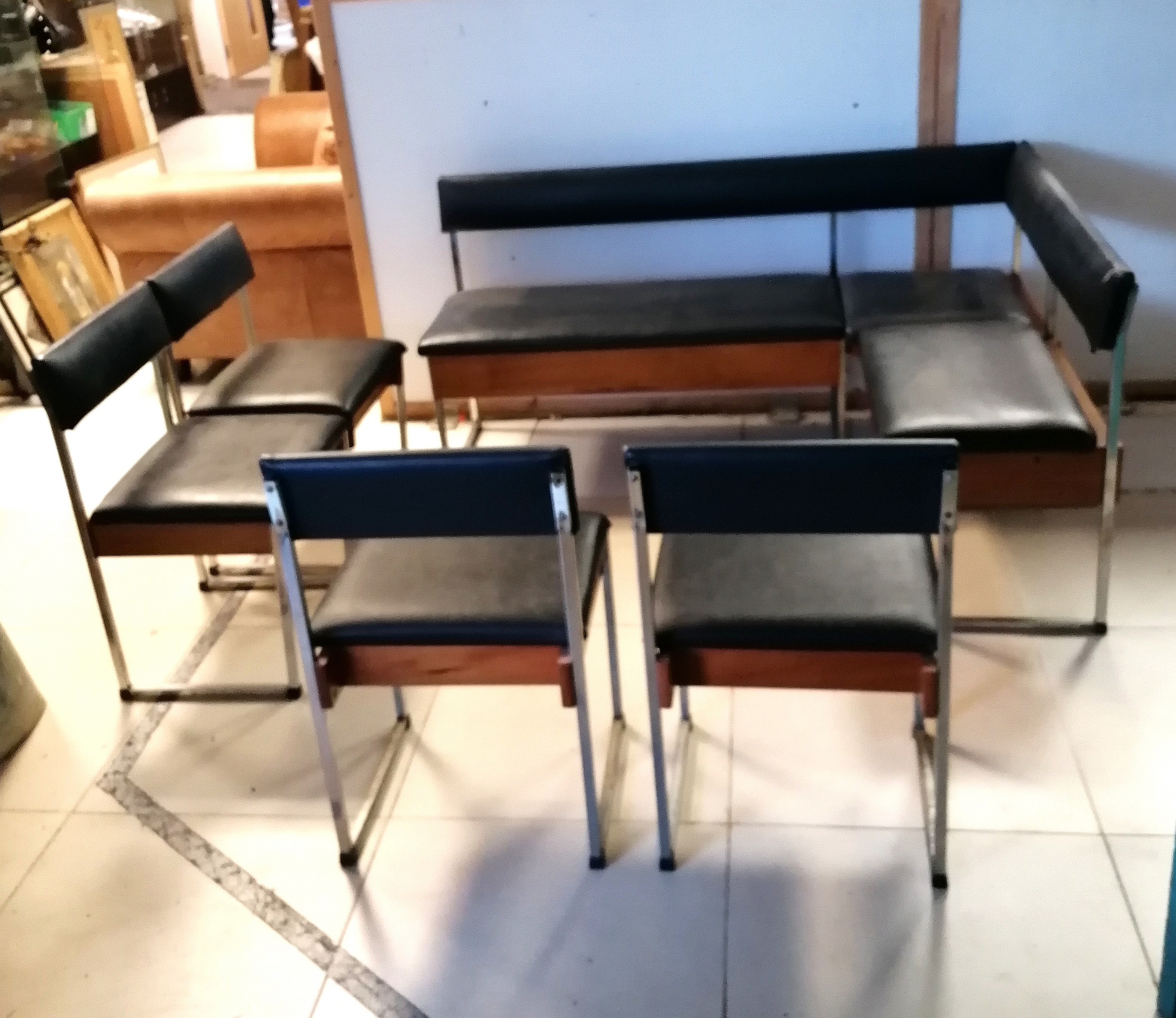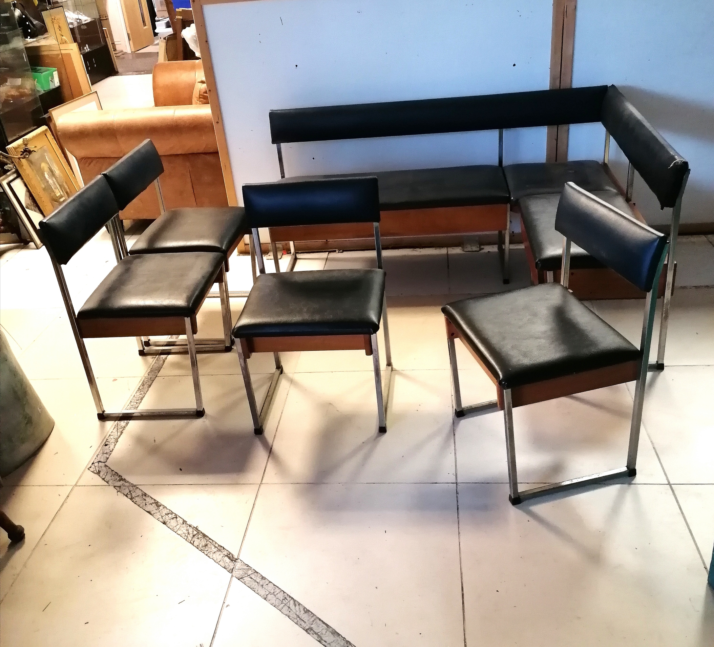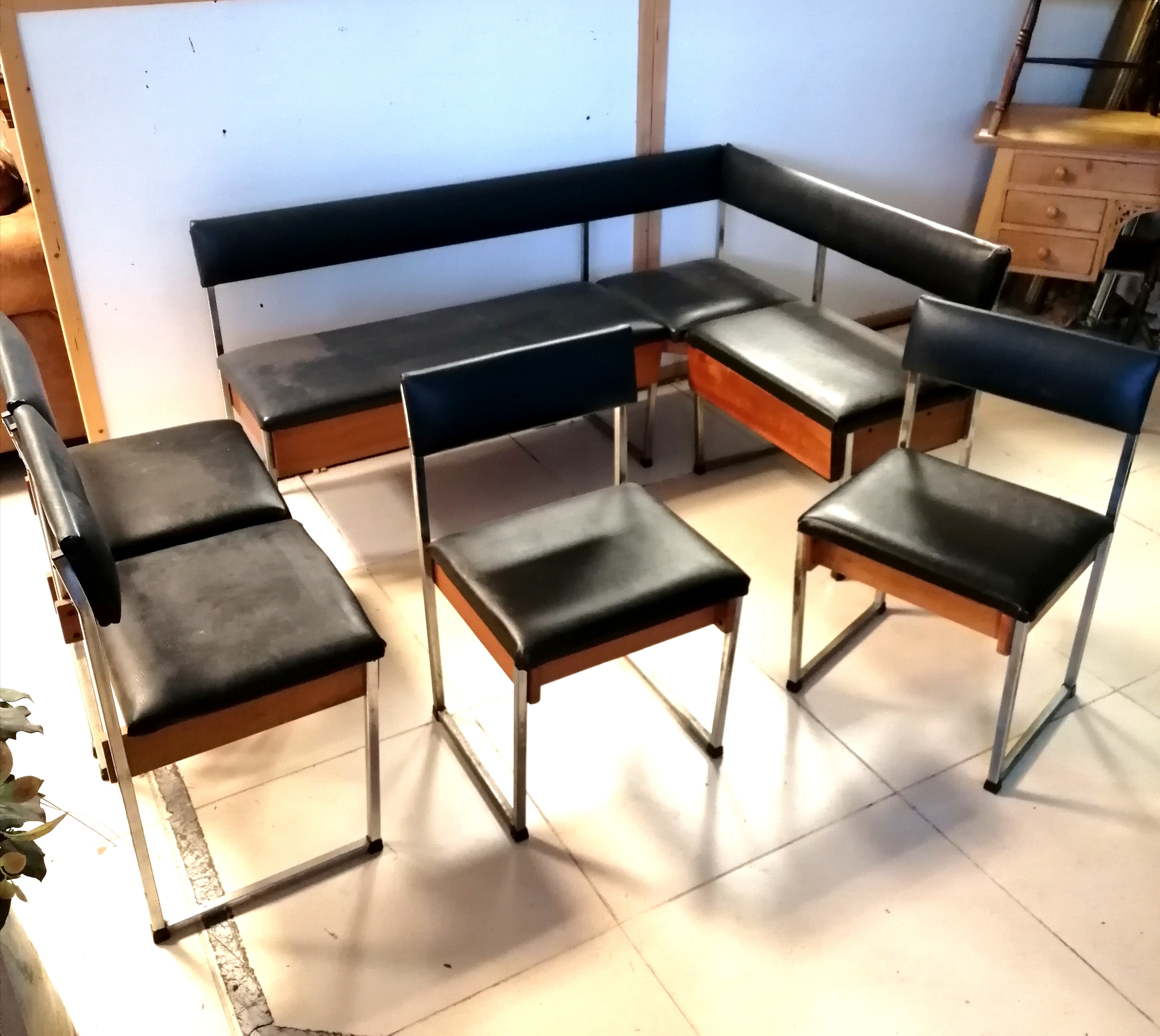Mid century corner banquette dining set comprising corner seat with 2 lift up compartments and 4 dining chairs of chrome, teak and black leatherette upholstery - 155cm x 110cm