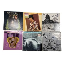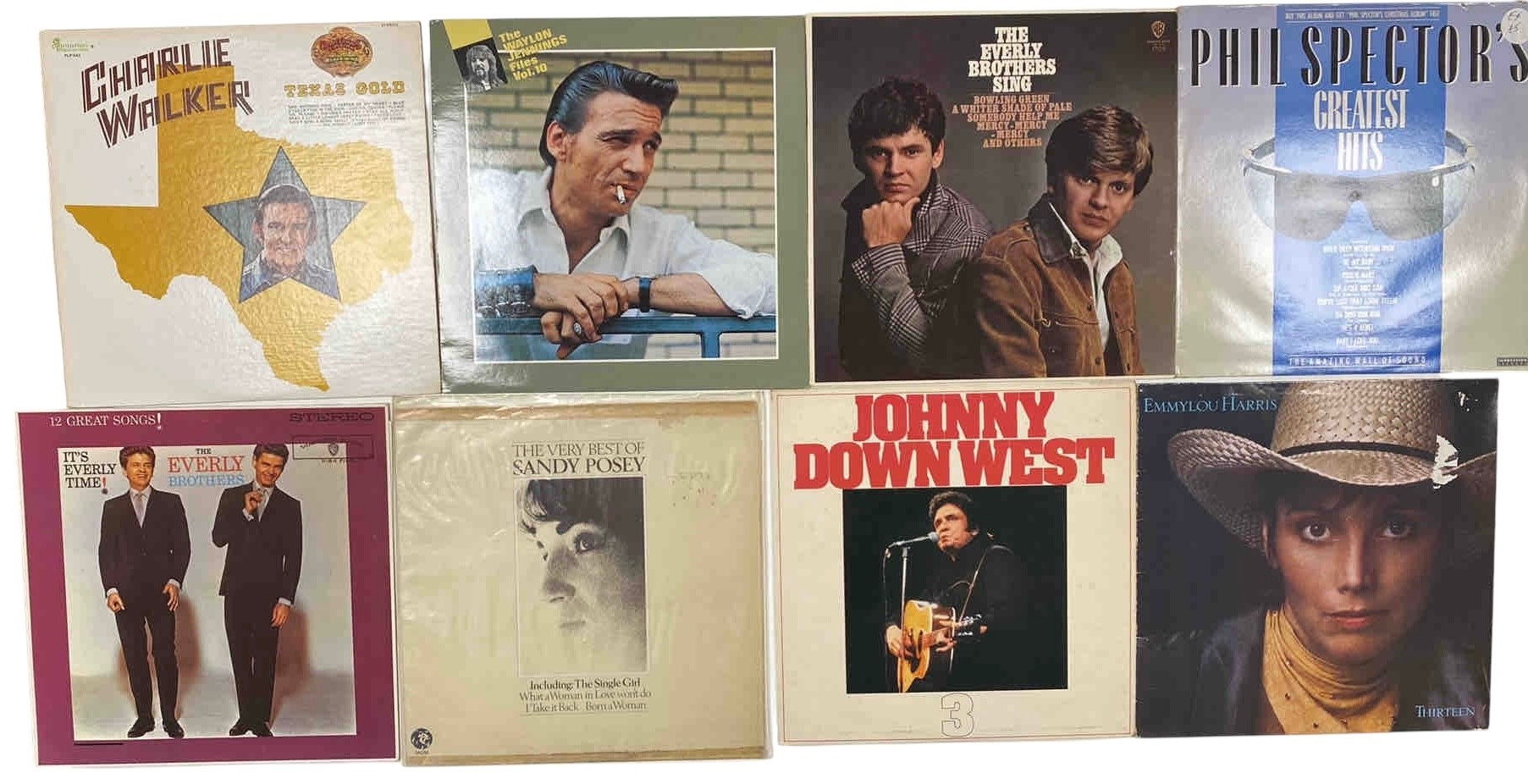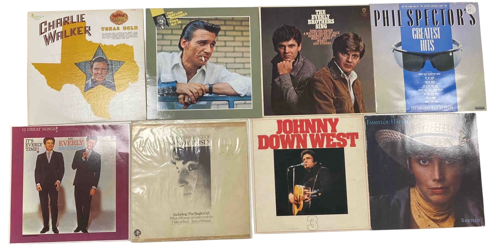 A group of vinyl record albums, including Johnny Dowd, Emmylou Harris, Phil Spector, Charlie Walker, Sandy Posey, and The Everly Brothers.