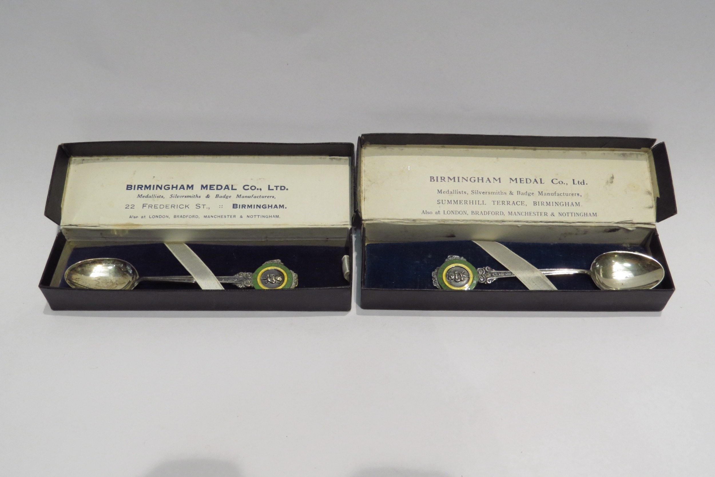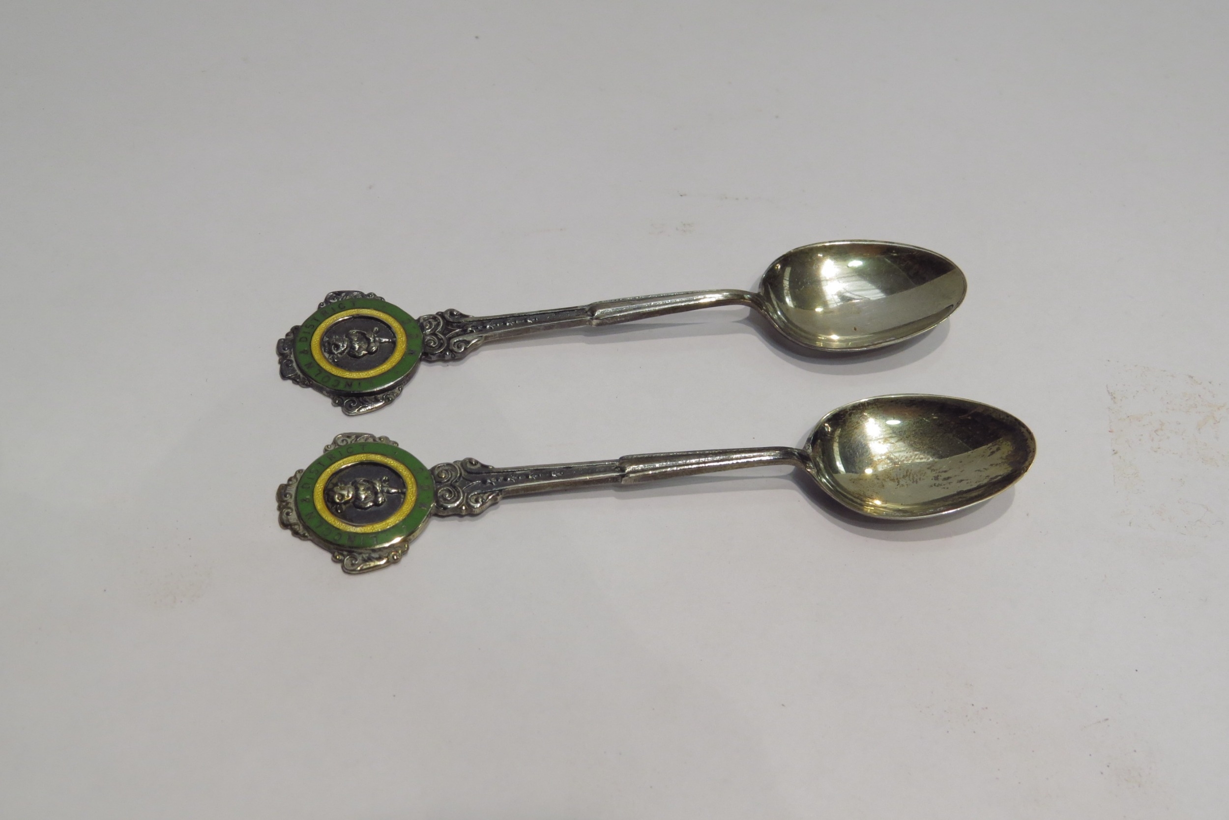 Two silver souvenir spoons with enamel and Lincoln imp decoration. In original boxes