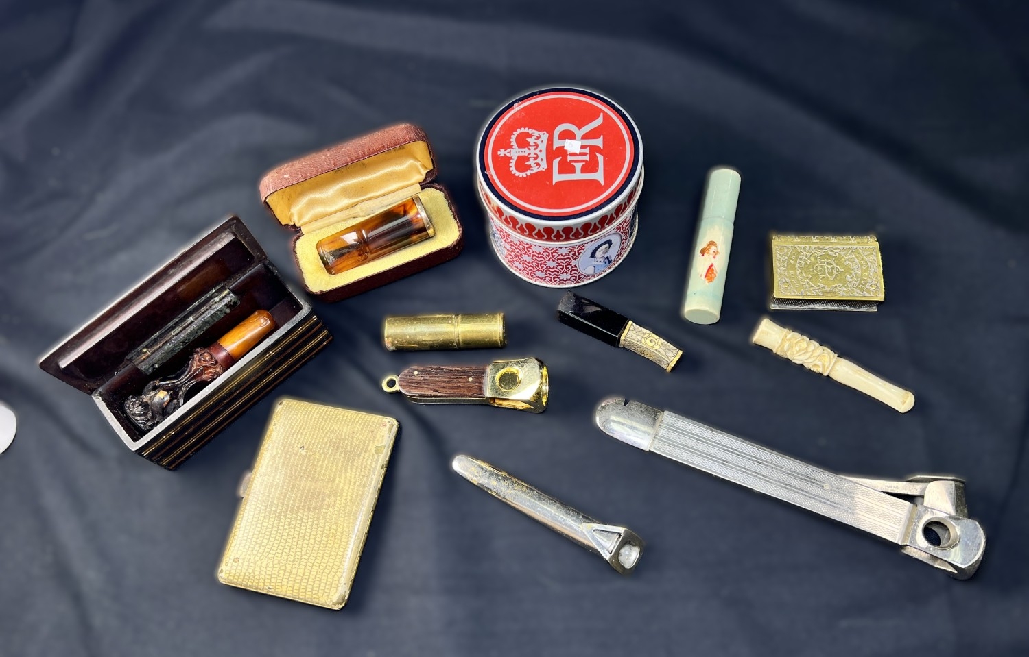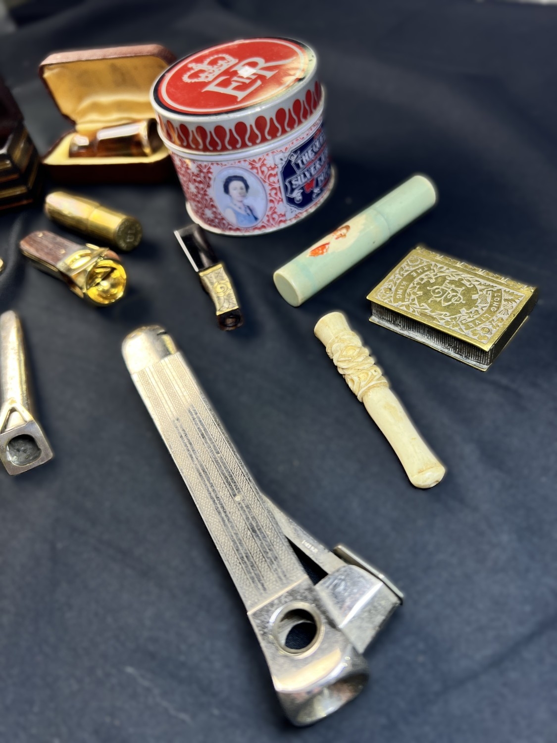A selection of cigar related items including amber and other holders, clippers etc.