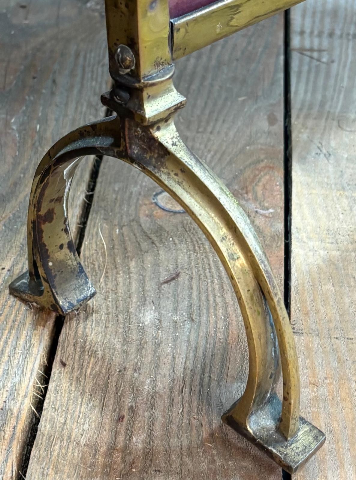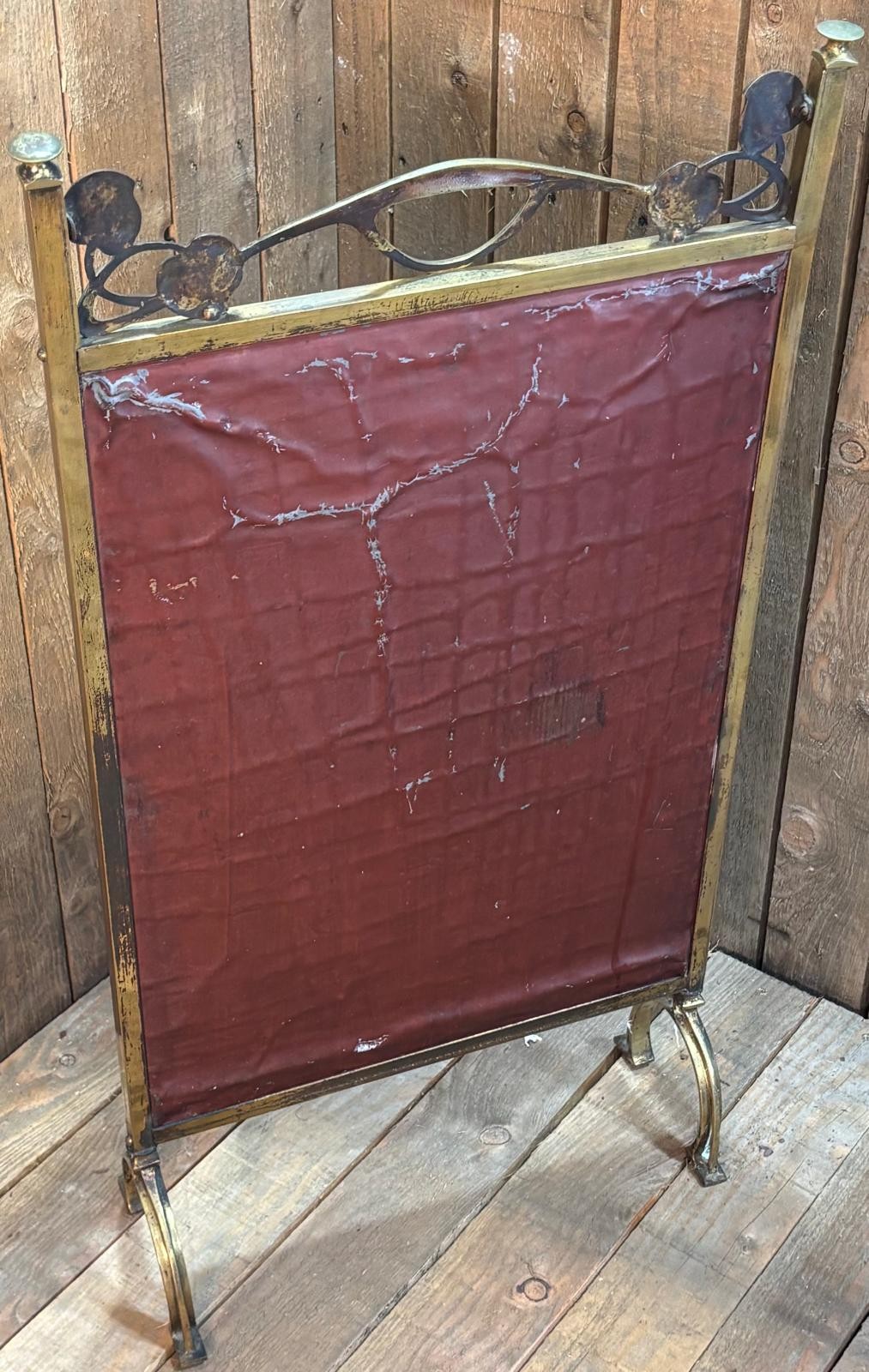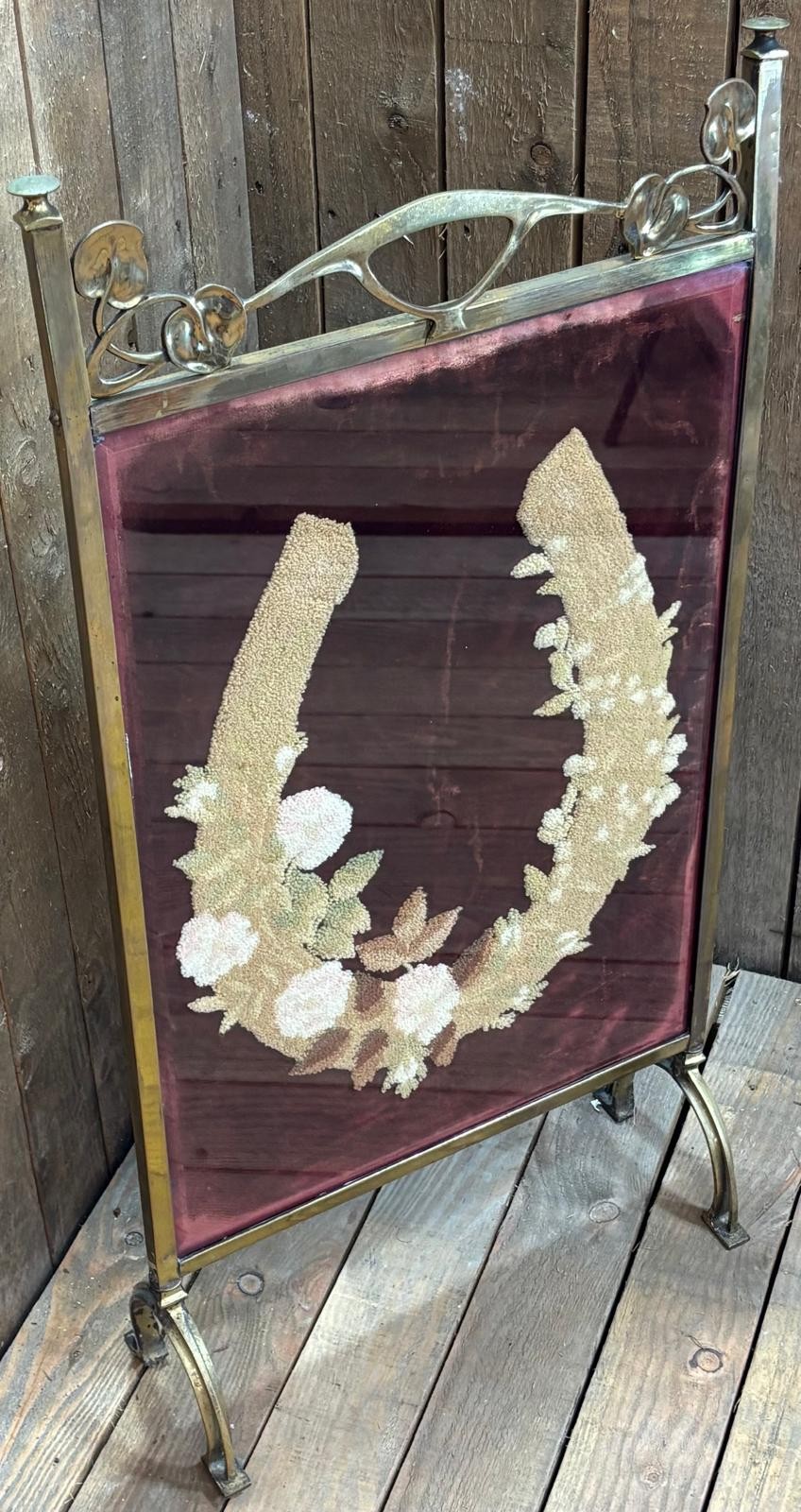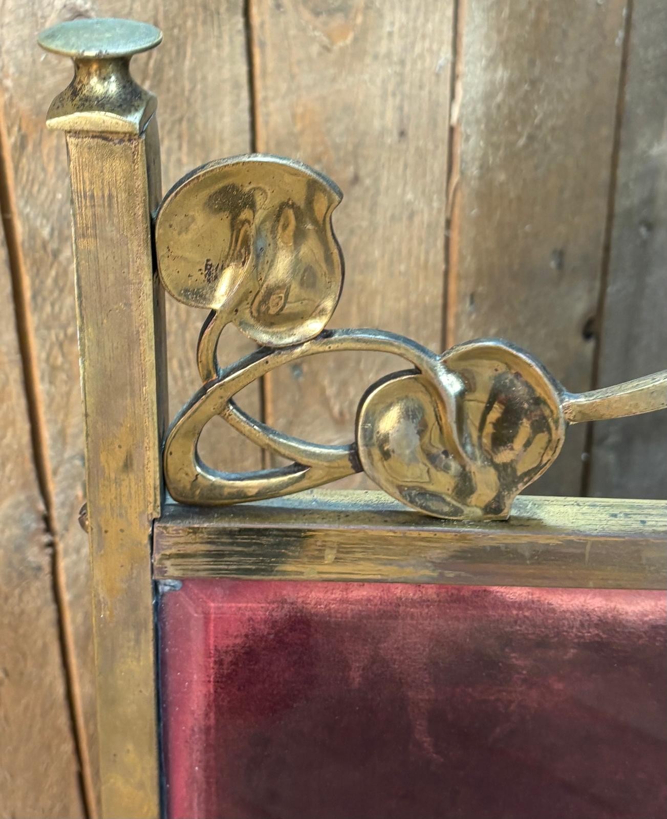Art Nouveau brass, glass and tapestry fire screen.
