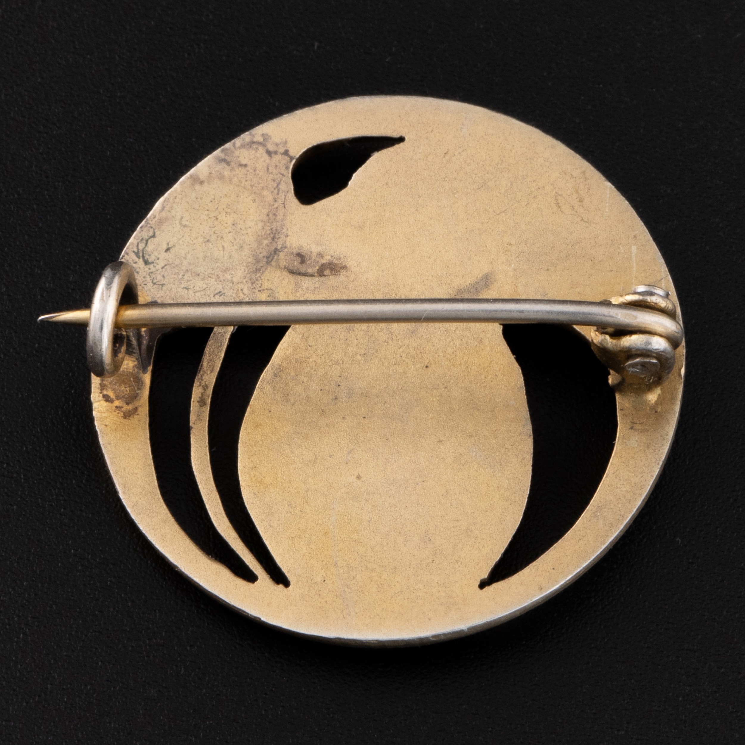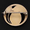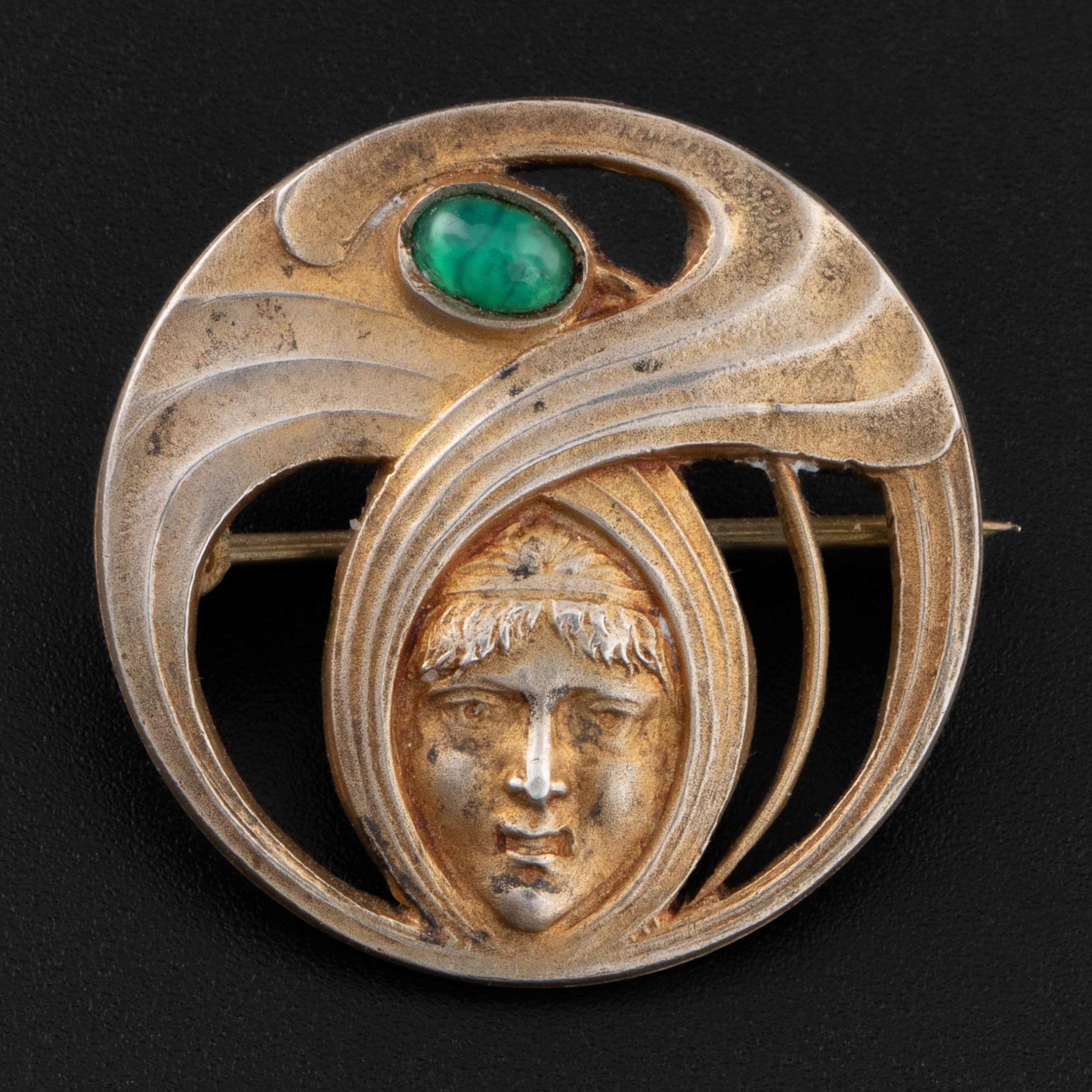 An early 20thC Art Nouveau white metal and chrysoprase brooch, decorated with gilded semi-openwork design with a maiden's face below a chrysoprase cabochon, brooch with gilding, marked '800' on clasp, together with an unknown makers mark, probably Scandinavian, diameter 2.5cm, total weight 6.2g. (LDC15455)