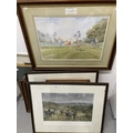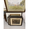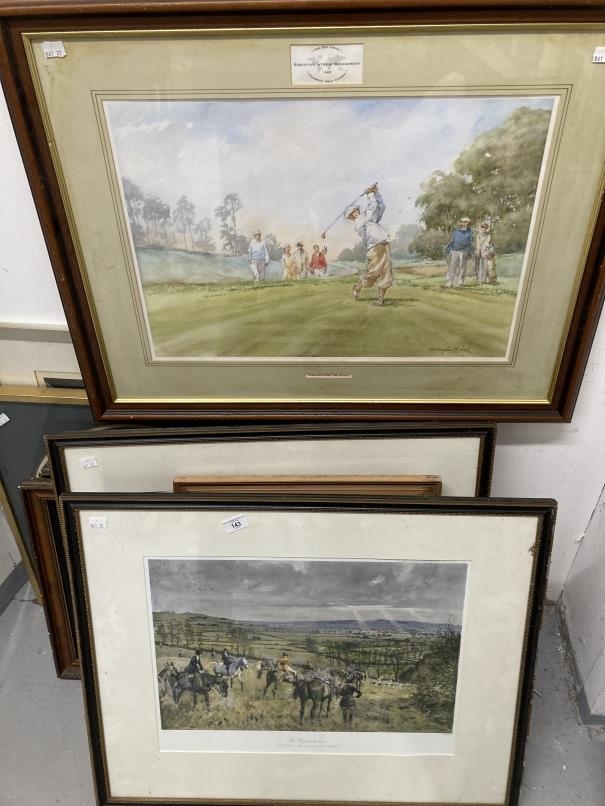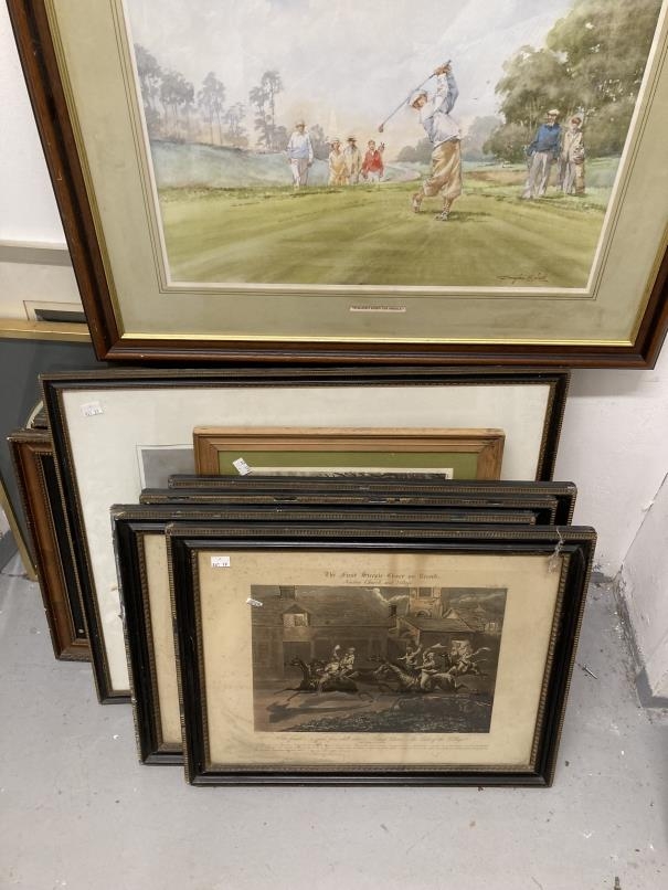 Douglas E West (1931 - ) a print 'Straight down the middle' given out in the Des Lynam golf classic and 'Lovers in the moonlight' plus 5 others. (7) H. Alken: Aquatints set of four, The First Steeplechase, framed and glazed one broken glass, two Lionel Edwards prints the Warwickshire and the Old Bairstow Fox Hounds, and a print by Rich Jones Going Out, framed and glazed. 13¾ins. x 11½ins. (7) 14 in total.