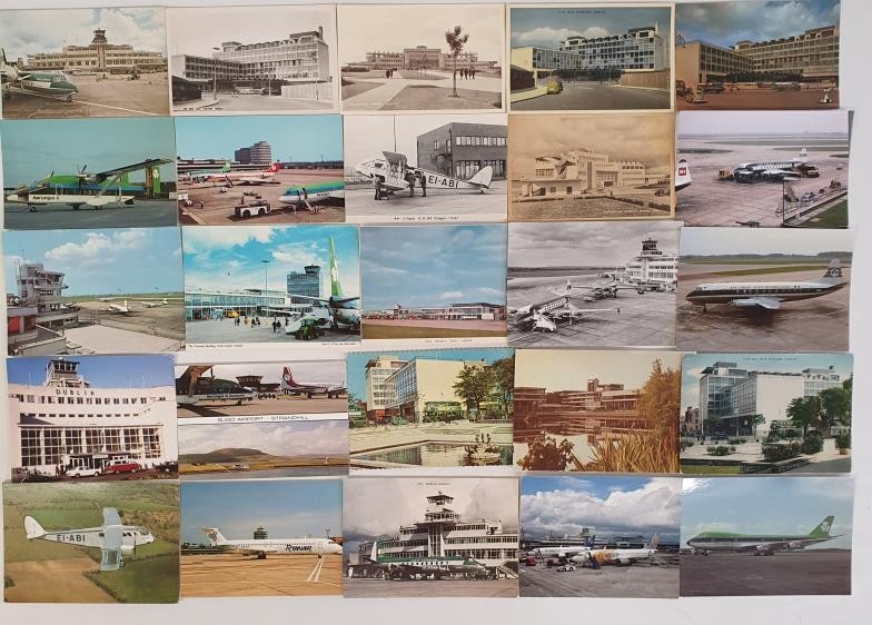 Irish Aviation Interest Postcards. Early and historic Aer Lingus and Ryanair panes, early views of Dublin Airport etc, plus 2 cards of Bus Aras. Colour and black and white. Collection of approximately 40 individual blank postcards