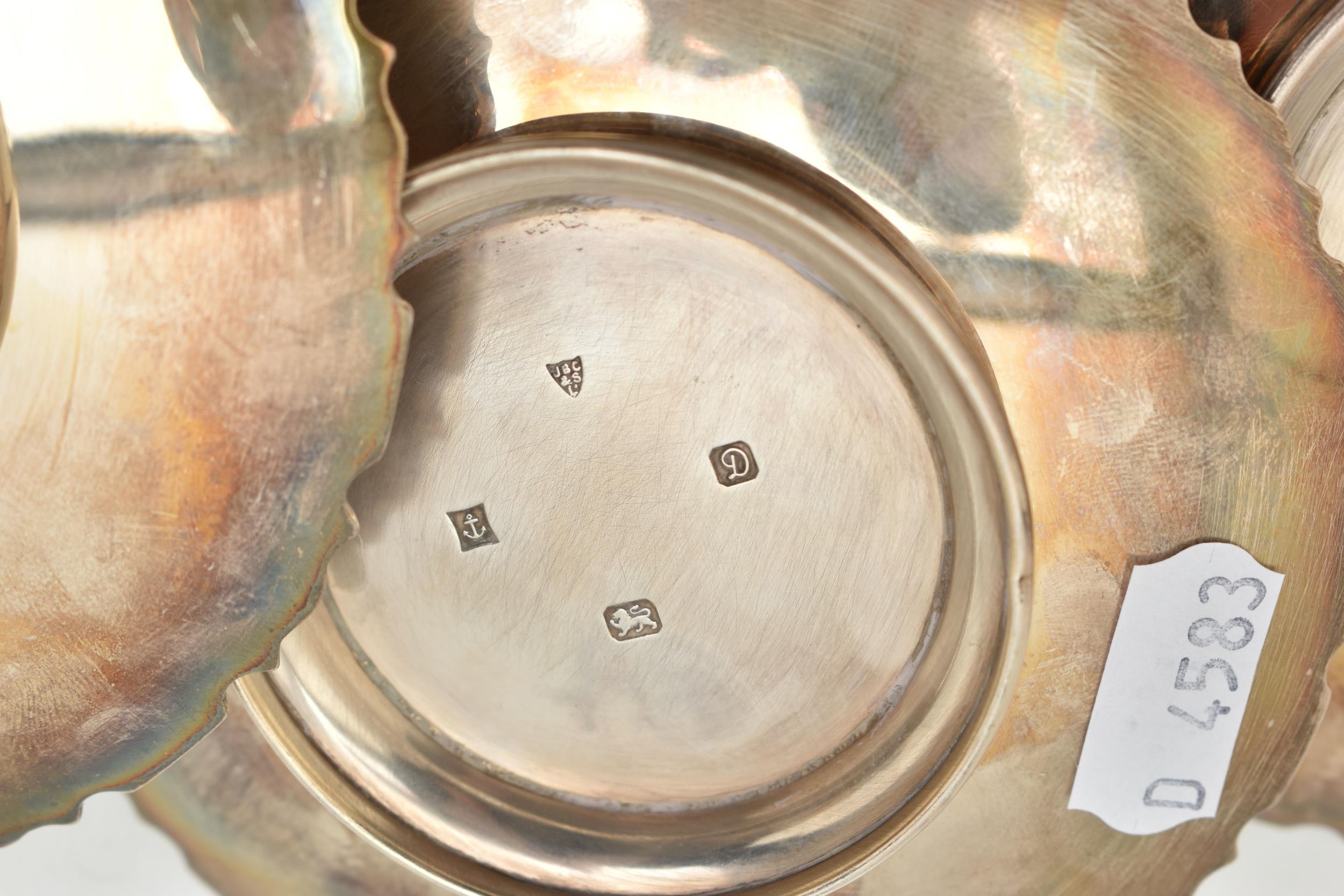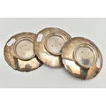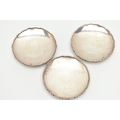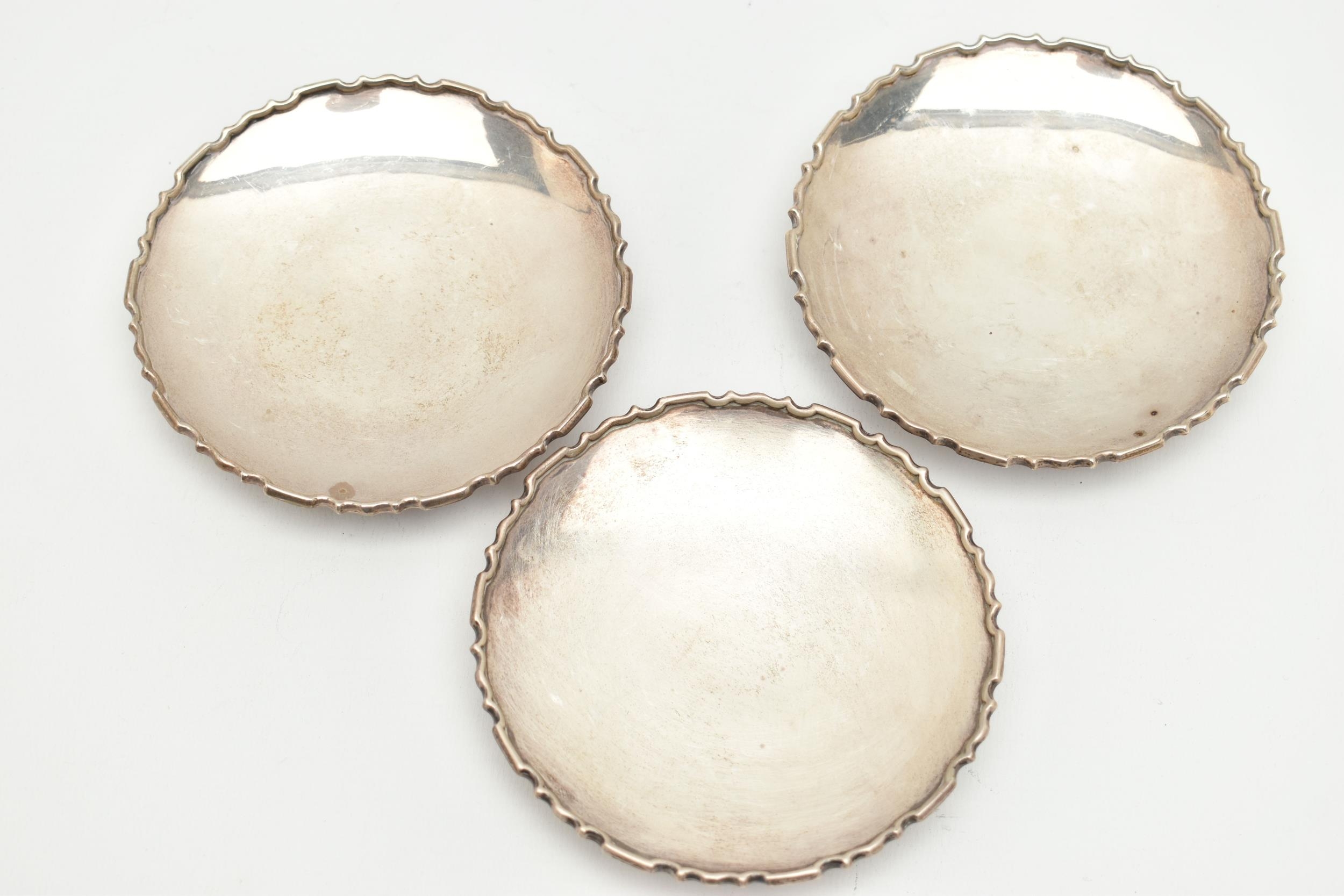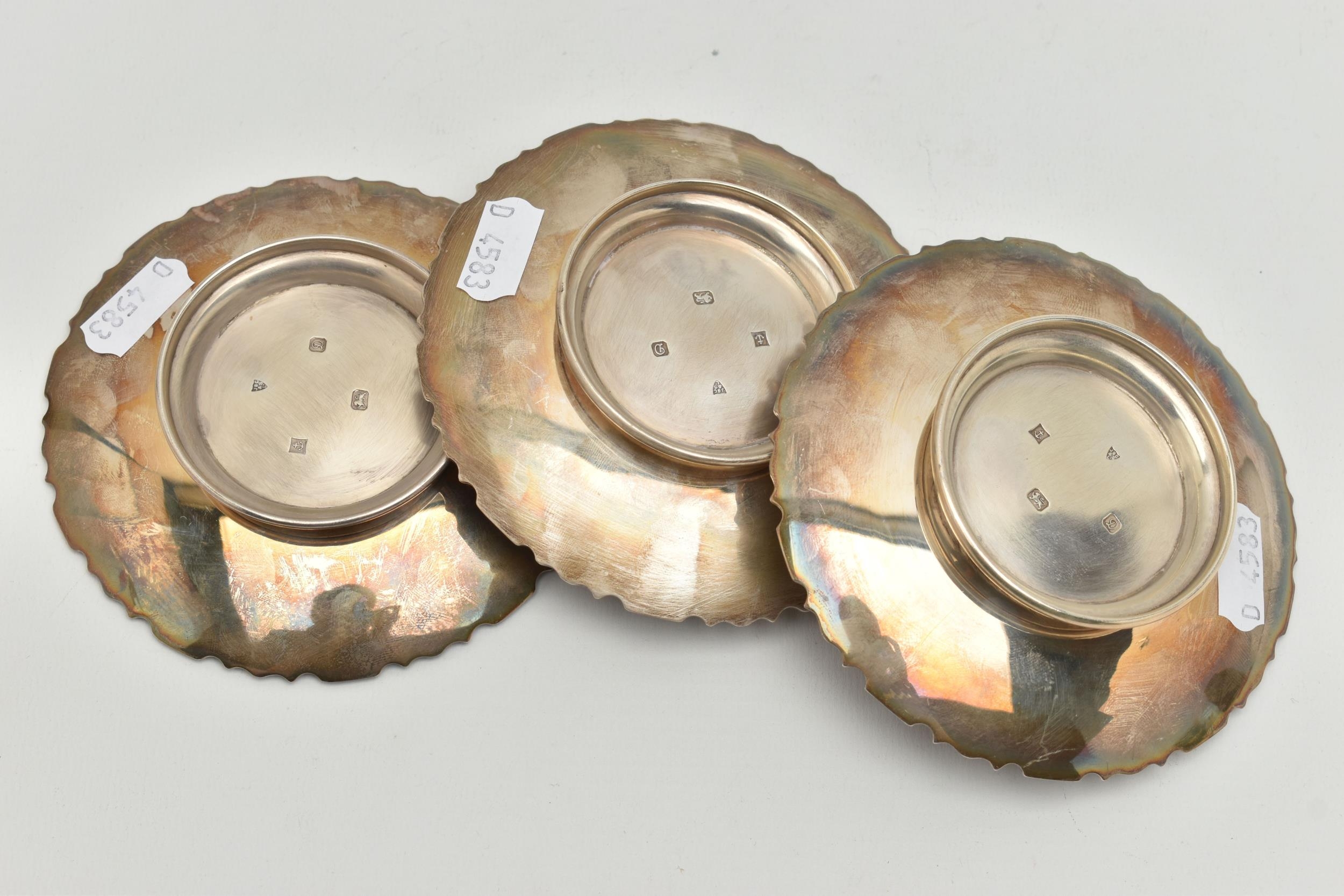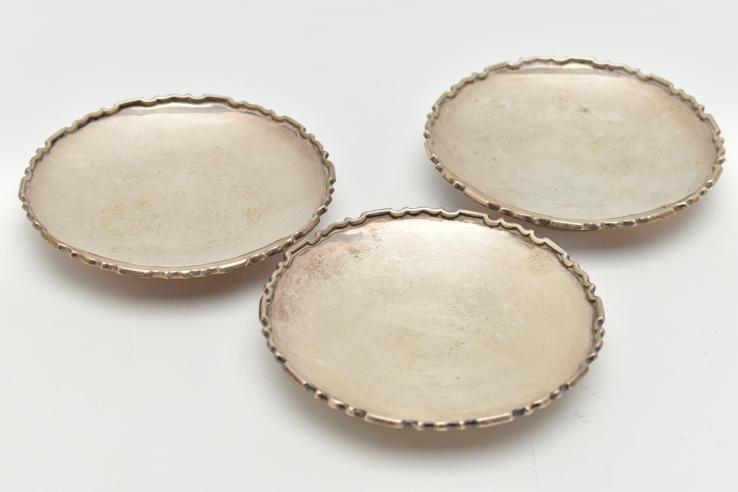 A SELECTION OF THREE SILVER DISHES, each dish with geometric design border, approximate diameter of dishes 113mm, hallmarked 925 silver Birmingham 1978, sponsors mark JBC & S ltd, approximate gross weight 282.92 grams (condition report: overall condition good, tarnish, scratches general wear present)