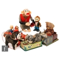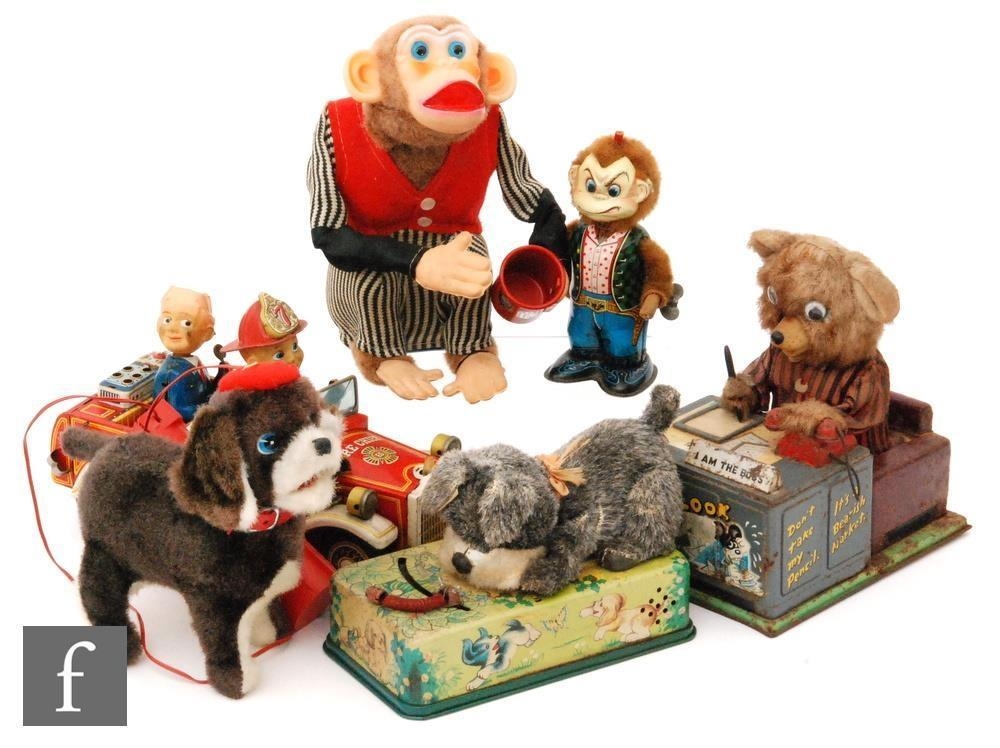 A collection of Japanese tinplate and plastic toys to include a Nomura Playful Puppy, a Cragstan Crap Shooting Monkey, a Yonezawa Walking Monkey Cowboy, a Linemar Busy Secretary and three others, A/F. (7)