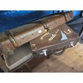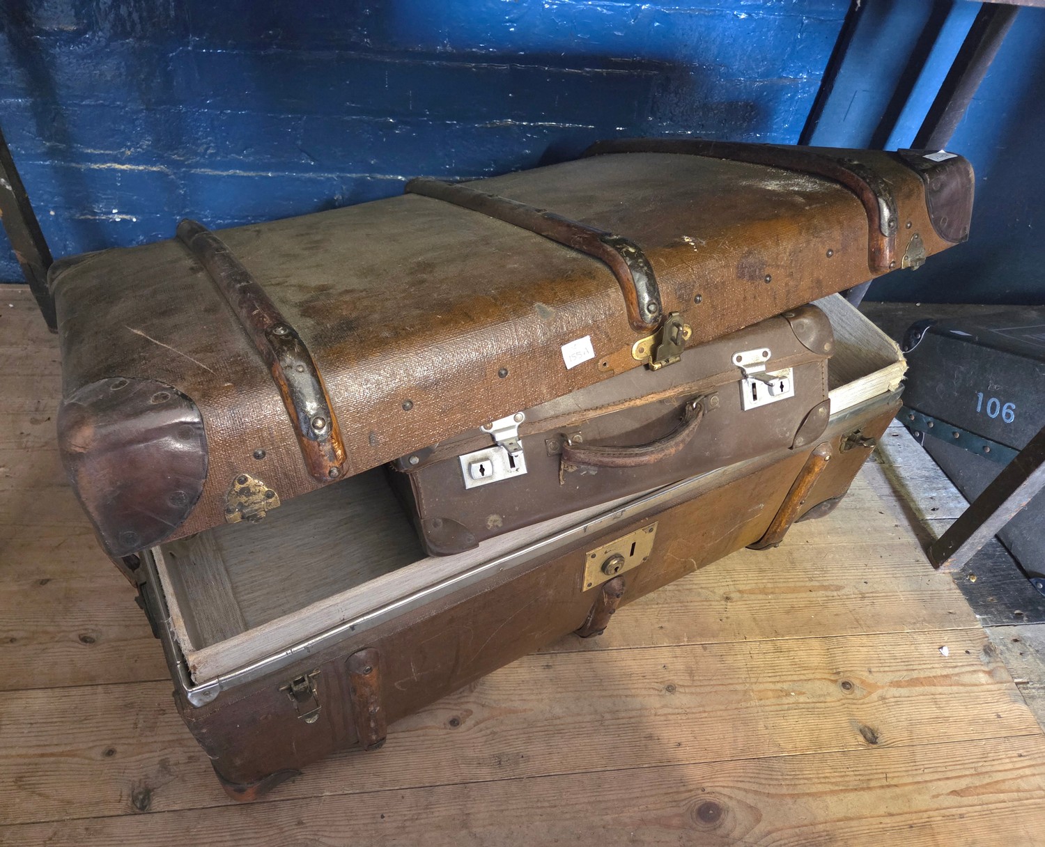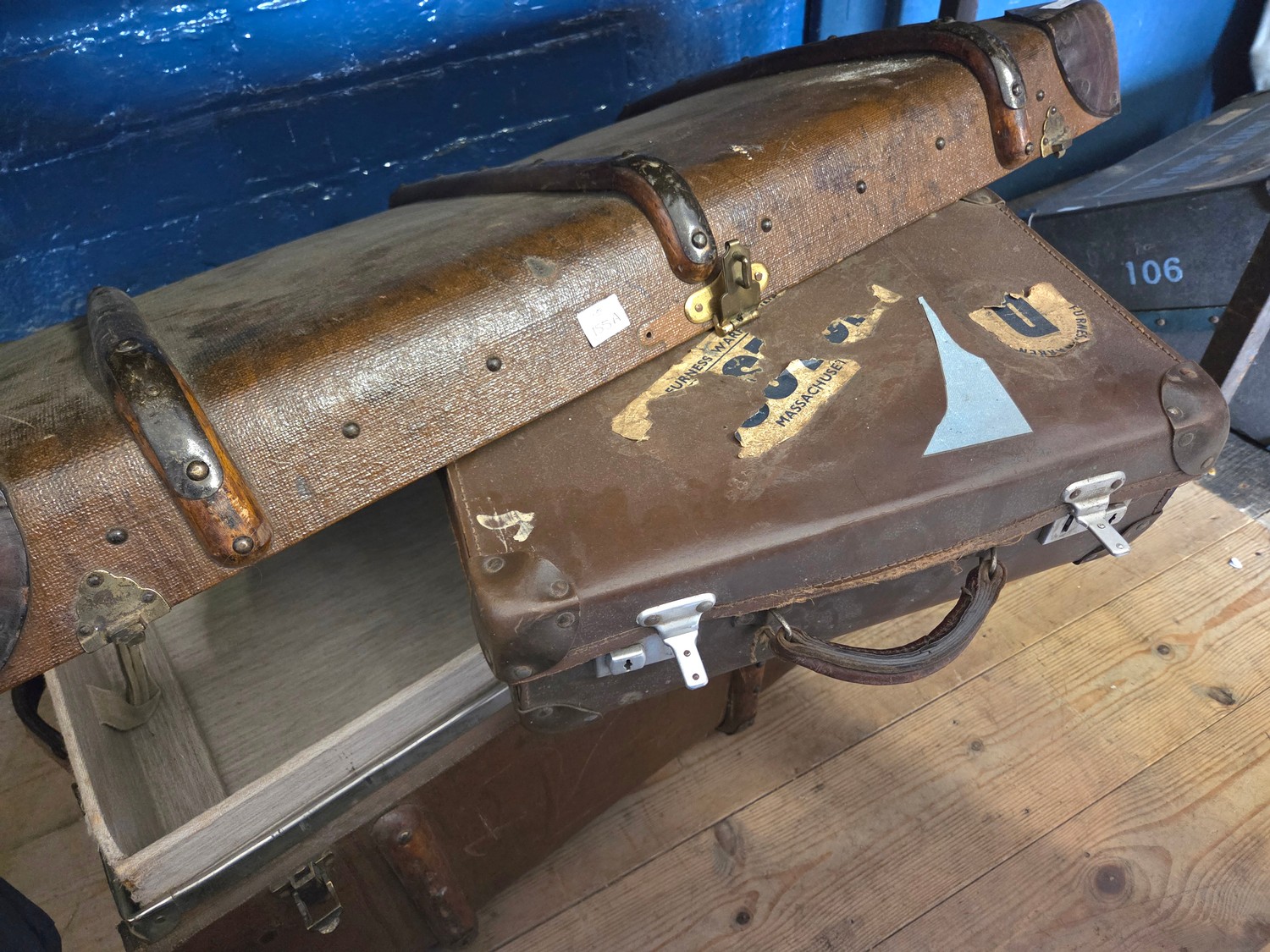 Vintage ribbed cabin trunk with internal tray and small leather boxed suitcase with Furness Warren Line luggage labels