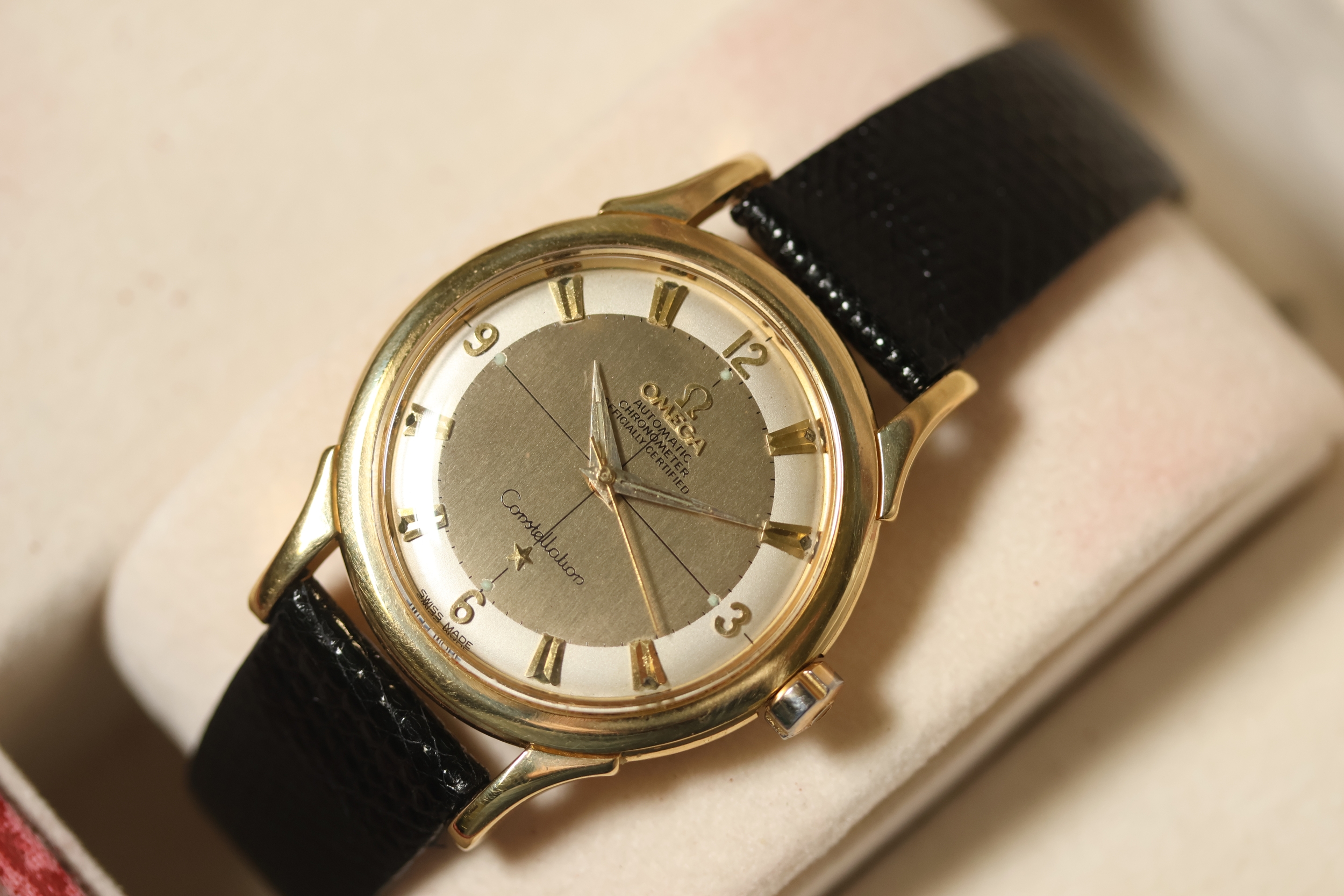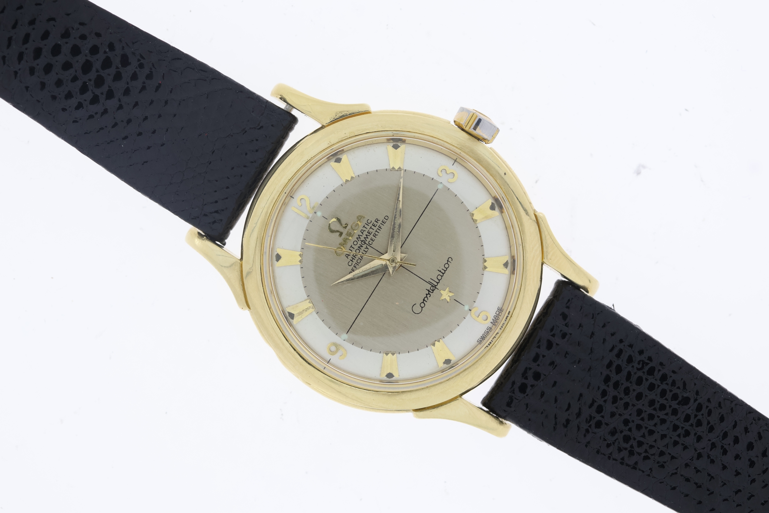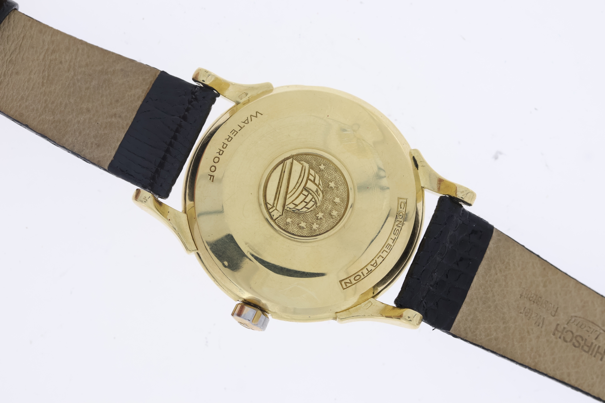 Omega Constellation Automatic Dress Watch W/Box Circa 1950's. Approx 35mm 18ct Yellow Gold case with snap on case back. Champagne 'crosshair' dial with gold hands and arabic numerals. Omega signed crown. Omega Calibre.505. 19 Jewels. Ref 2852/2853 Comes with a later Omega box. Currently Running.
