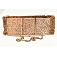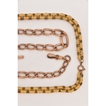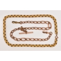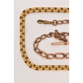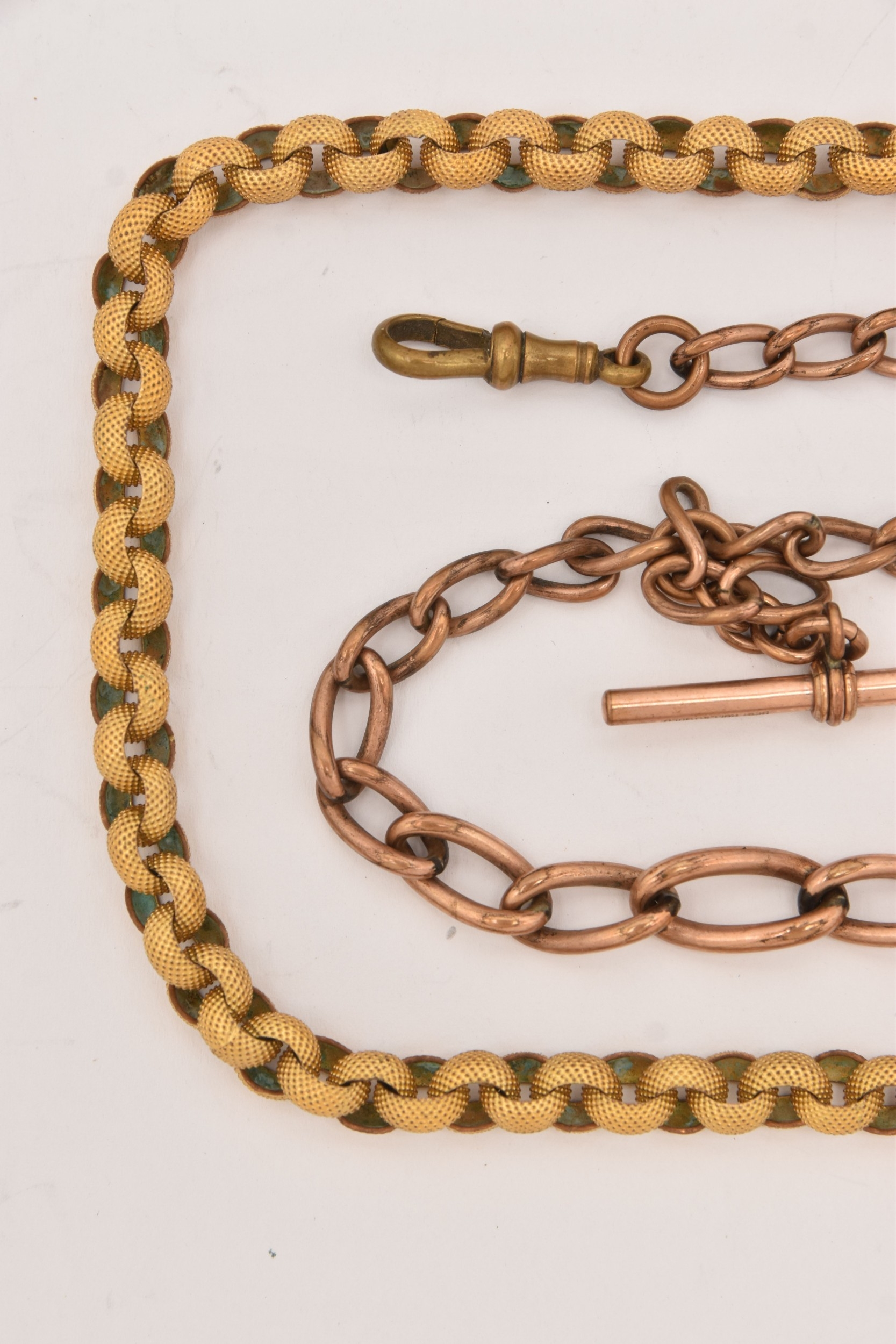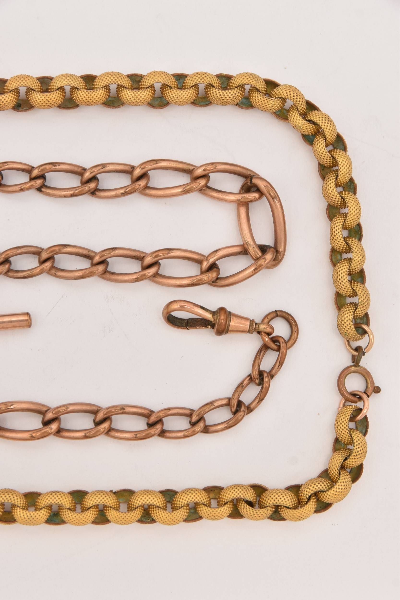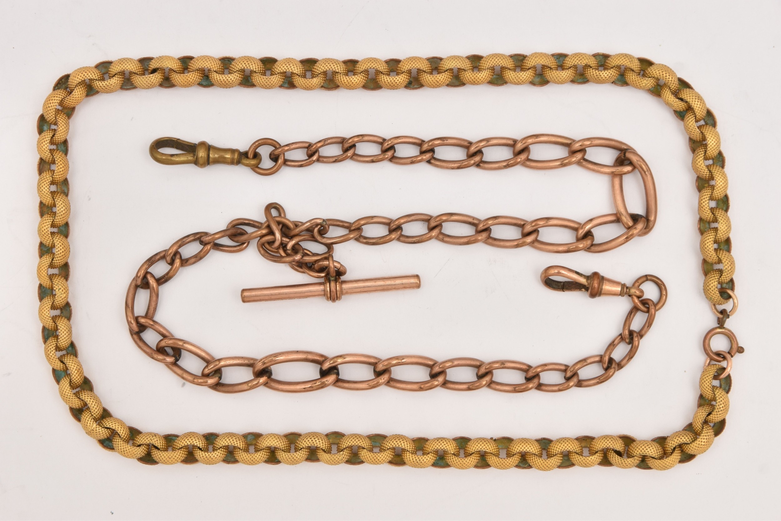 AN ALBERT CHAIN AND BELCHER CHAIN, a rolled gold, elongated curb link Alber chain fitted with a T bar, a lobster clasp and a replacement lobster clasp, together with a pinchbeck textured wide belcher link chain, fitted with a replacement clasp, (condition report: general moderate wear, some repair work carried out)