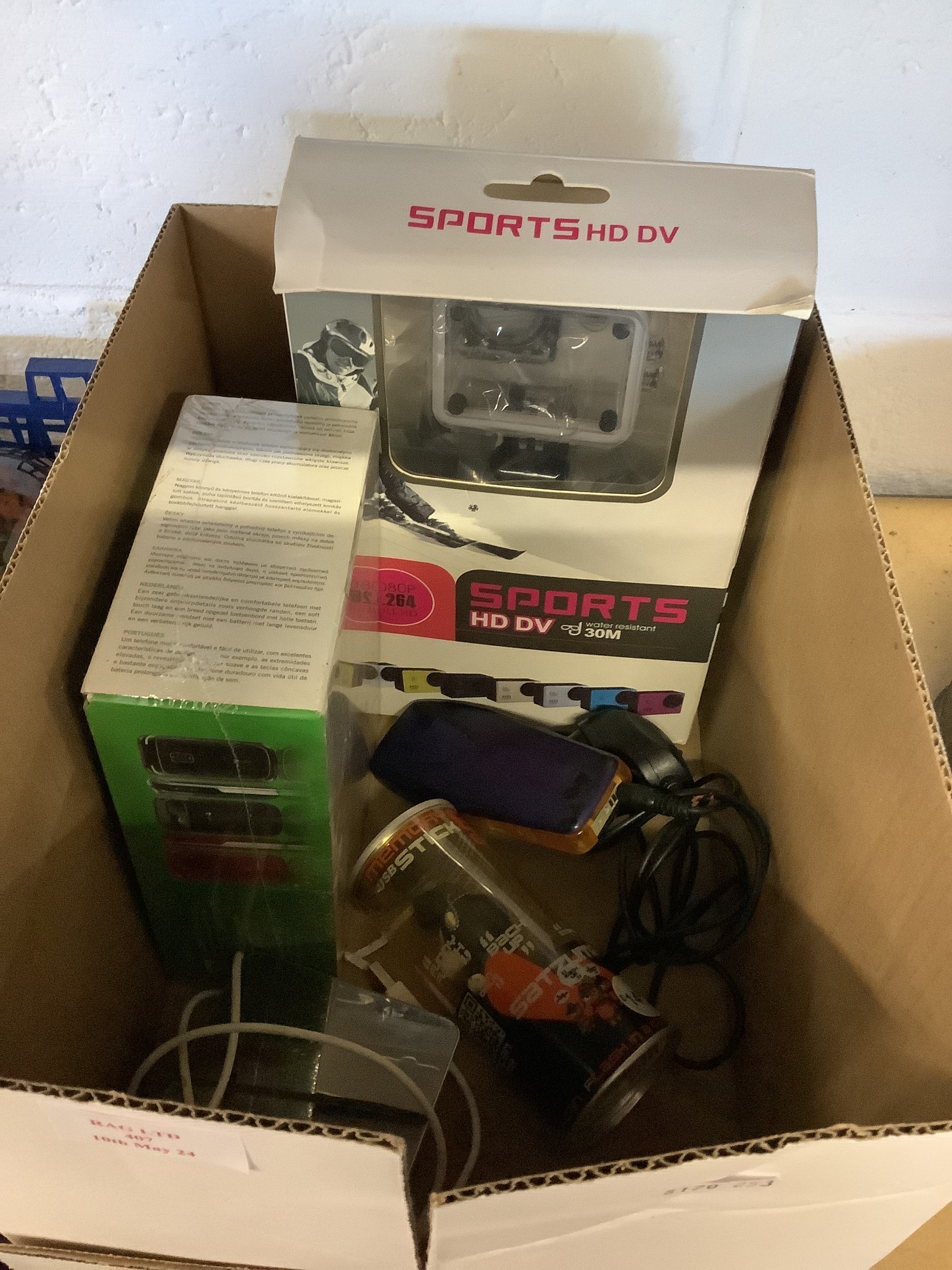 A selection of tech to include a Sports HD DV waterproof camera, an unopened Doro easy mobile phone etc