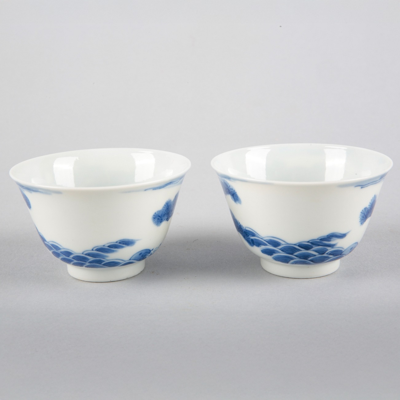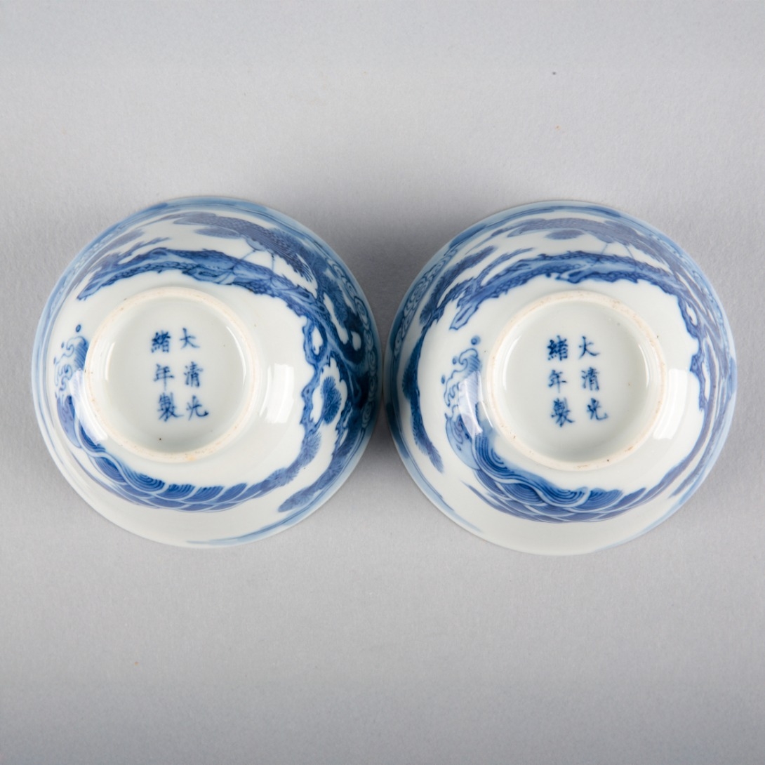 bearing six character Guangxu marks to the base and probably of the period, each decorated with herons in a tree above a racing sea, 4.5cm high x 7.5cm diameter (2)