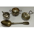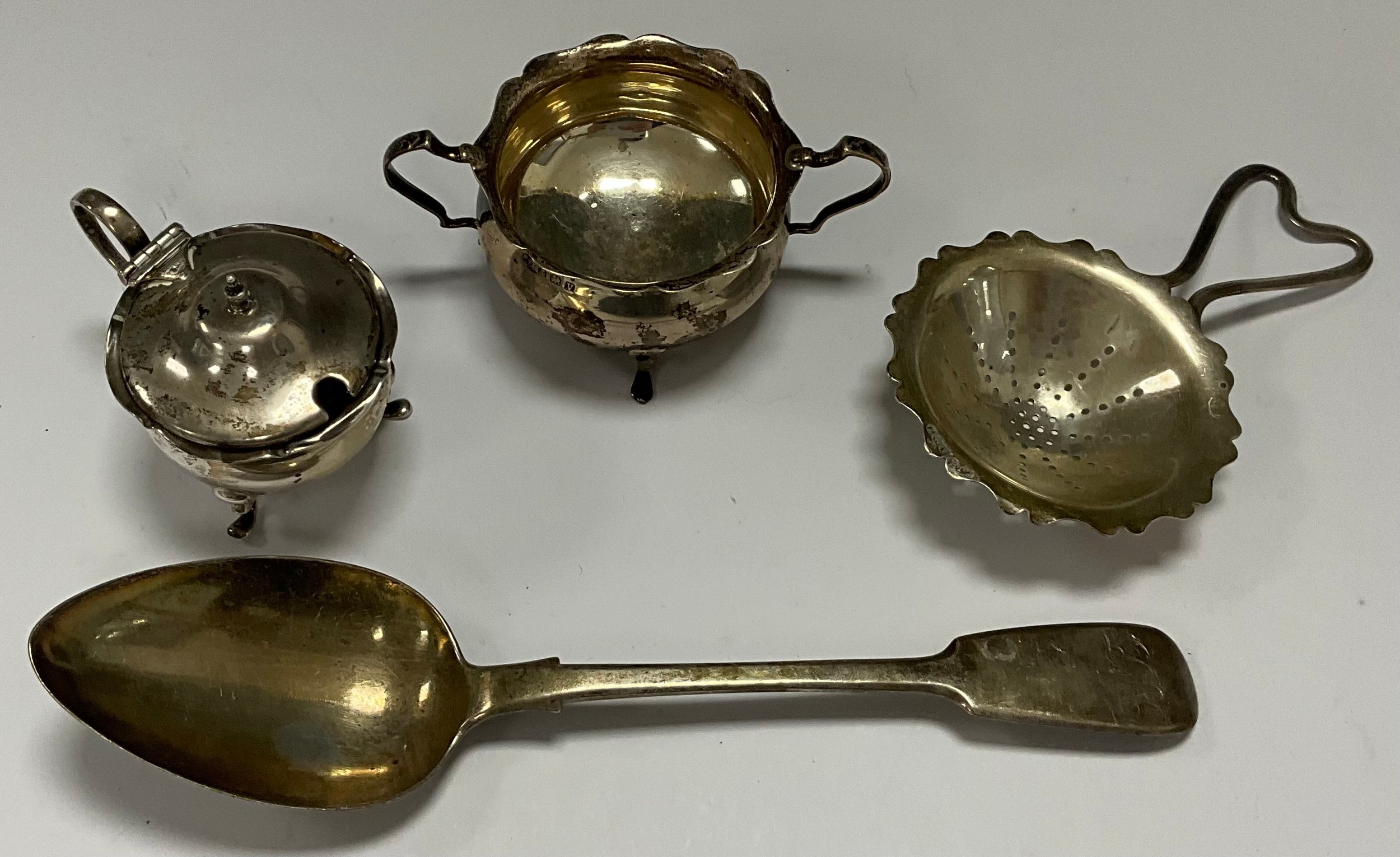 A Victorian silver Old English pattern basting spoon, 22.5cm long, London 1839; a George V silver salt, Birmingham 1920; silver mustard, sugar sifter, 195g (4)