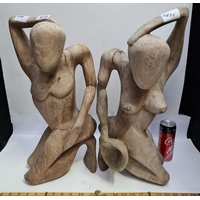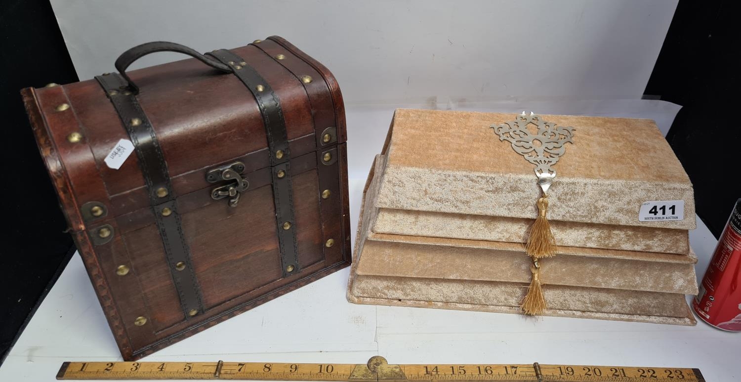 A wooden chest with leather straps and 2 textured decorative boxes