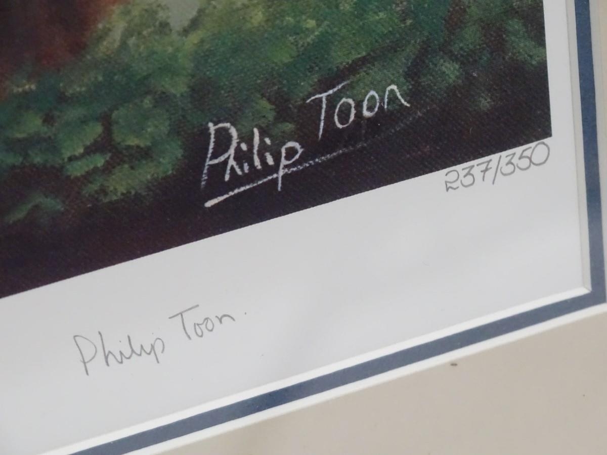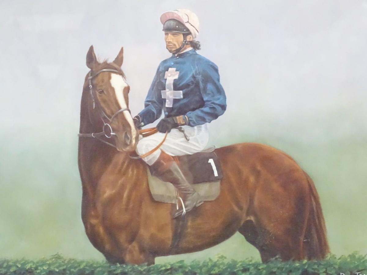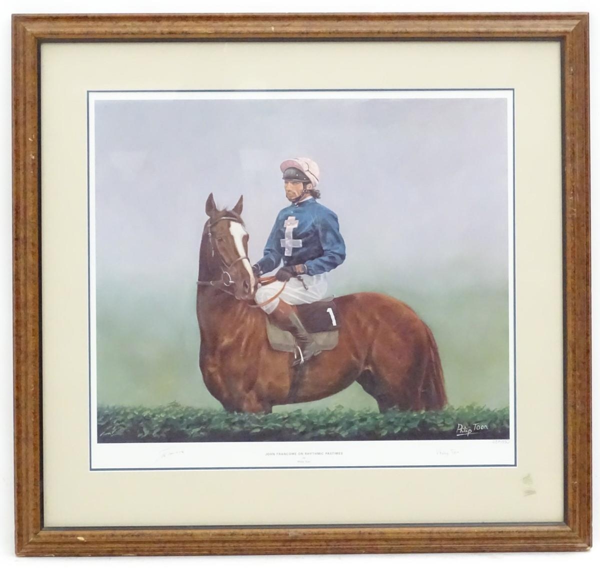 After Philip Toon, XX, Signed limited edition print no. 237/350, Horse racer John Francombe on Rythmic Pastimes. Titled, signed by artist and jockey and numbered under. Approx. 17 1/4" x 19 3/4''