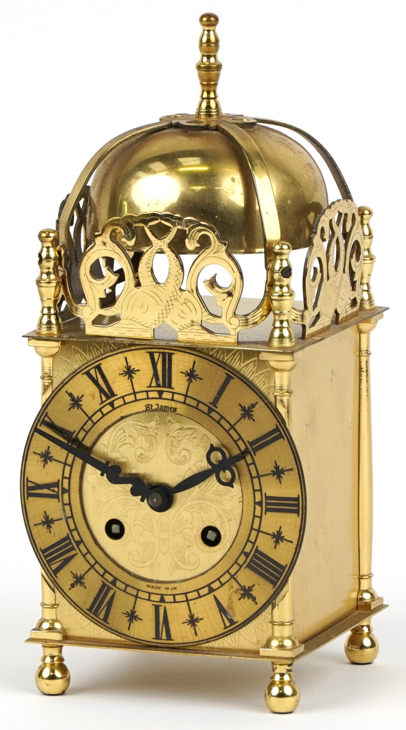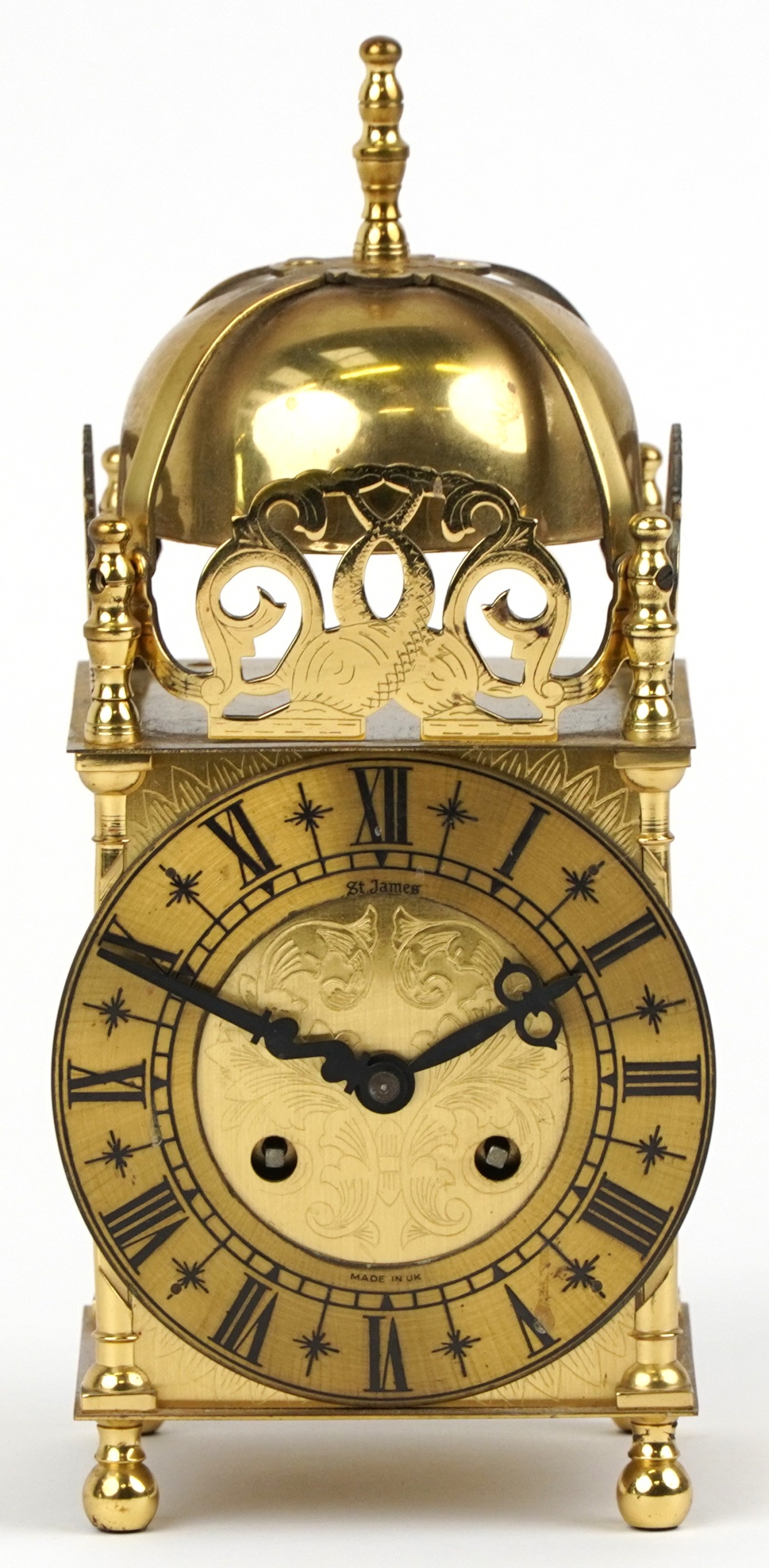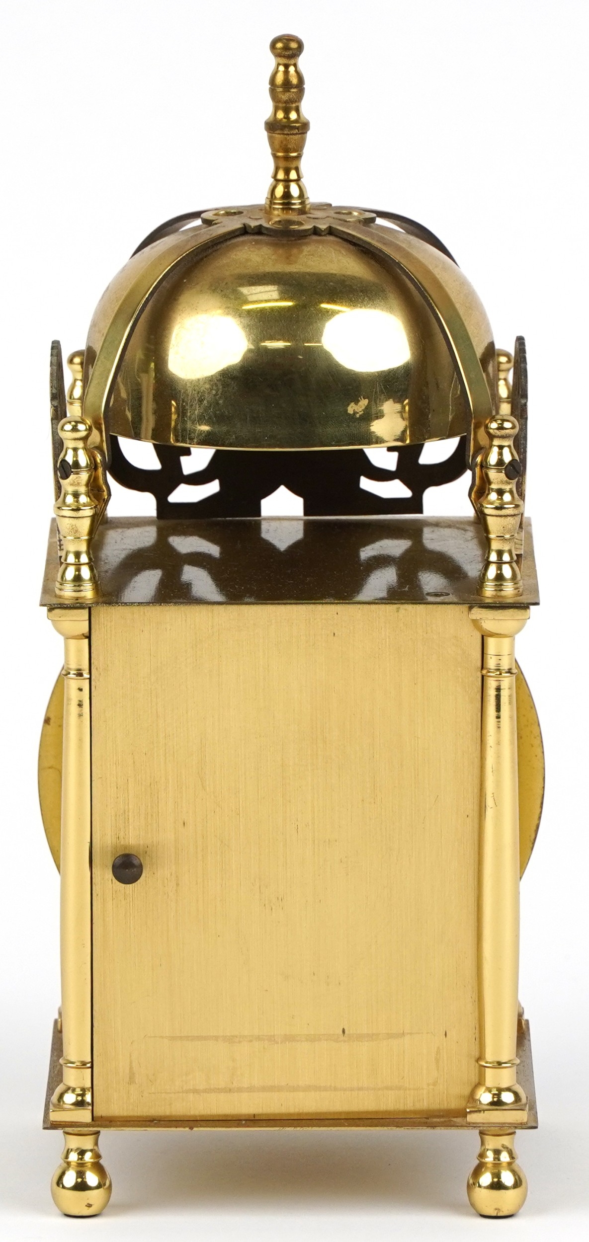 An Aug Schatz & Sohne brass lantern clock having an engraved dial with Roman numerals and pierced frieze, 23cm high.