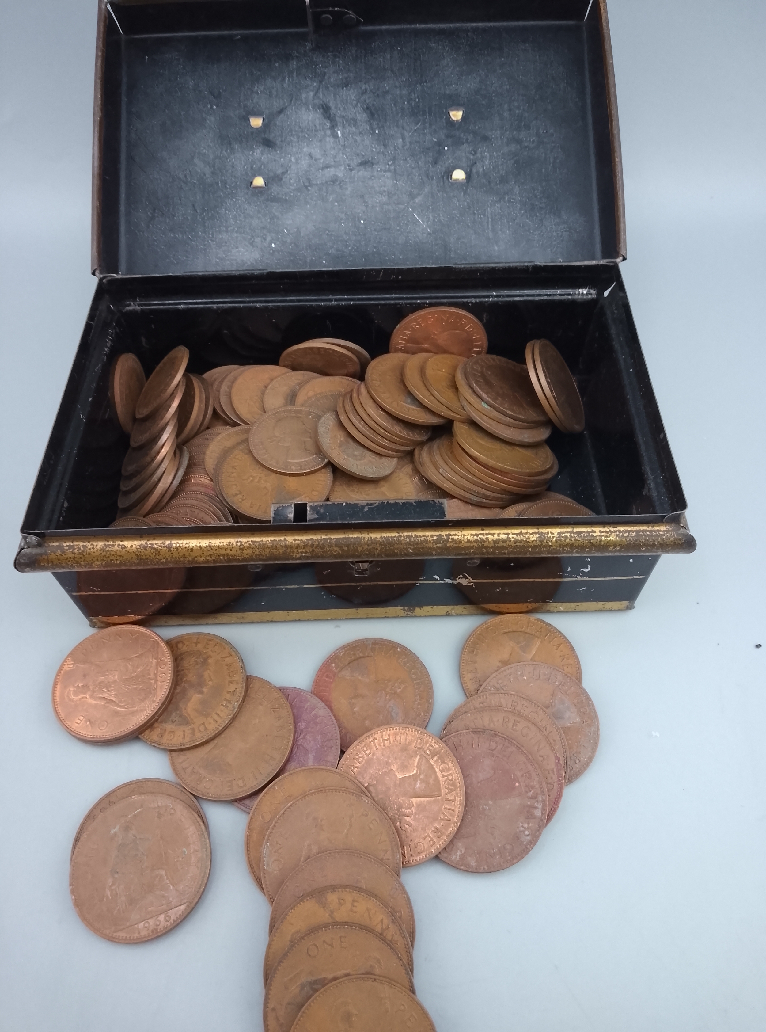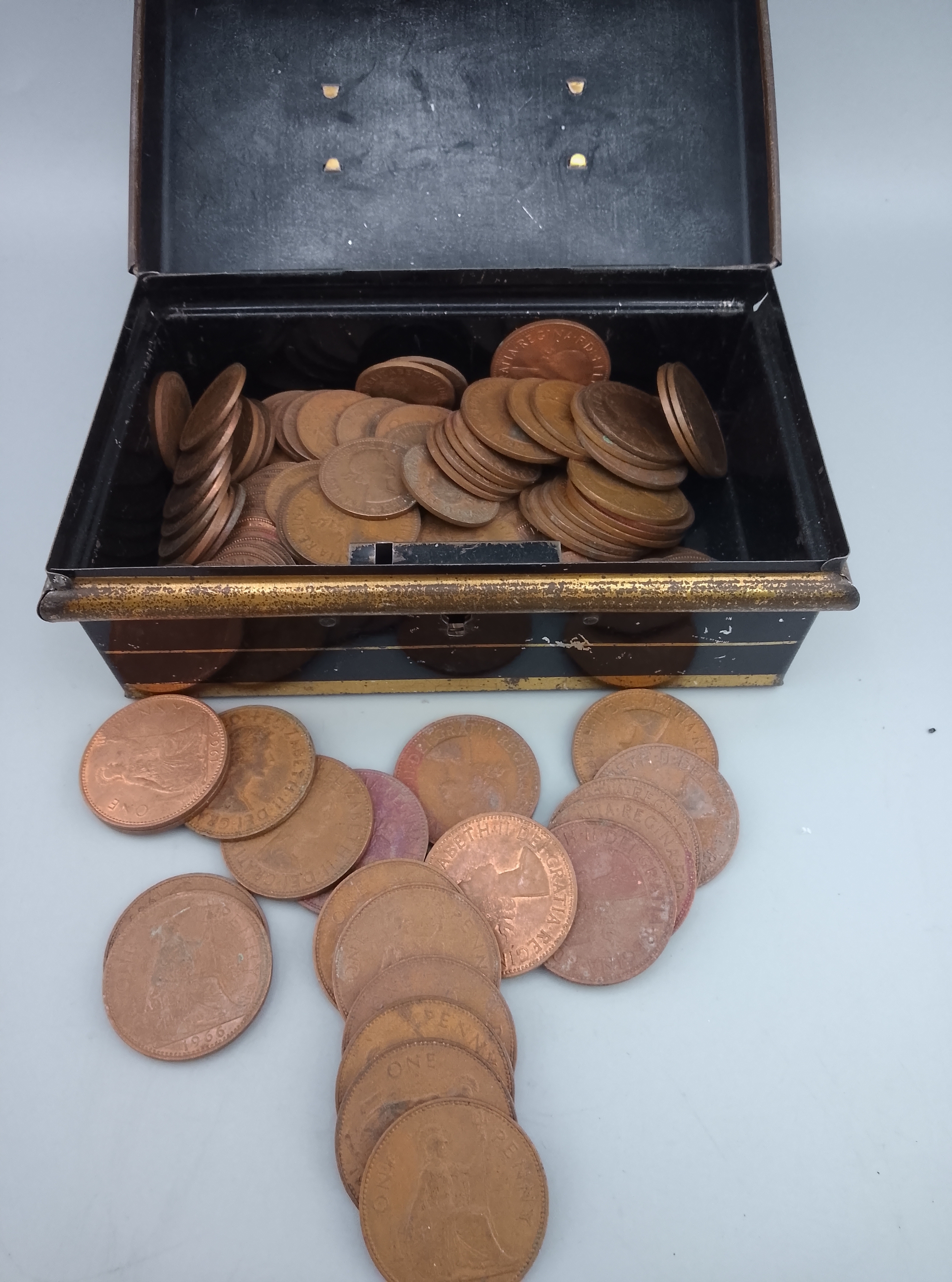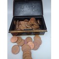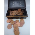 Vintage Money Box Savings Tin No Key Black Red Gold Full of old Pennies and Half-Pennies