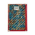 The manuscript is bound in a marbled-paper cover in rich blue tones, reinforced with red leather corners and spine. The opening folio includes a beautifully laid-out title page in black and red ink, naming the author and text with poetic flourishes and dedications.