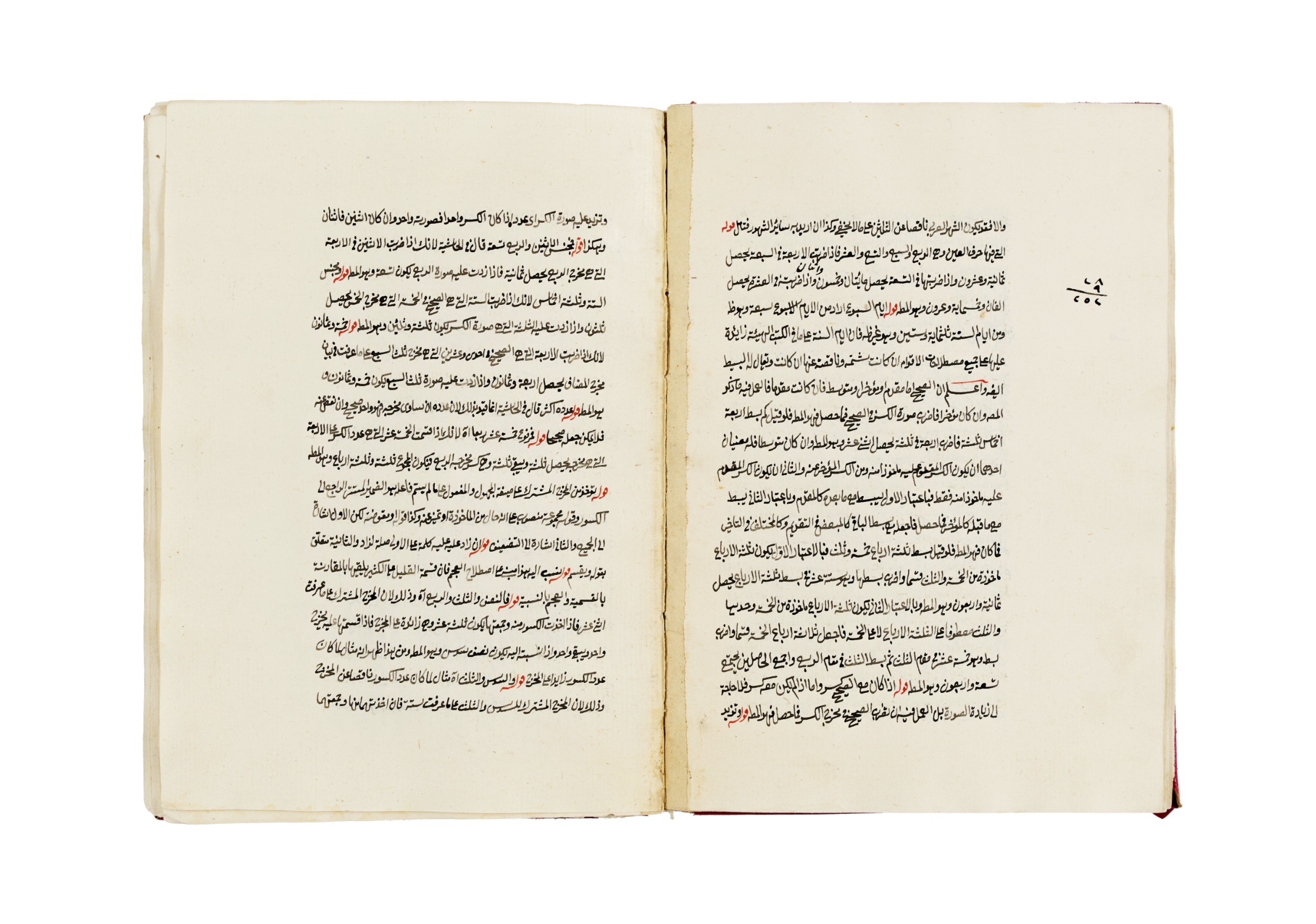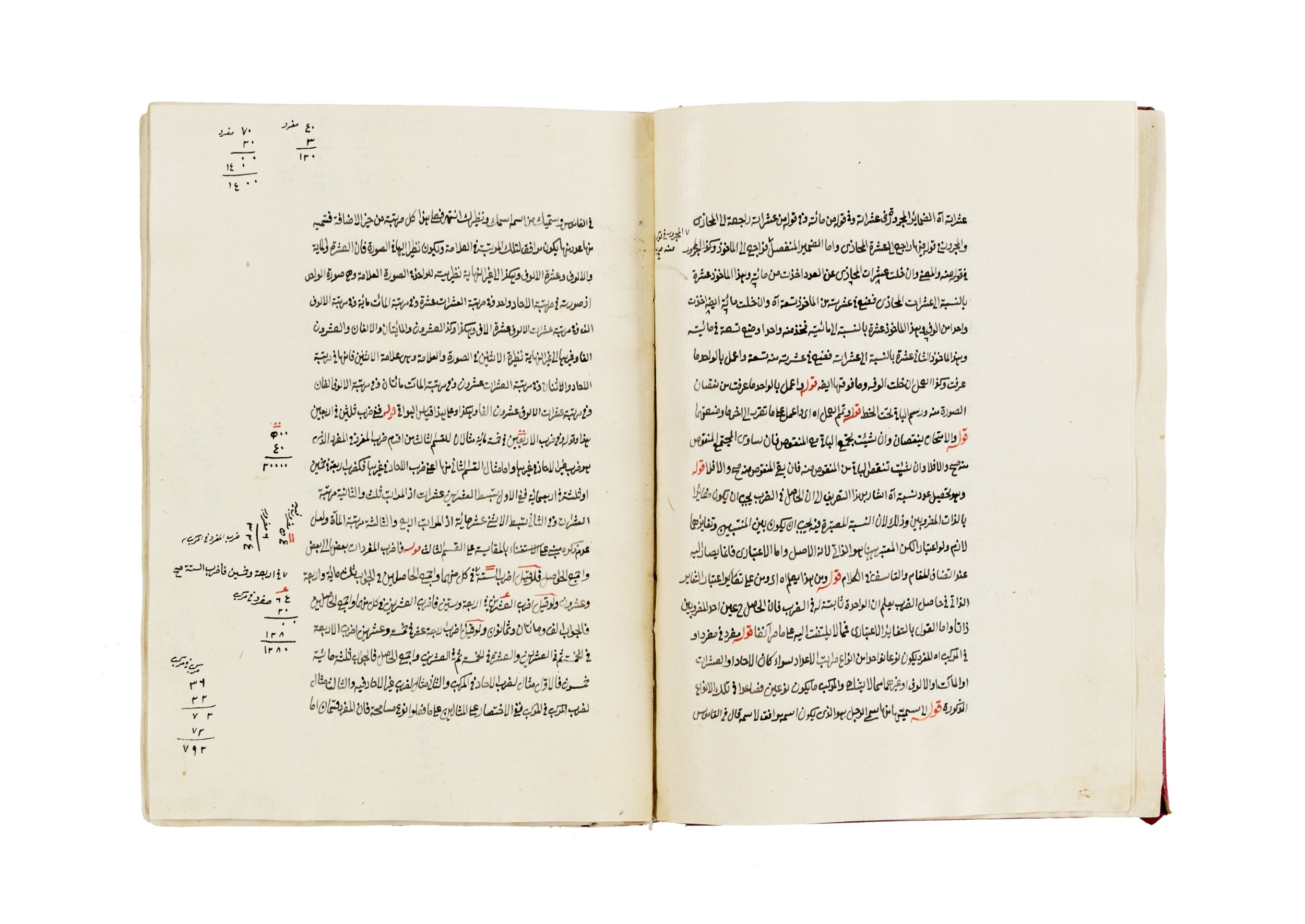 Internally, the manuscript is written in a clear naskh hand, with consistent line ruling and rubricated chapter headings. The content covers numerical principles, calculations, and applied arithmetic, organised with scholastic precision. Occasional marginal notes hint at its active use as a study text or teaching reference.