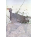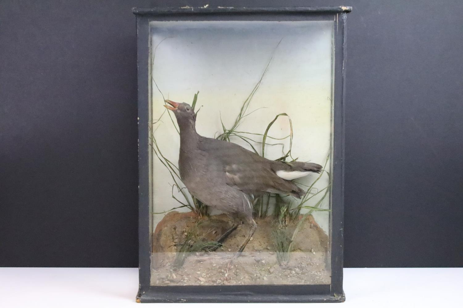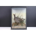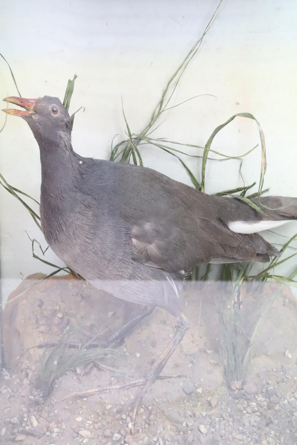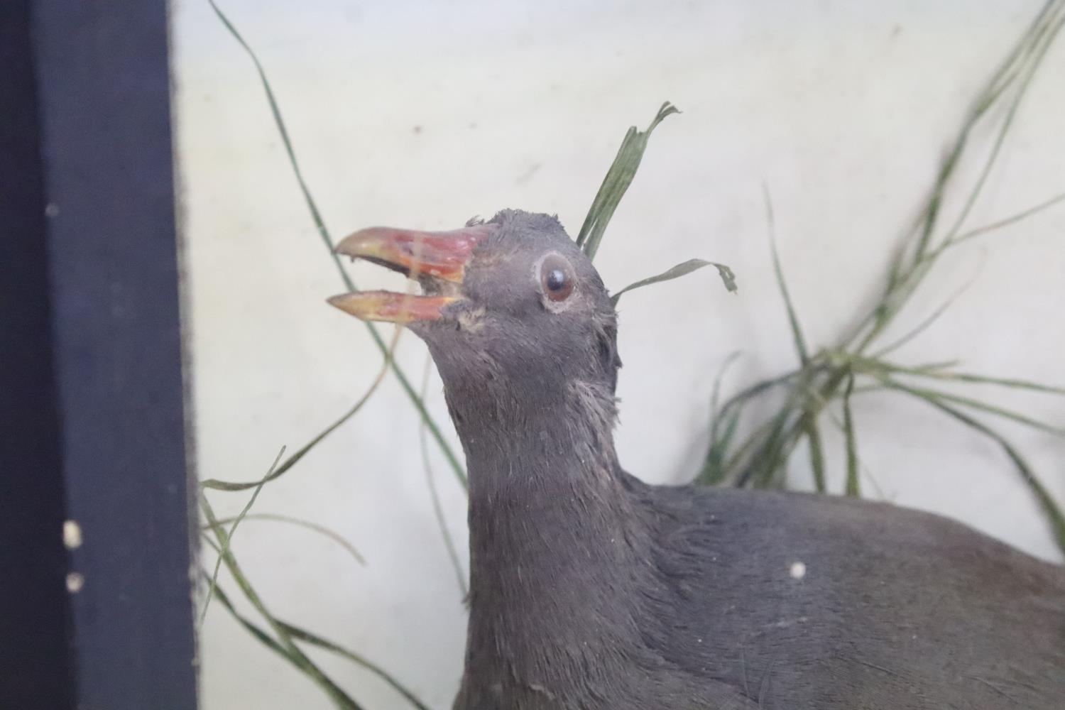 Antique cased taxidermy bird with grasses decorative surround. H 41.5cm x W 30cm x D 17cm