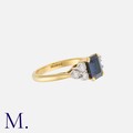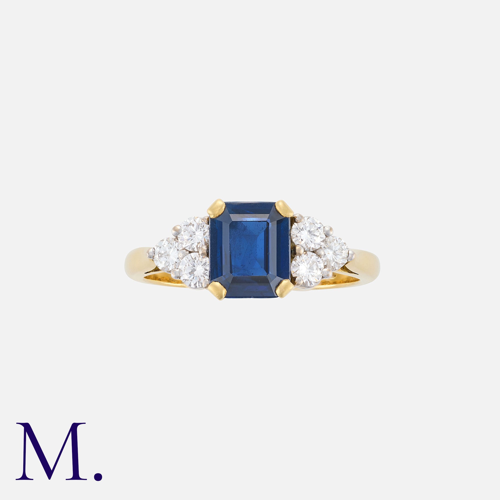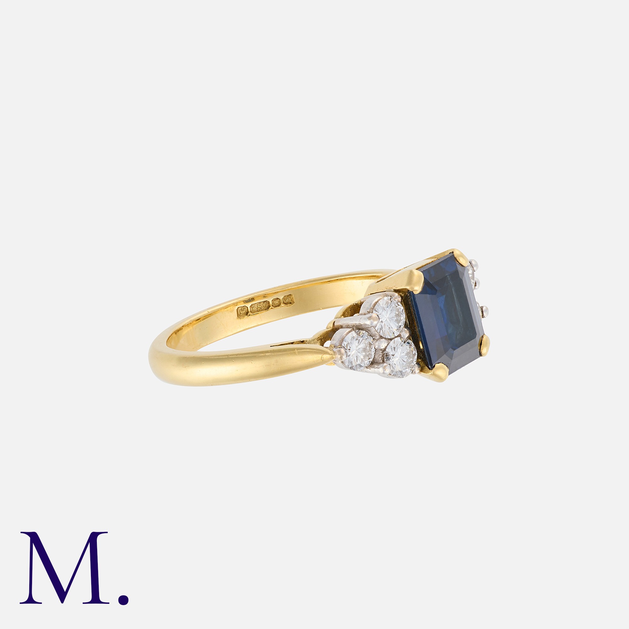 A Sapphire And Diamond Ring in 18k yellow gold, the central step cut sapphire of approximately 1.50cts flanked either side by a trio of round brilliant cut diamonds. Full British Hallmarks.