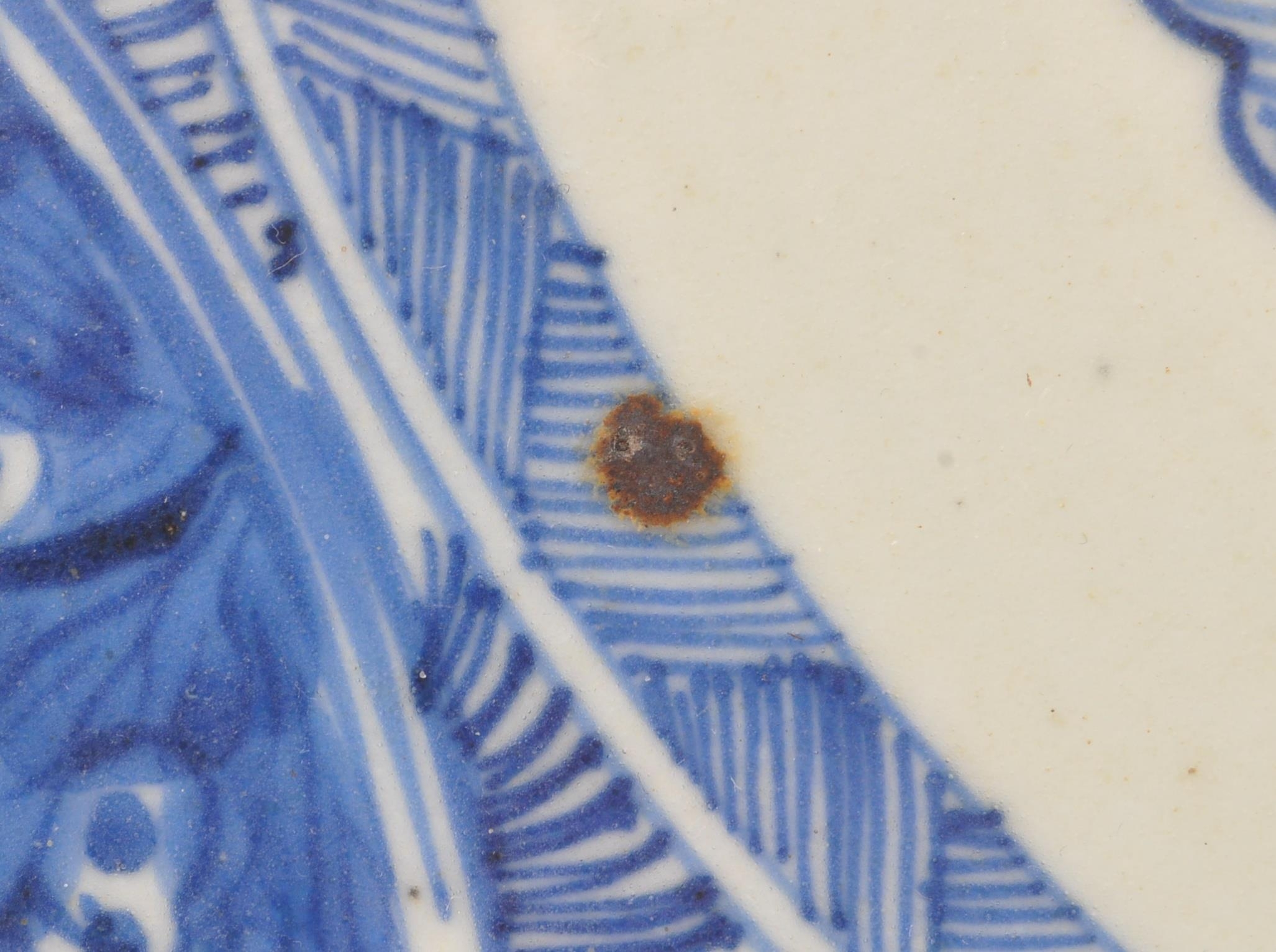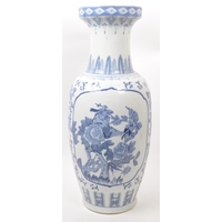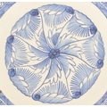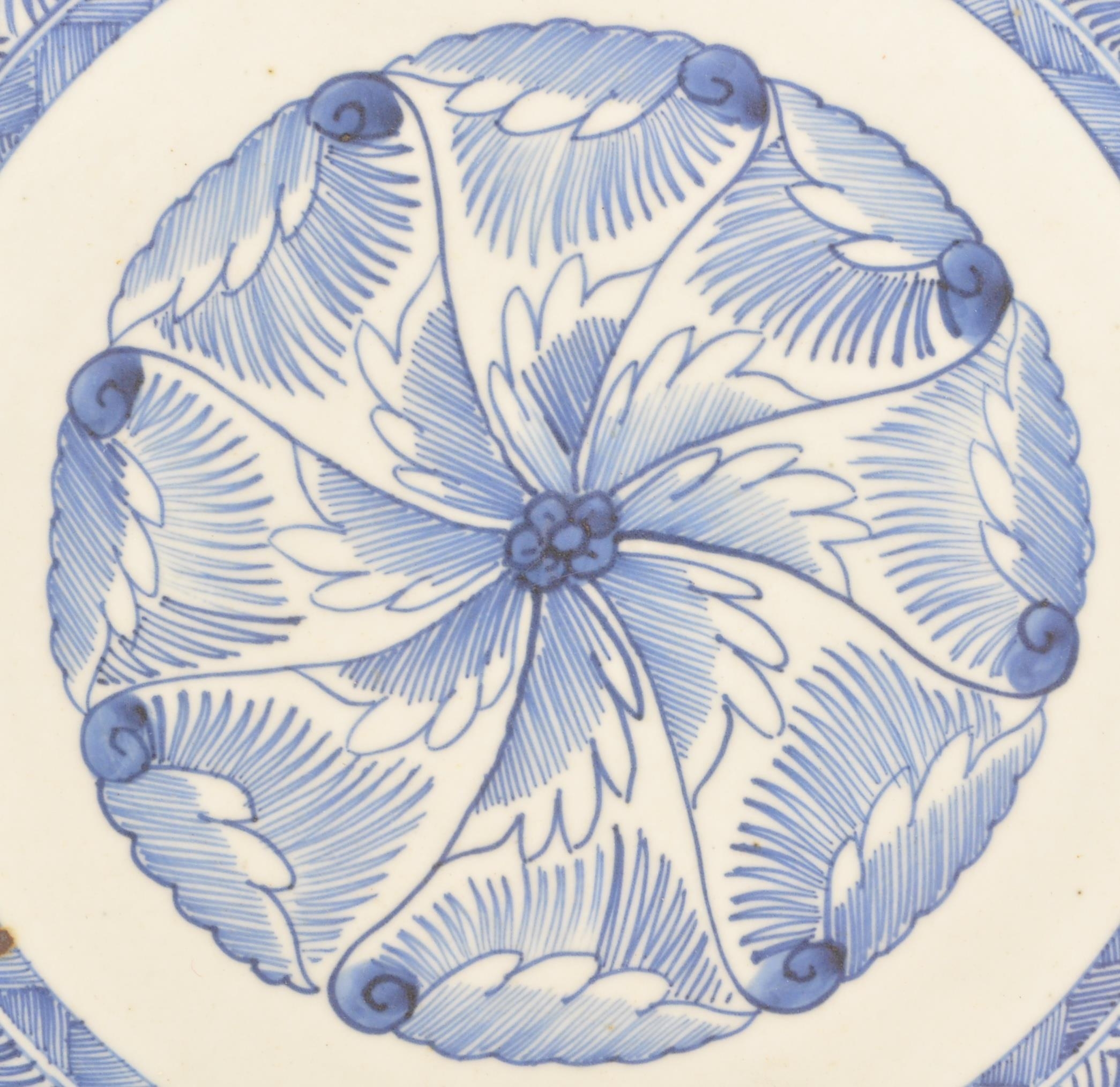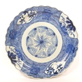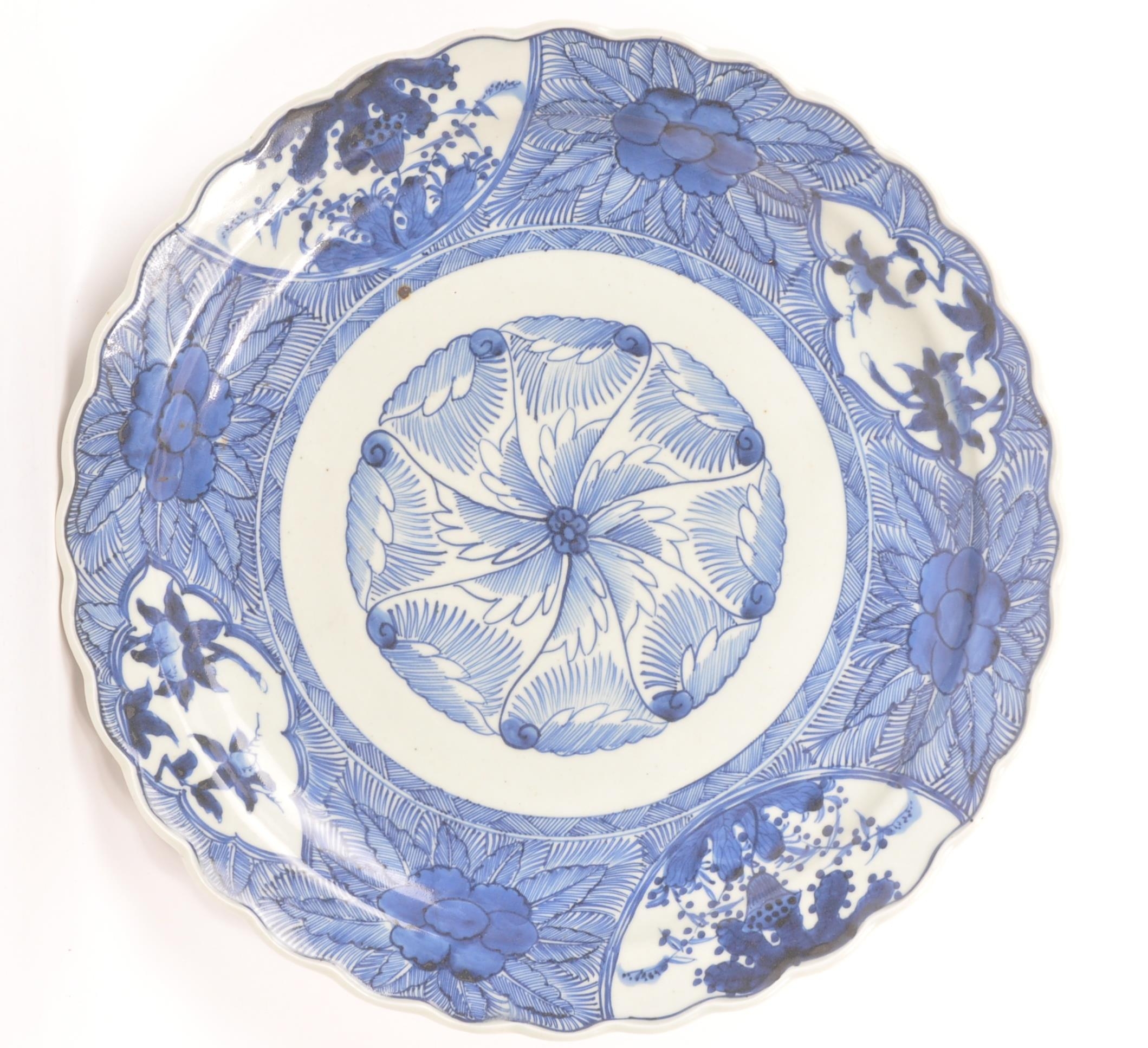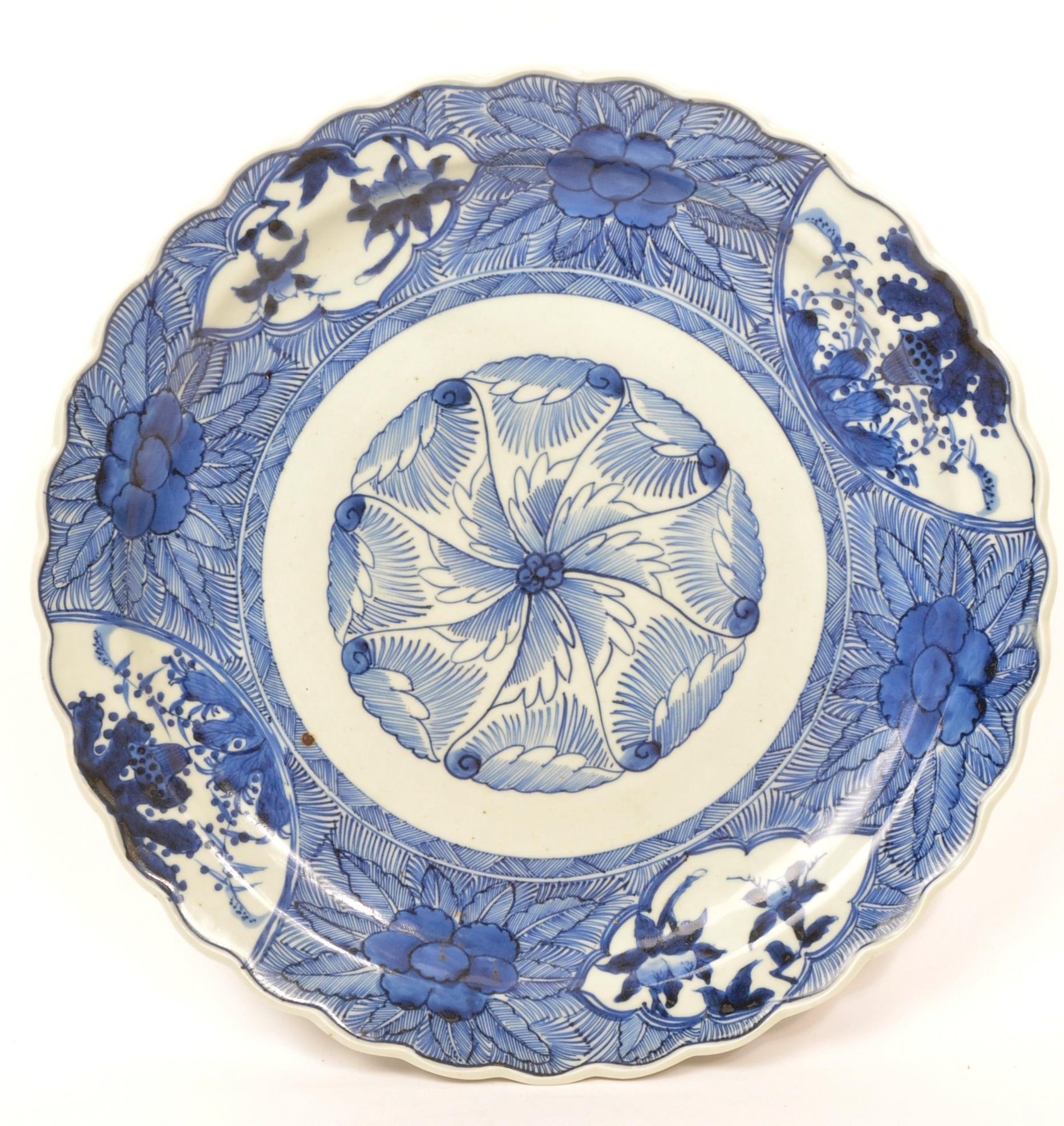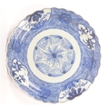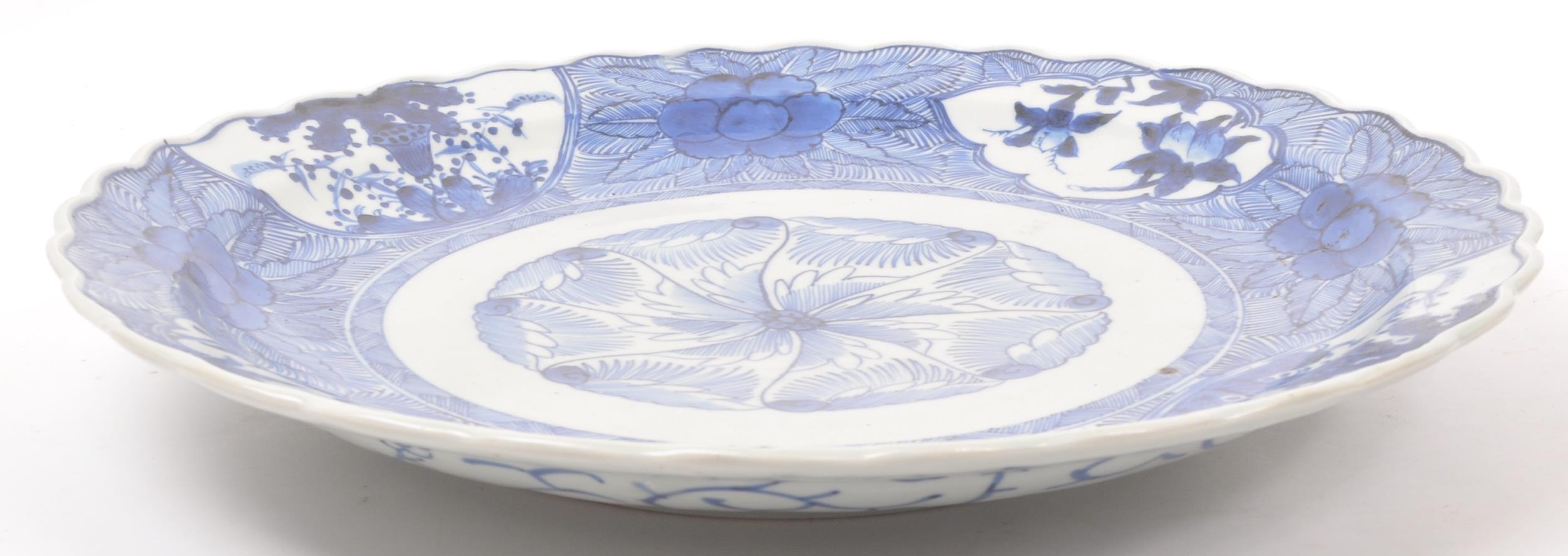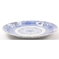 A large vintage 20th century circa 1930s Chinese Asian blue and white ceramic pottery charger. With transfer print of foliate and geometric design. 45cm diameter.