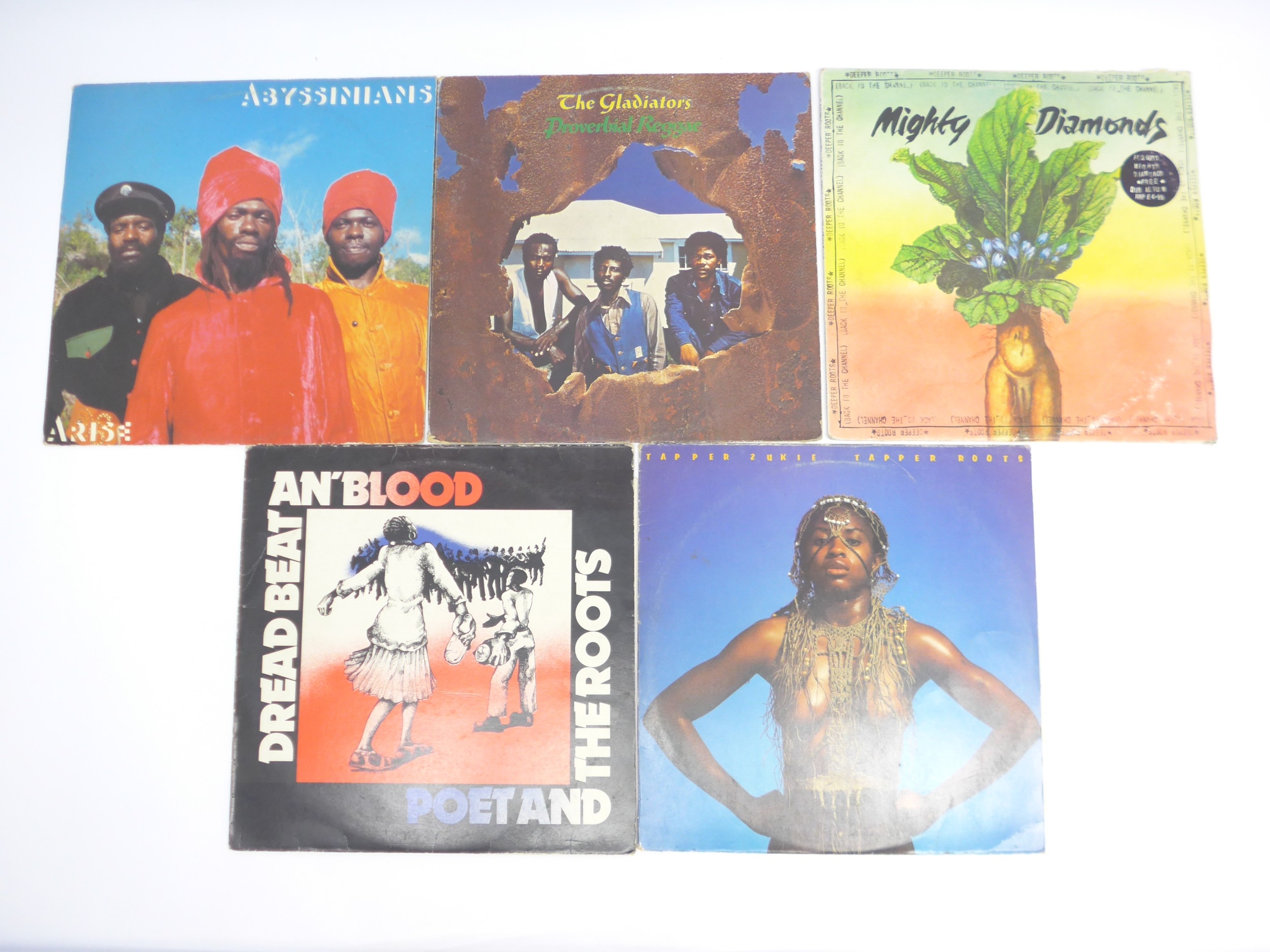 Reggae - Five LPs on the Virgin Front Line label to include ABYSSINIANS: 'Arise' with lyric insert (FL 1019), POET AND THE ROOTS: 'Dread Beat An' Blood' (FL 1017), TAPPER ZUKIE: 'Tapper Roots' (FL1032), THE GLADIATORS: 'Proverbial Reggae' (FL 1002) and MIGHTY DIAMONDS: 'Deeper Roots (Back To The Channel)' (FLD 6001) (5, vinyl VG-VG+, sleeves VG)