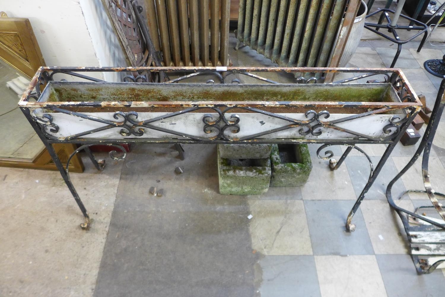 A wrought iron planter