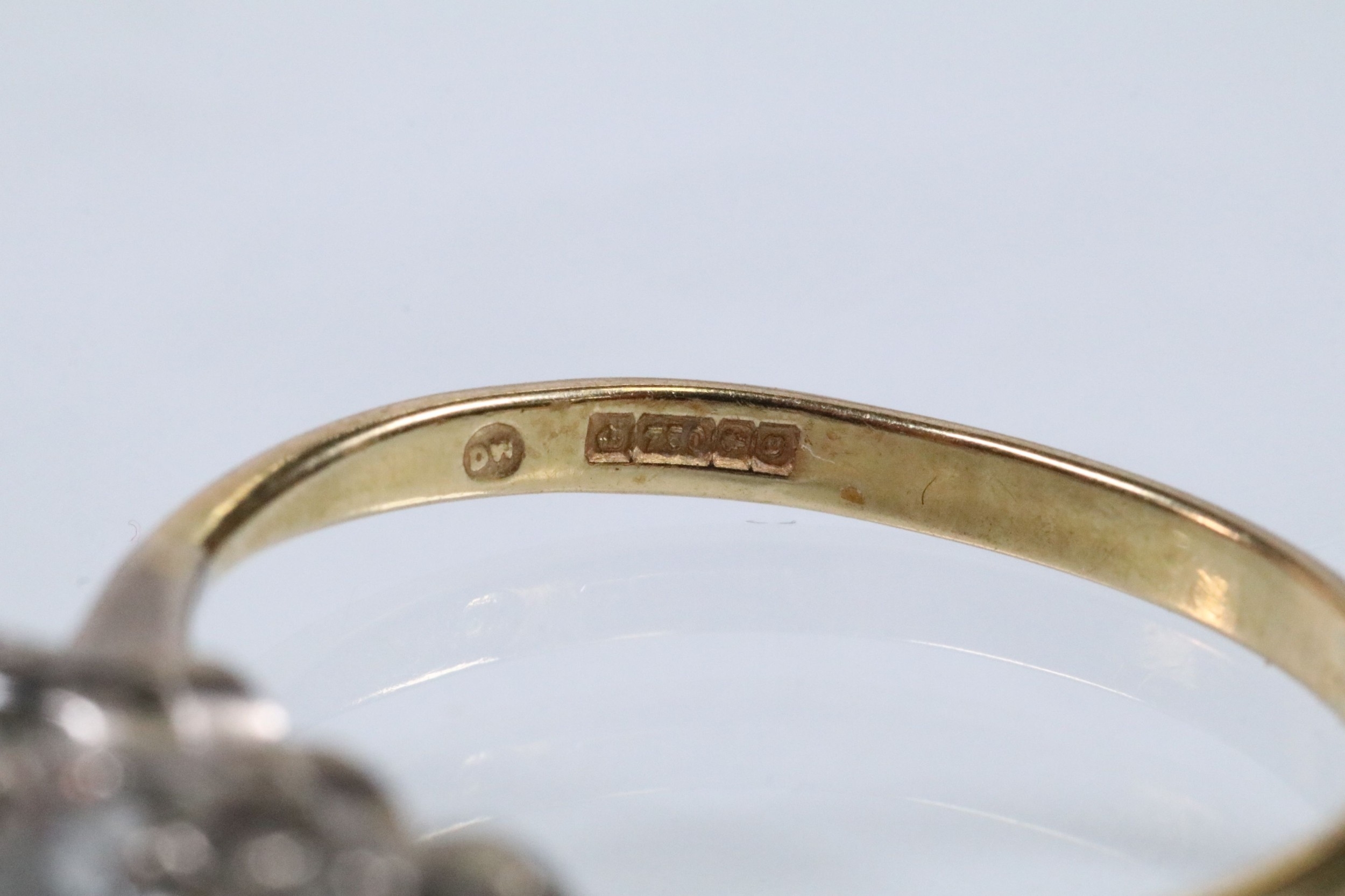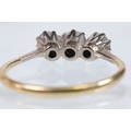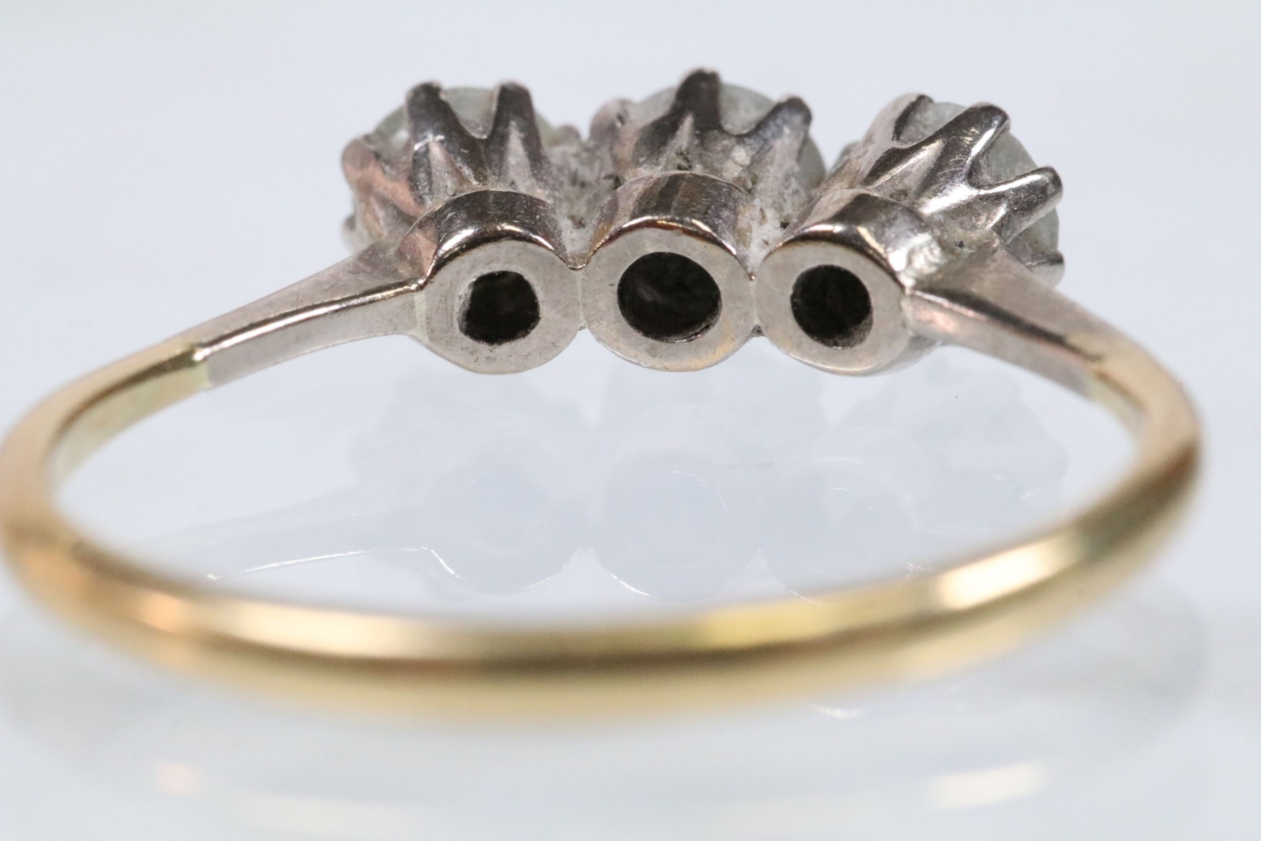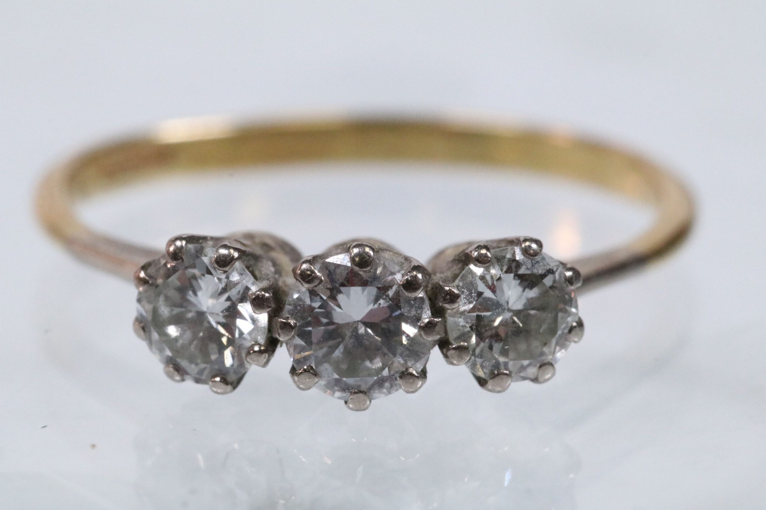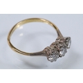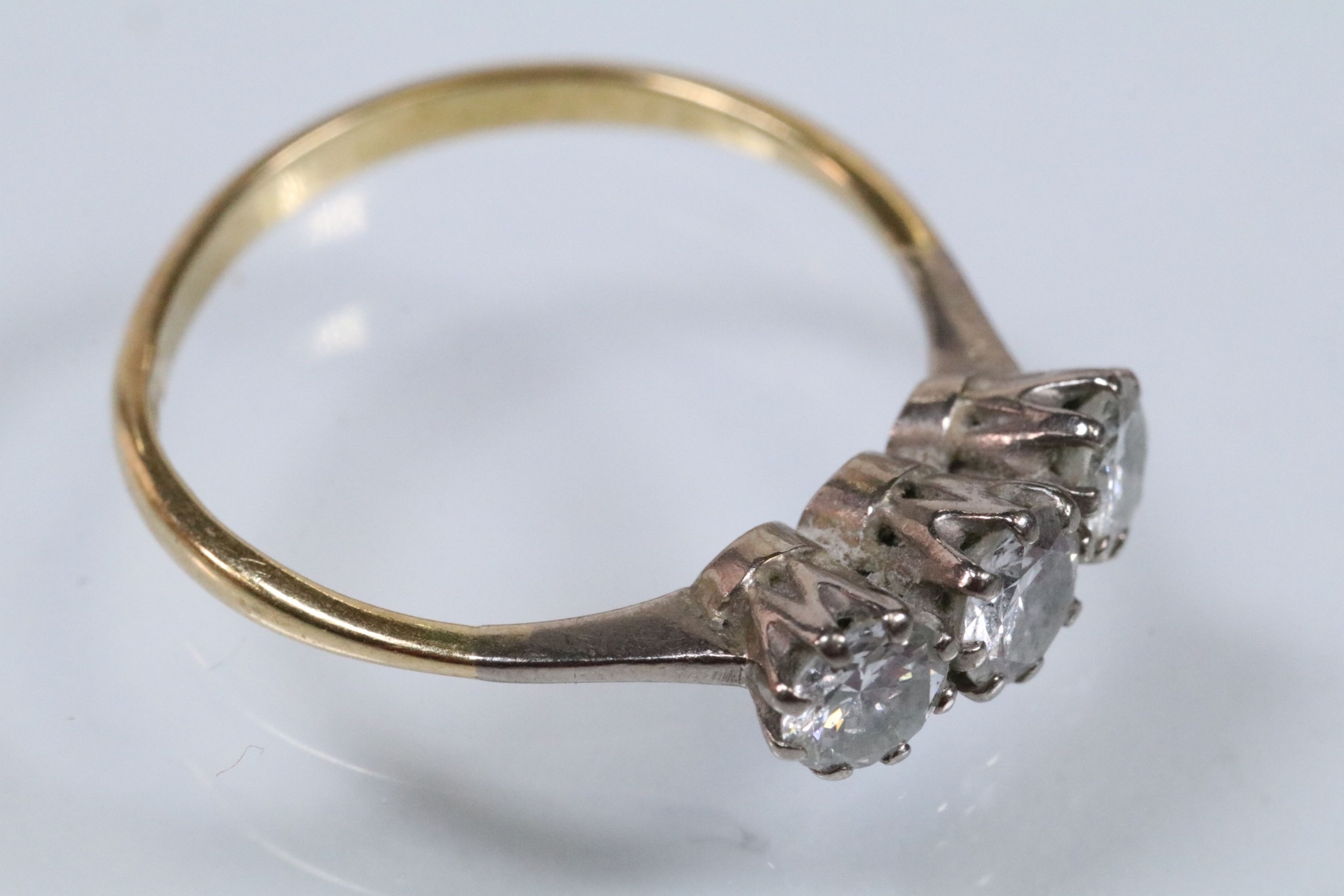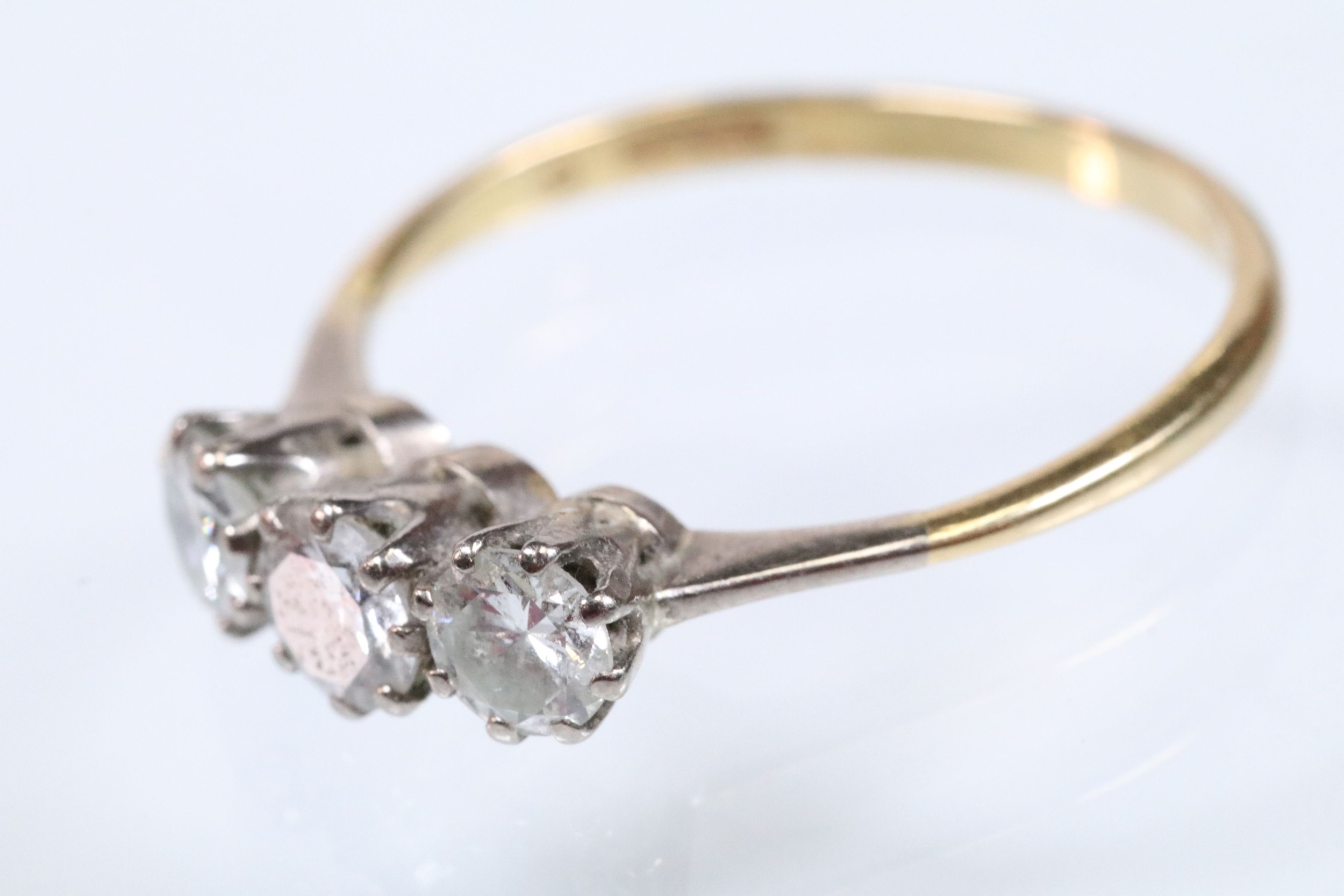 18ct gold and diamond three stone ring. The ring being set with three round brilliant cut diamonds in prong settings. Hallmarked Birmingham 1988. Size Q.5. Diamonds estimated 0.70ct in total. Central diamond estimated 0.30ct.