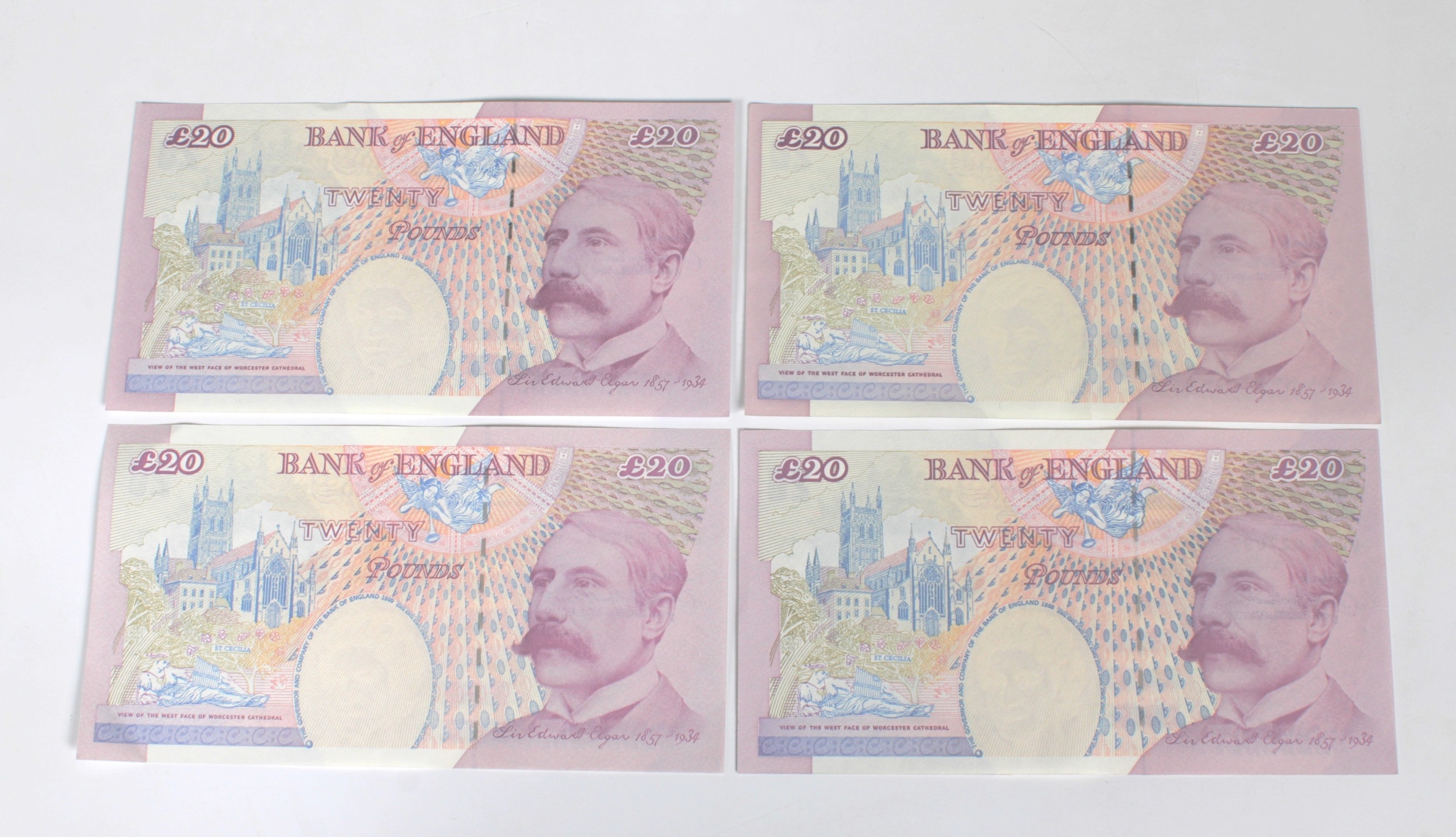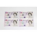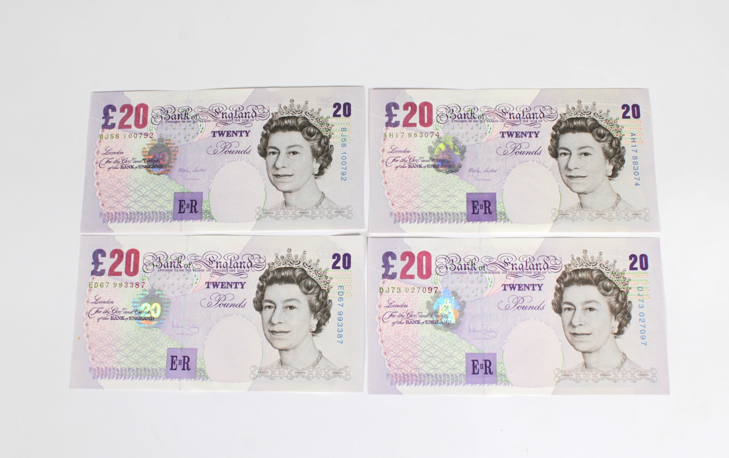 British Banknotes - Twenty Pounds (4) c.1999 & c.2004, Signatory Andrew Bailey, serial numbers AH17 883074, BJ58 100792, DJ73 027097, ED67 993387, extra fine to about uncirculated. (4)